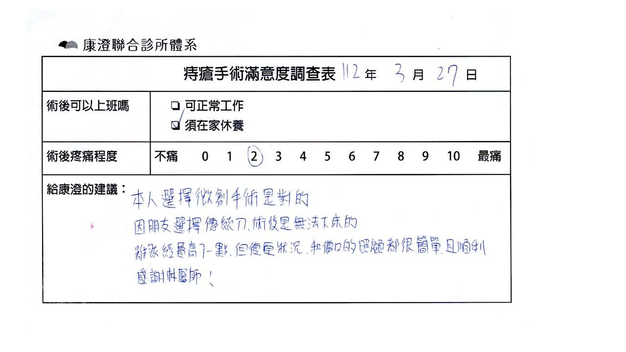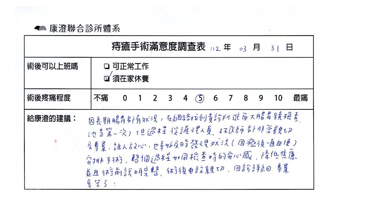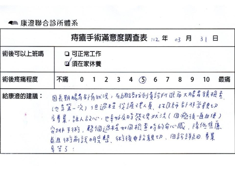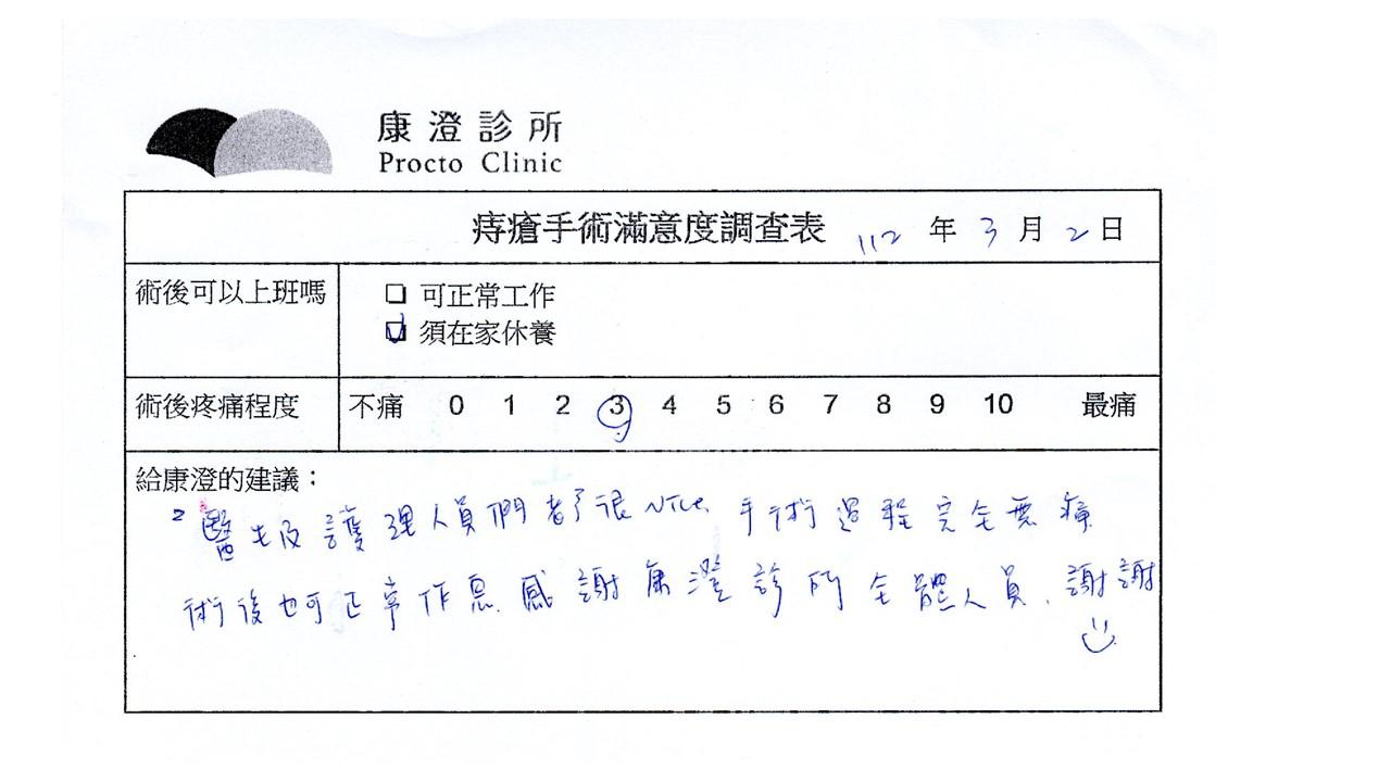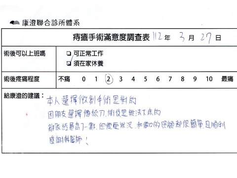 「困擾了20多年的三期內痔,終於在幾天內就解決了,原以為會很疼痛的手術及復原過程,結果真是神奇啊!不會痛呢!長效針應該是有用的,前幾天主要是腫脹,感謝林醫師,以及術後時時電話關心的小護士們,很棒!」
