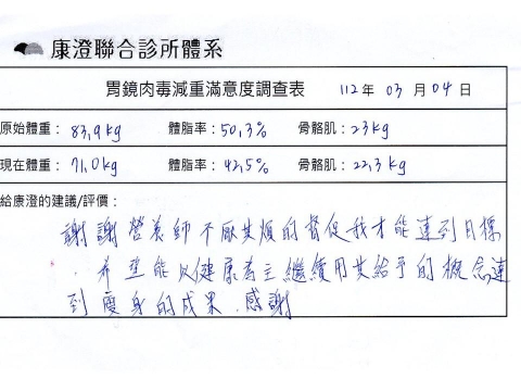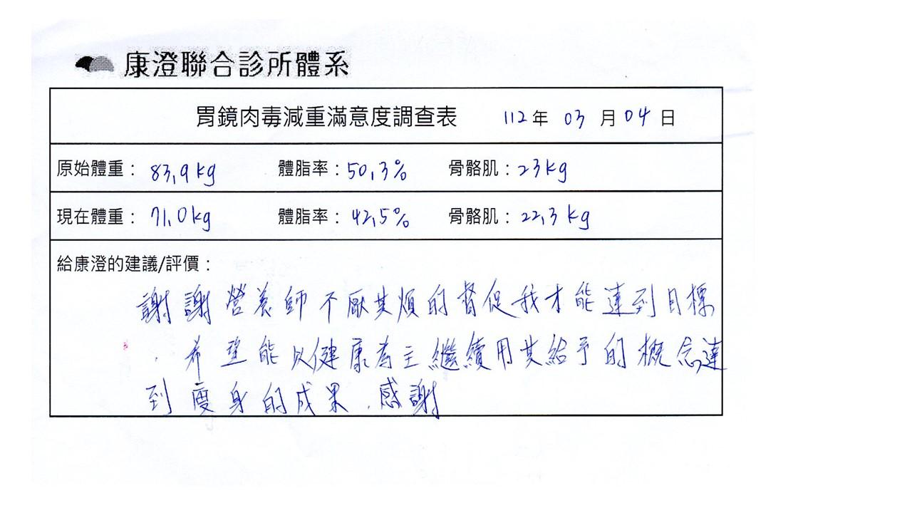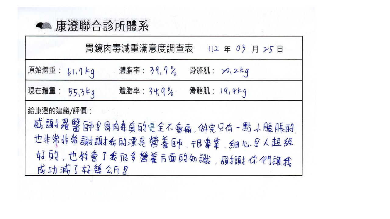 「很開心做了胃肉毒減重療程,讓我體會最幸福不挨餓的減肥方式!瘦了10%體重後,讓體態變美,最重要是身體變健康喔!感謝羅醫師及營養師的提醒及追蹤。」