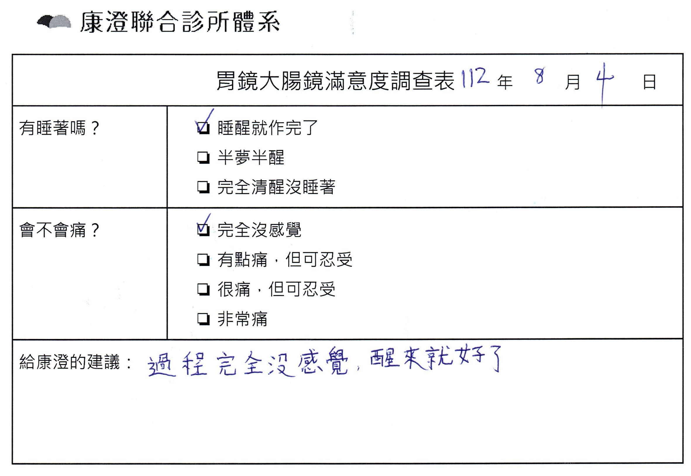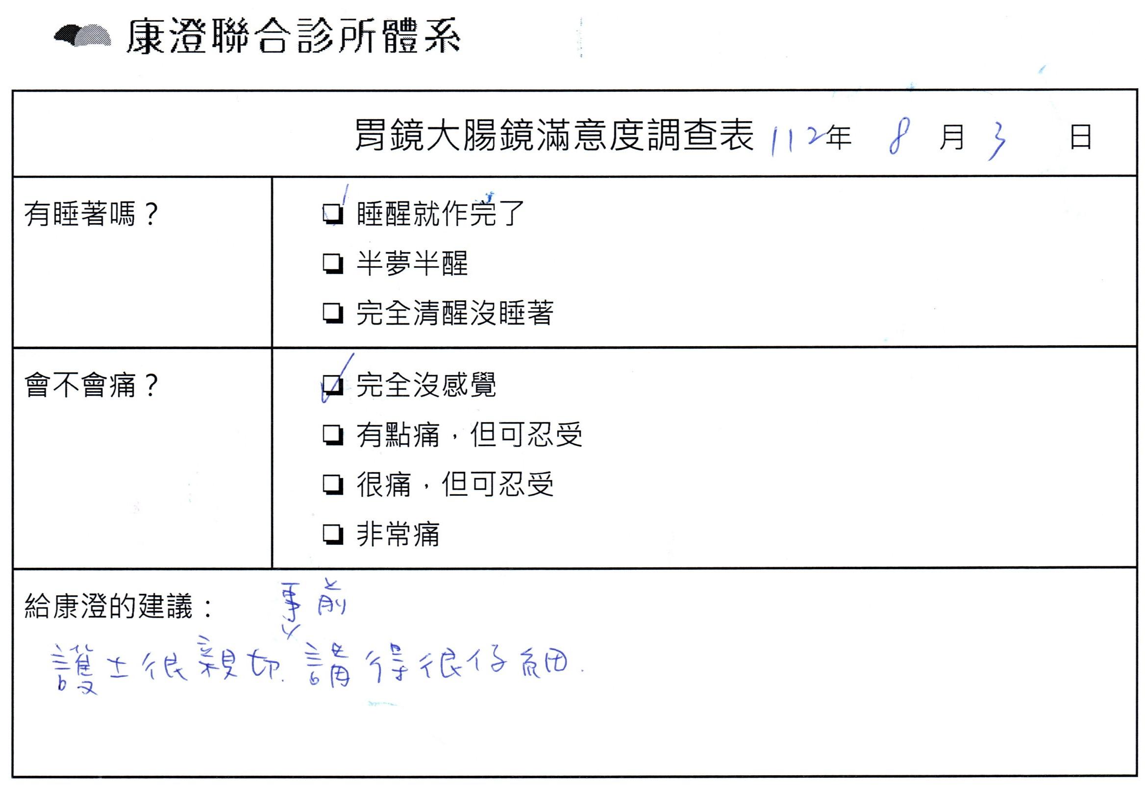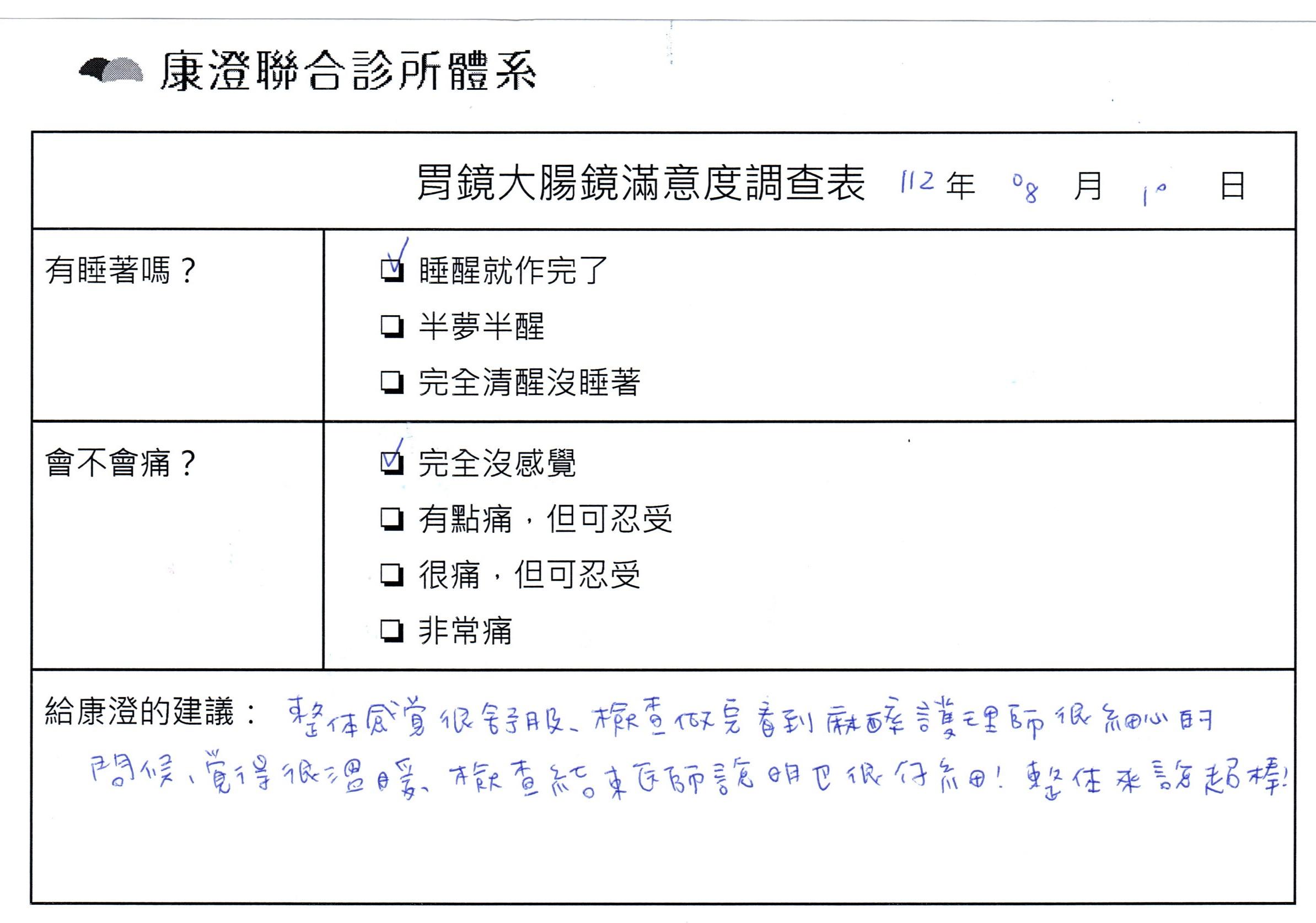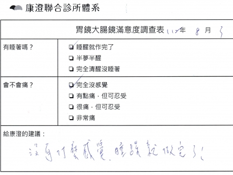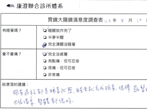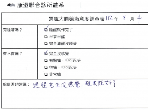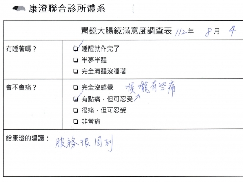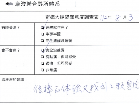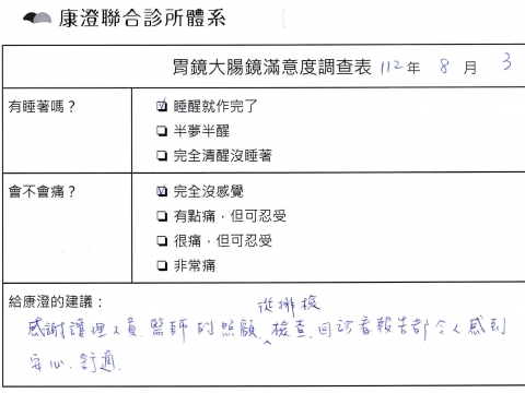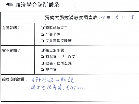 「定期穩定在櫃診所健檢,腸胃鏡的檢查醫療團隊及護理人員後續衛教的處理不輸醫院等級ㆍ專業丶舒適丶安心,整個療程無痛,護理人員親切可降低檢查的緊張感,非常感謝!」
