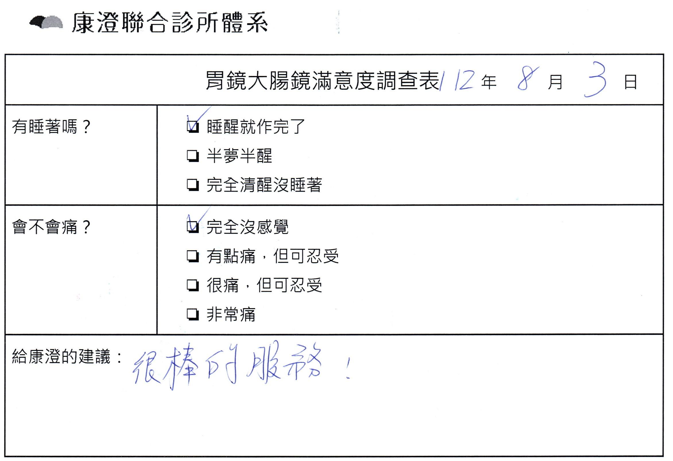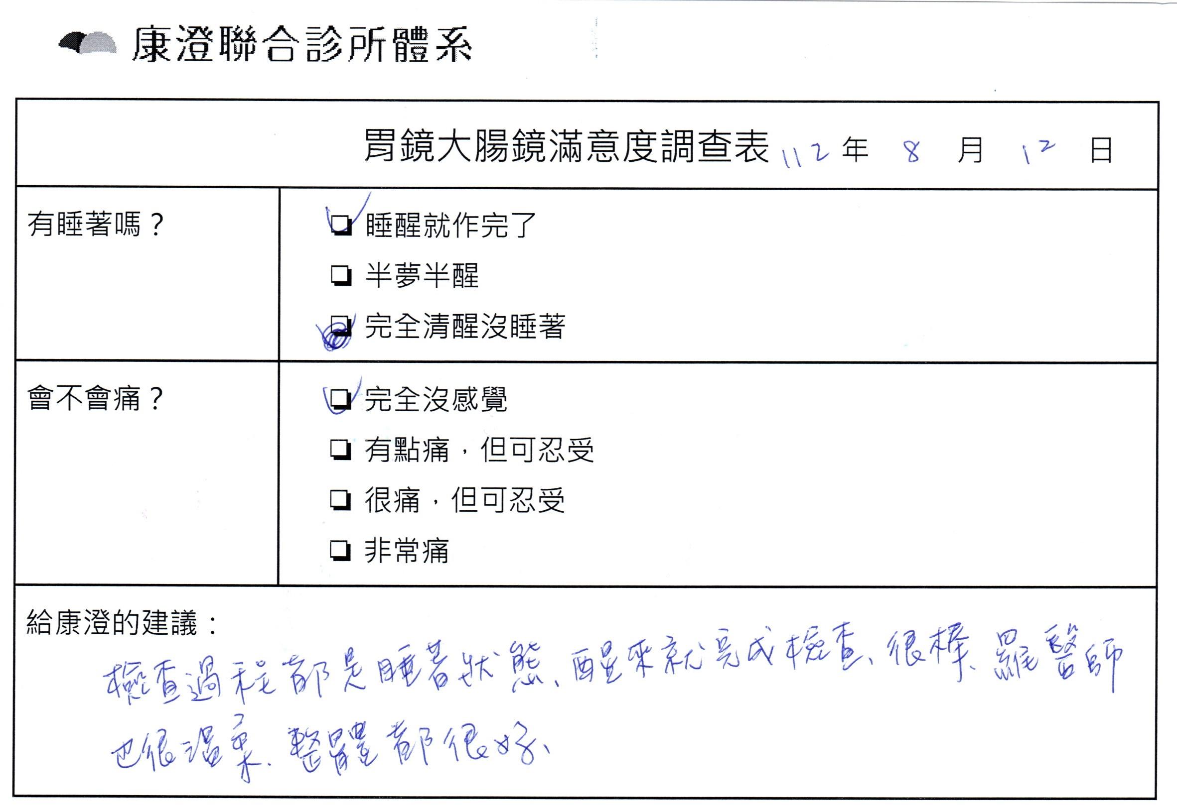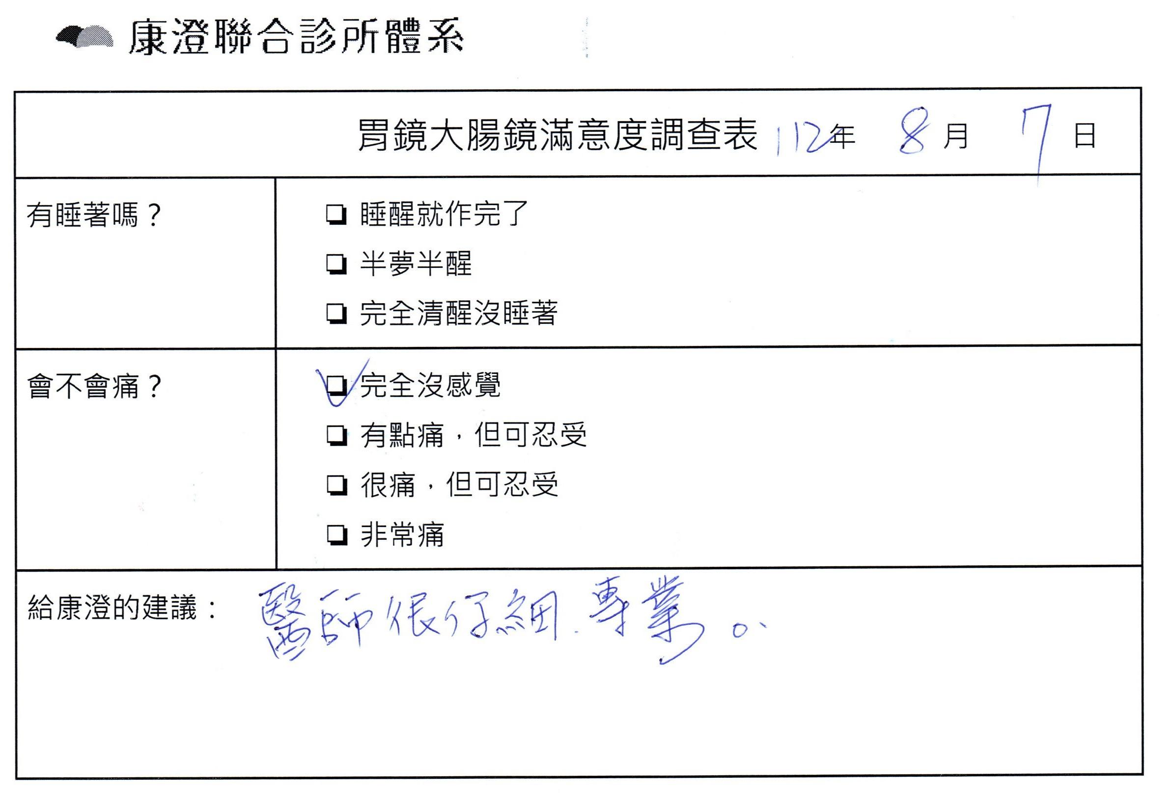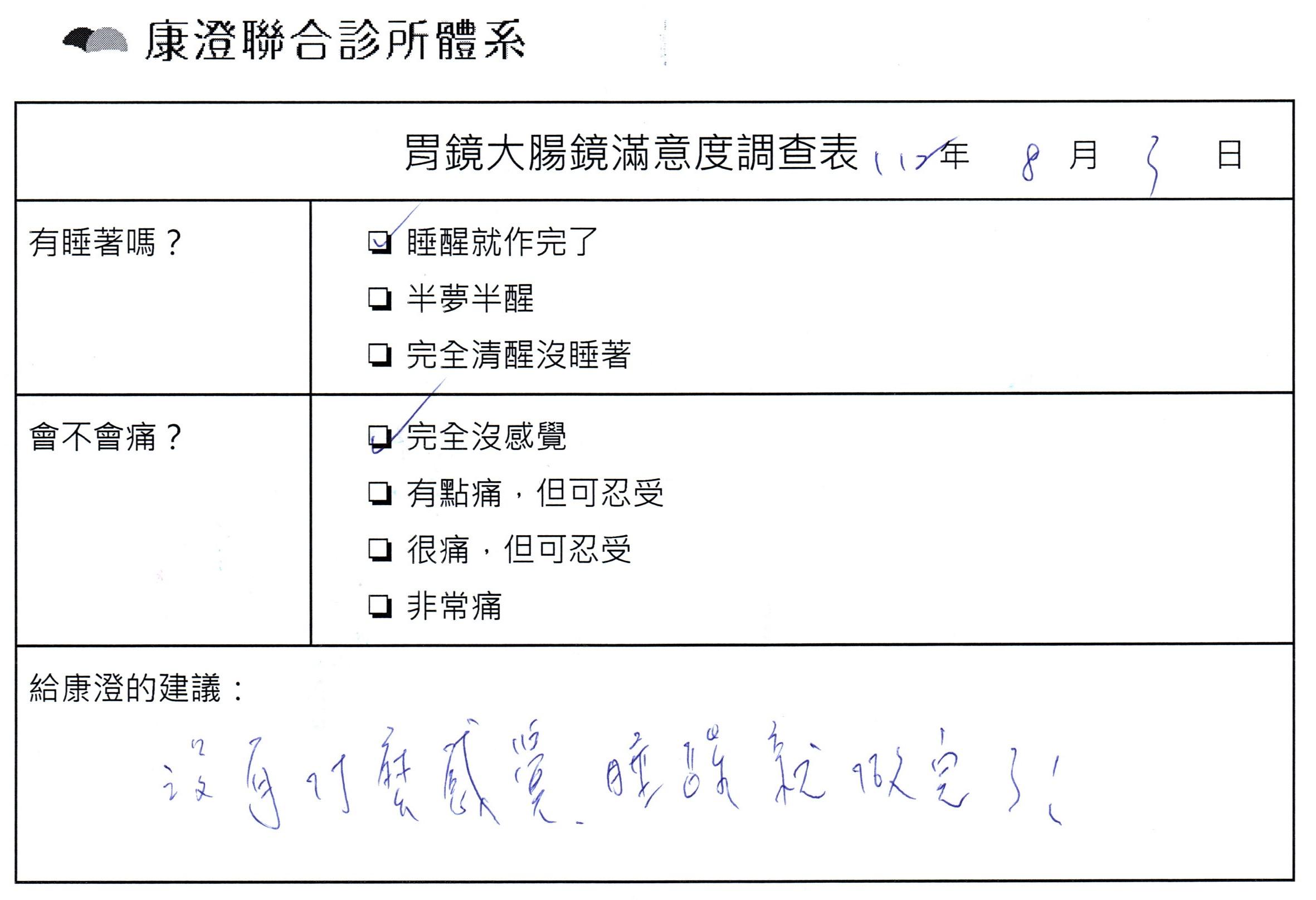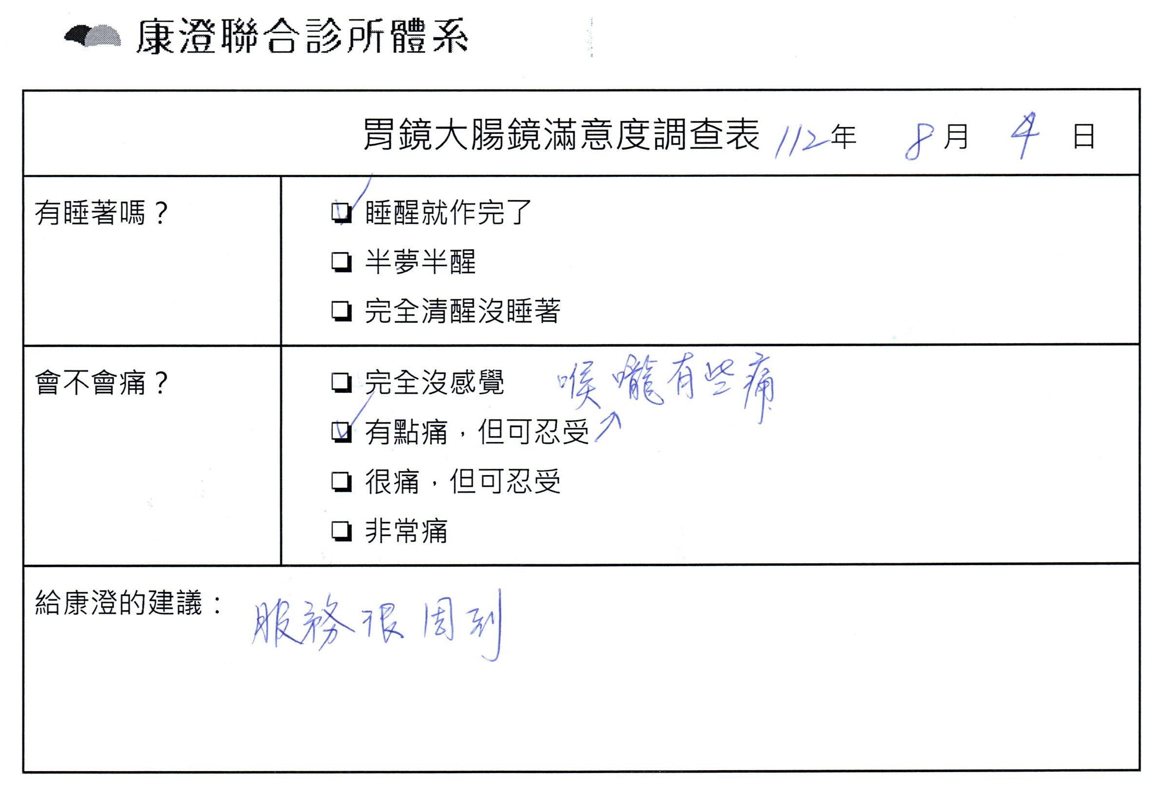 「定期穩定在櫃診所健檢,腸胃鏡的檢查醫療團隊及護理人員後續衛教的處理不輸醫院等級ㆍ專業丶舒適丶安心,整個療程無痛,護理人員親切可降低檢查的緊張感,非常感謝!」