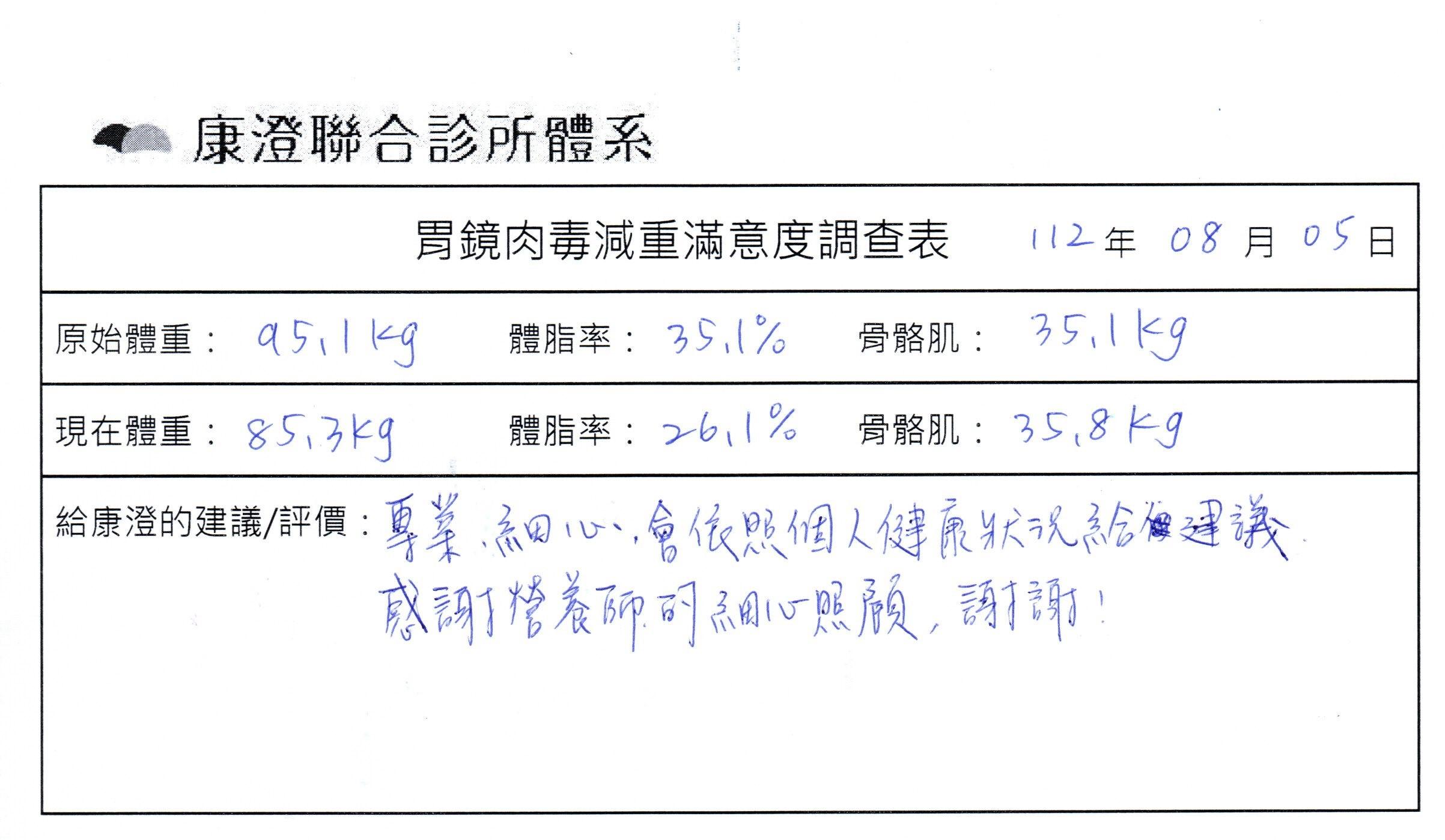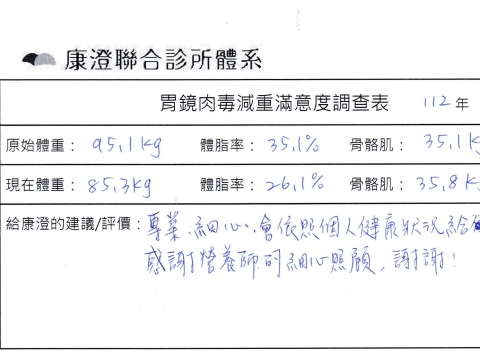 「很開心做了胃肉毒減重療程,讓我體會最幸福不挨餓的減肥方式!瘦了10%體重後,讓體態變美,最重要是身體變健康喔!感謝羅醫師及營養師的提醒及追蹤。」
