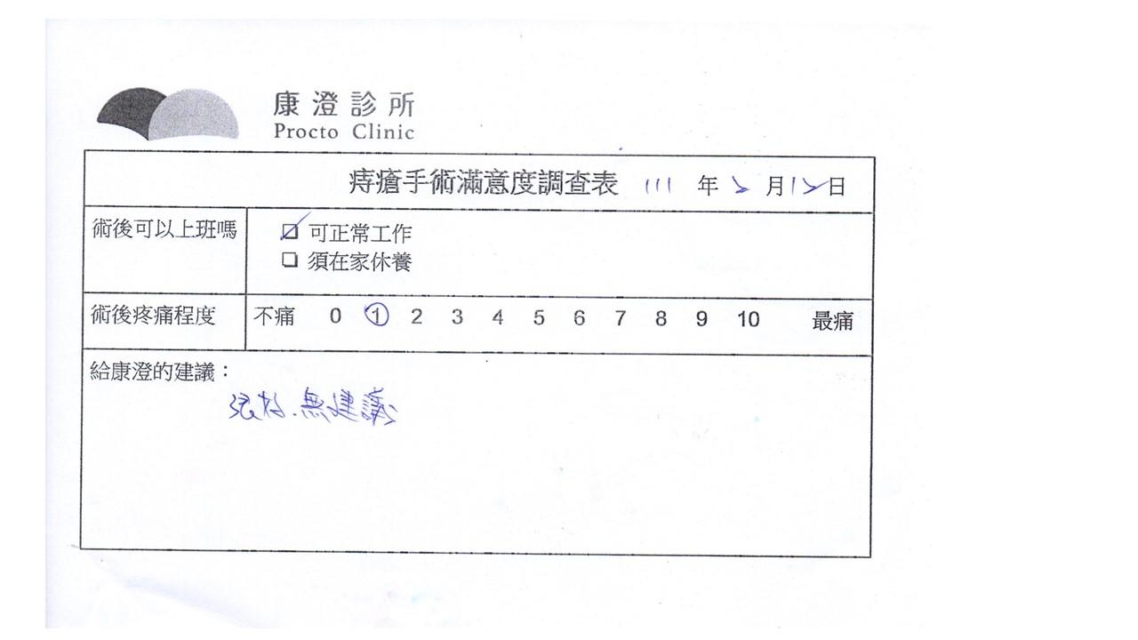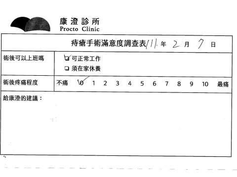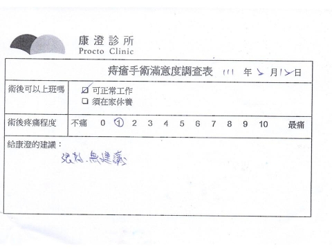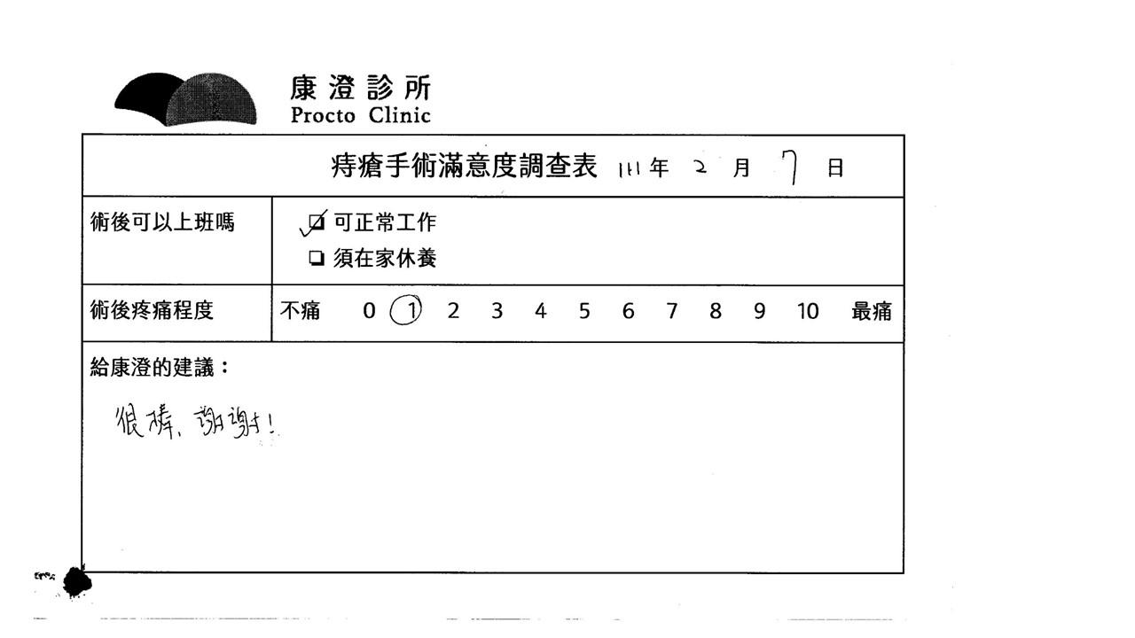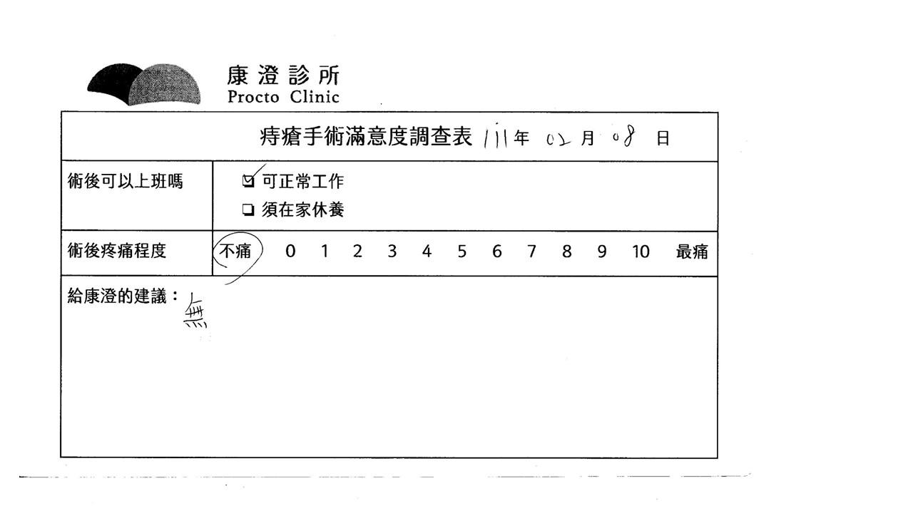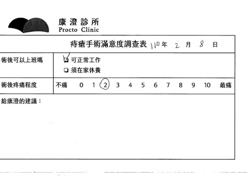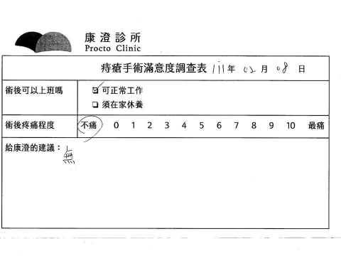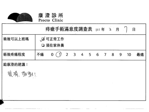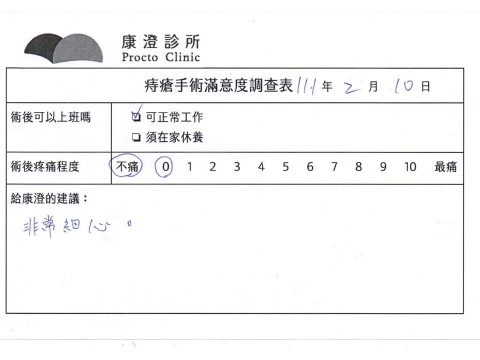 「困擾了20多年的三期內痔,終於在幾天內就解決了,原以為會很疼痛的手術及復原過程,結果真是神奇啊!不會痛呢!長效針應該是有用的,前幾天主要是腫脹,感謝林醫師,以及術後時時電話關心的小護士們,很棒!」