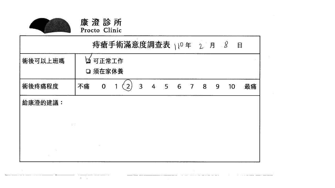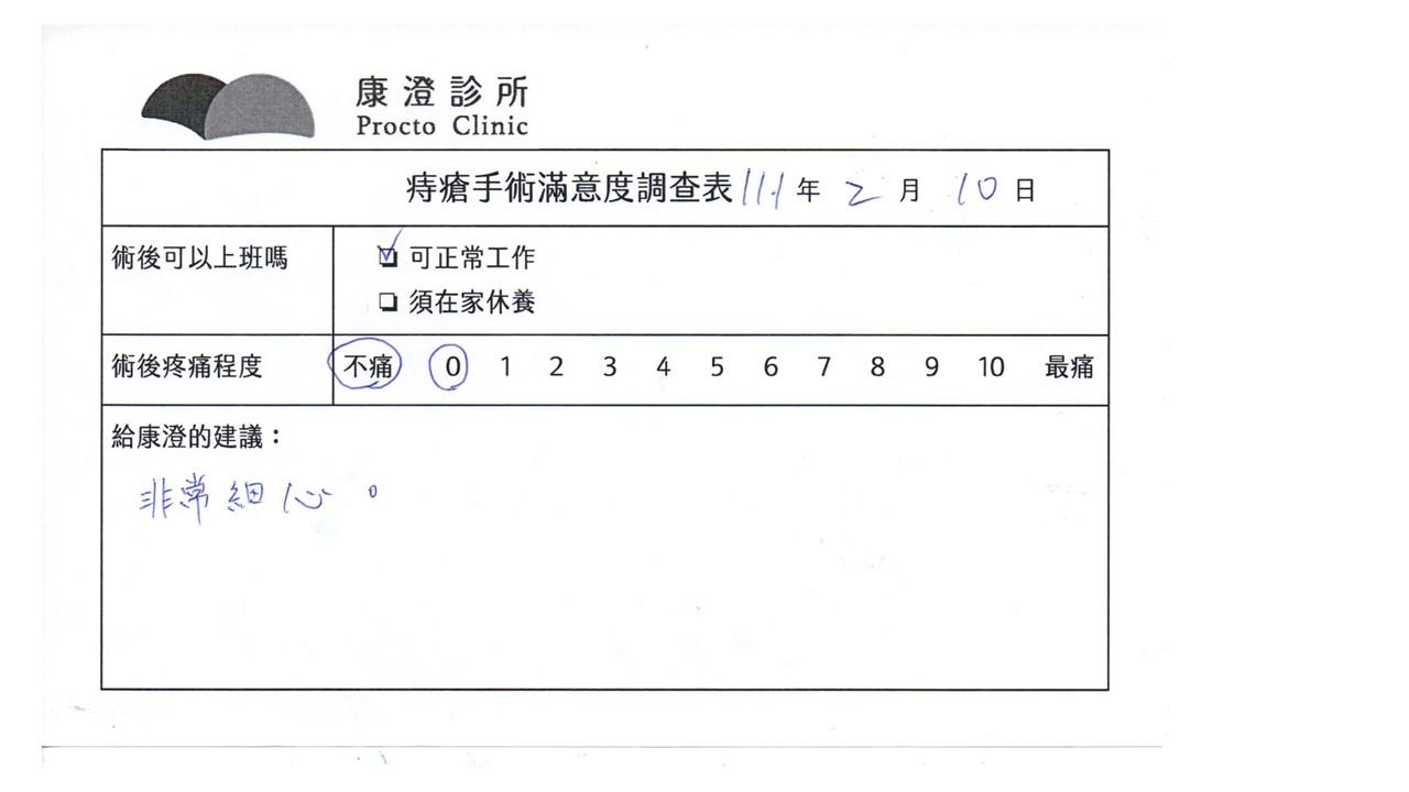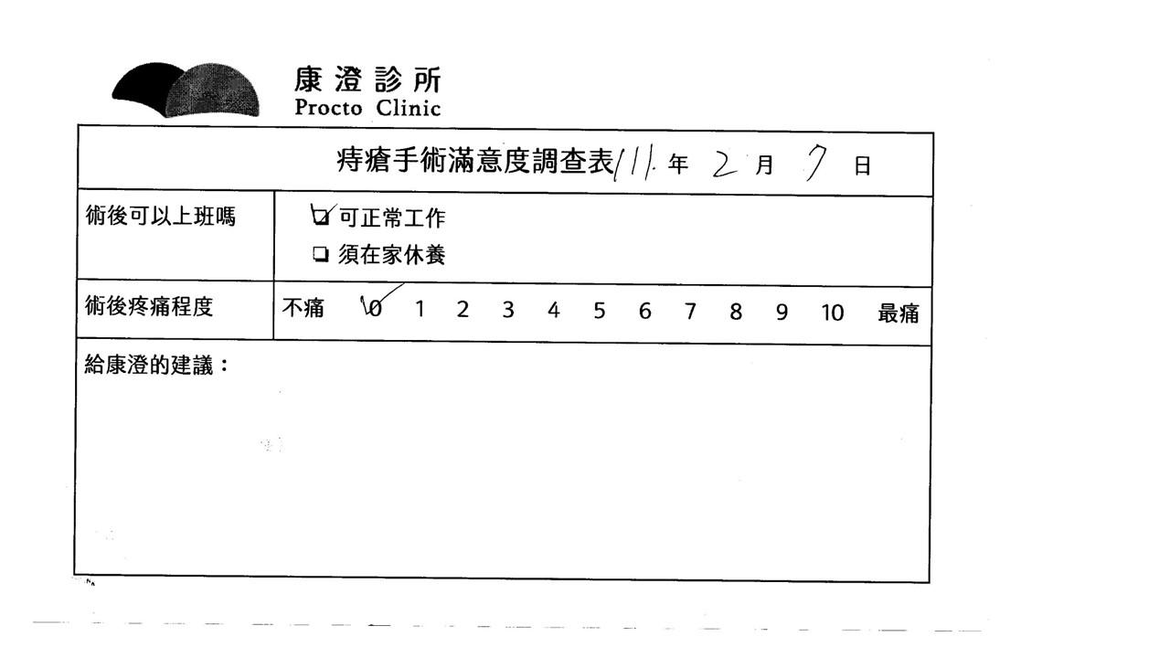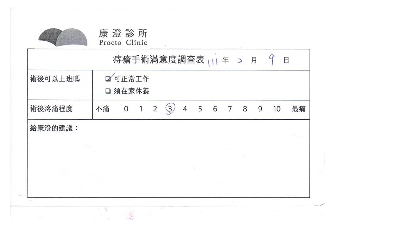 「困擾了20多年的三期內痔,終於在幾天內就解決了,原以為會很疼痛的手術及復原過程,結果真是神奇啊!不會痛呢!長效針應該是有用的,前幾天主要是腫脹,感謝林醫師,以及術後時時電話關心的小護士們,很棒!」