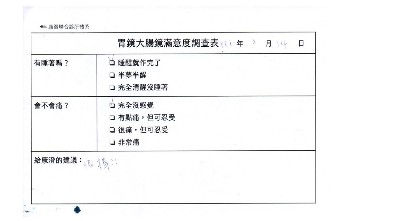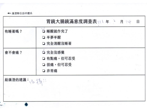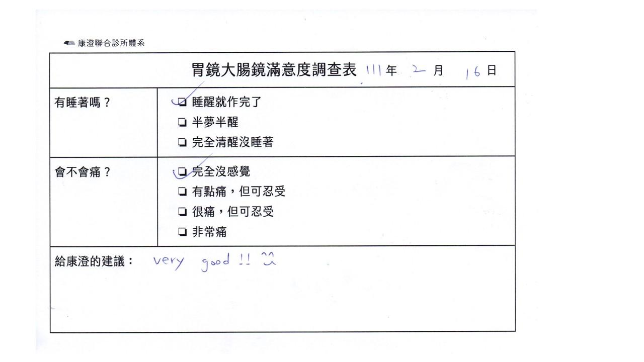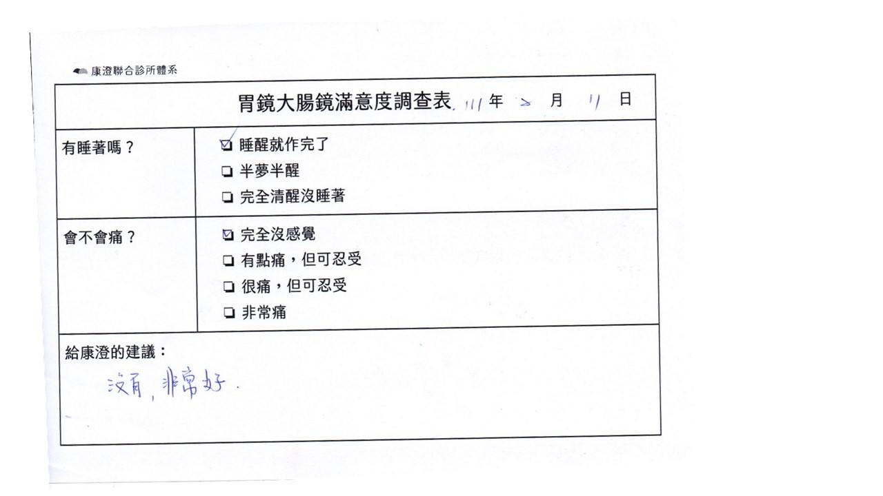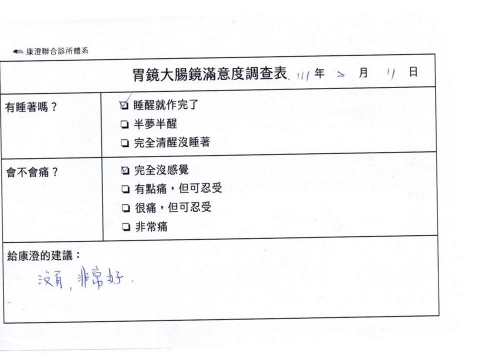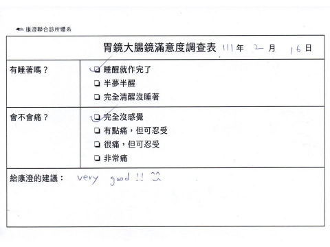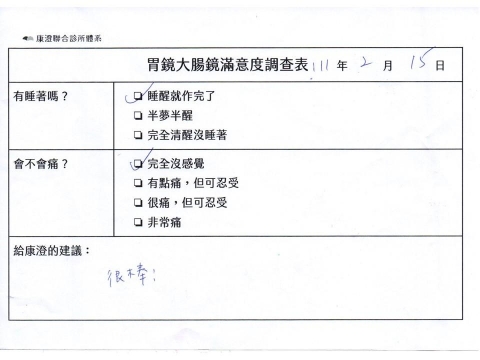 「定期穩定在櫃診所健檢,腸胃鏡的檢查醫療團隊及護理人員後續衛教的處理不輸醫院等級ㆍ專業丶舒適丶安心,整個療程無痛,護理人員親切可降低檢查的緊張感,非常感謝!」