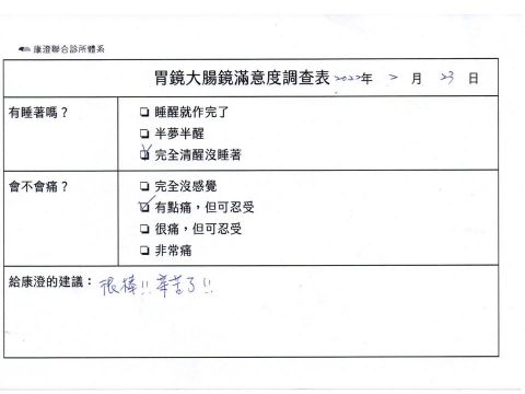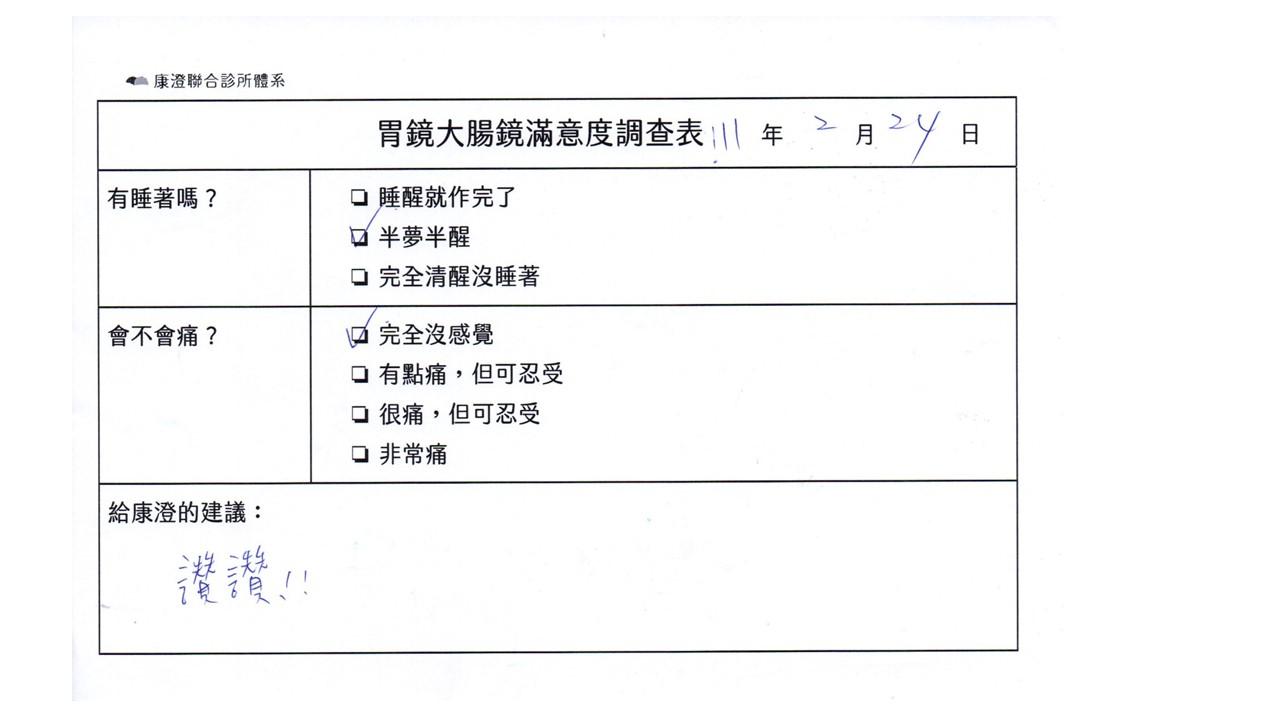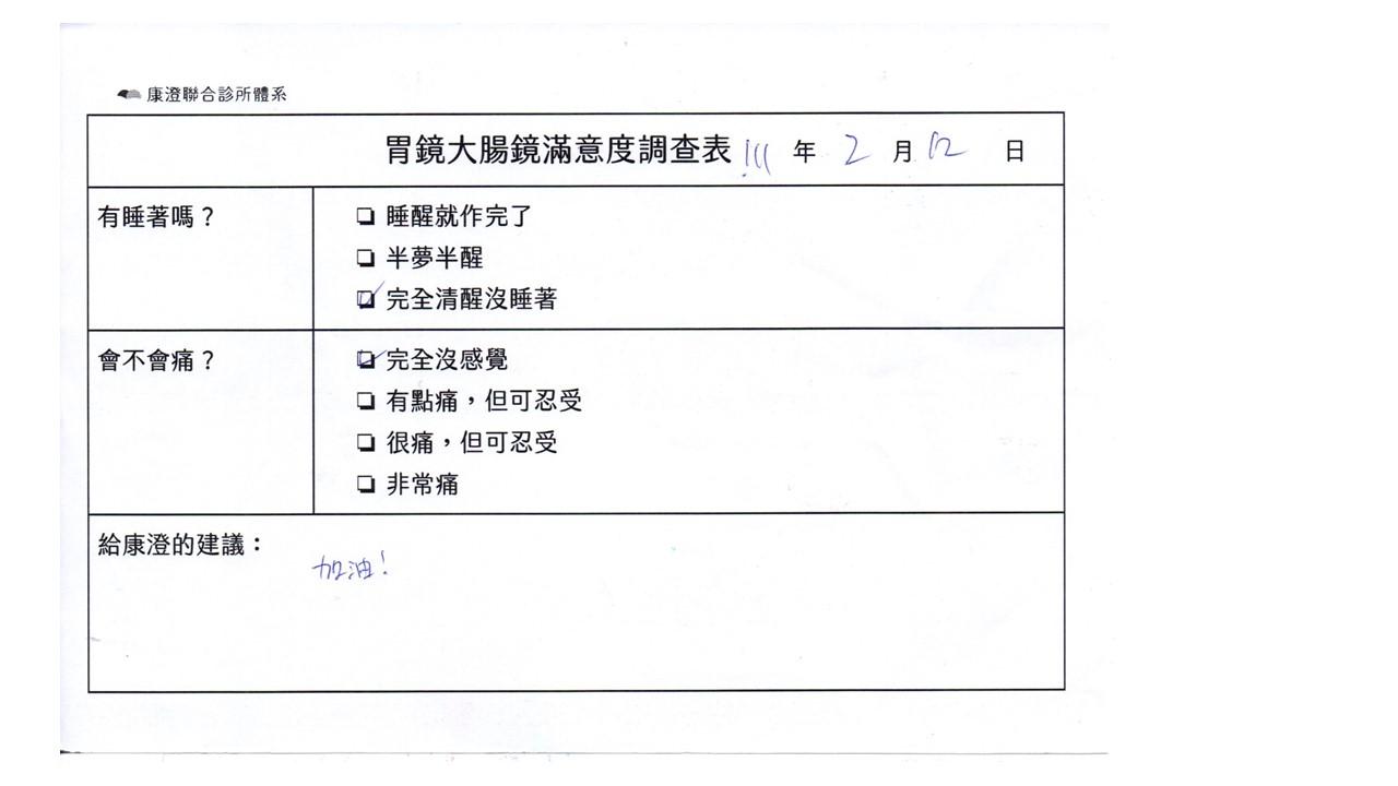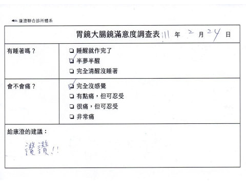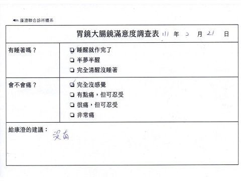「定期穩定在櫃診所健檢,腸胃鏡的檢查醫療團隊及護理人員後續衛教的處理不輸醫院等級ㆍ專業丶舒適丶安心,整個療程無痛,護理人員親切可降低檢查的緊張感,非常感謝!」