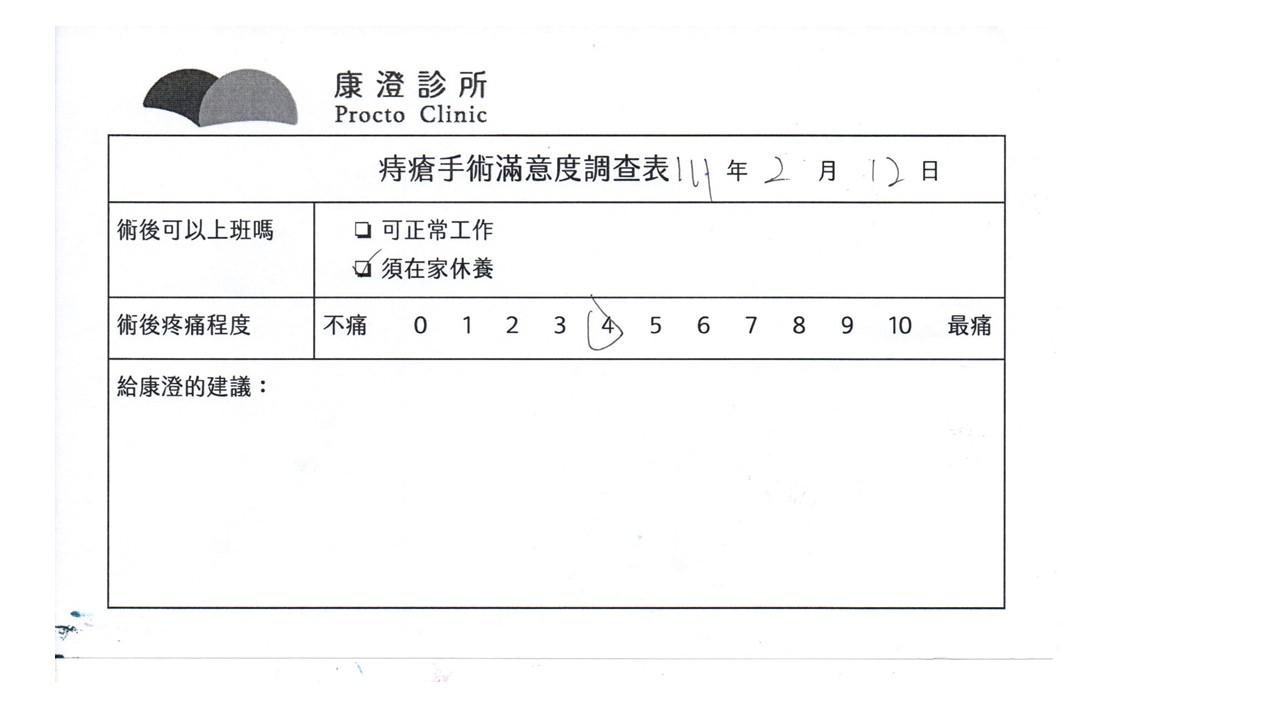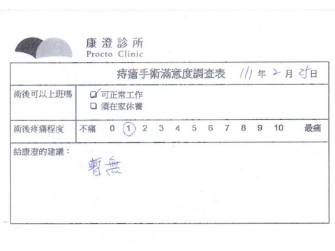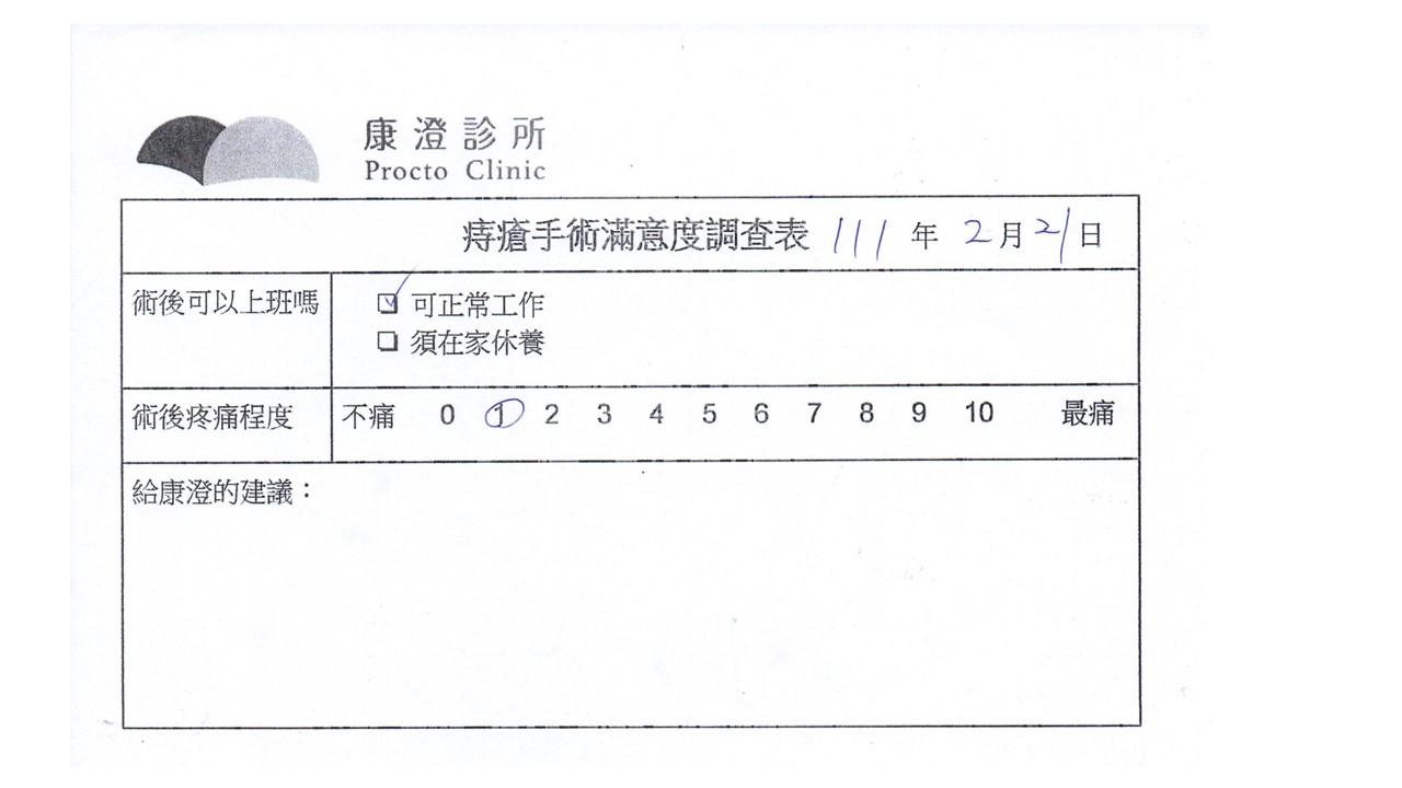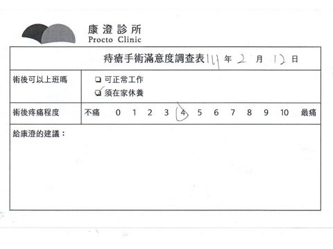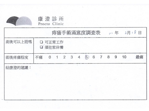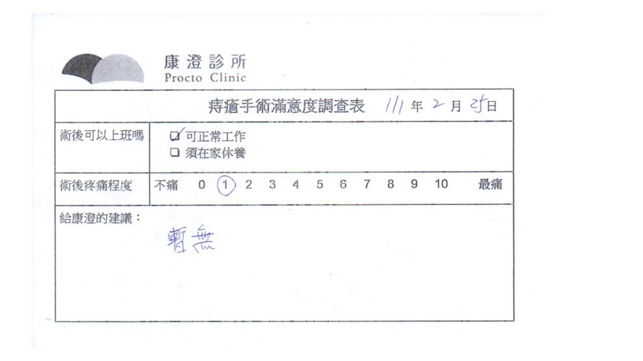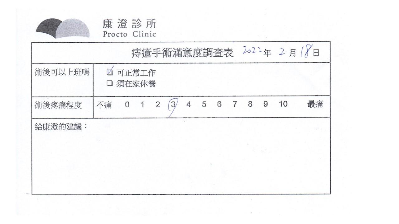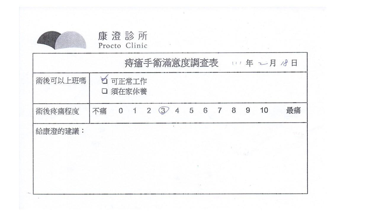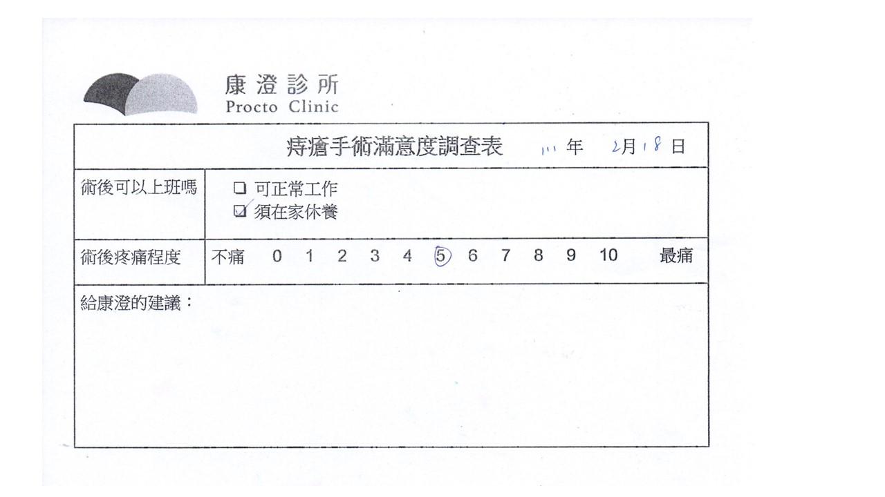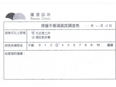 「困擾了20多年的三期內痔,終於在幾天內就解決了,原以為會很疼痛的手術及復原過程,結果真是神奇啊!不會痛呢!長效針應該是有用的,前幾天主要是腫脹,感謝林醫師,以及術後時時電話關心的小護士們,很棒!」
