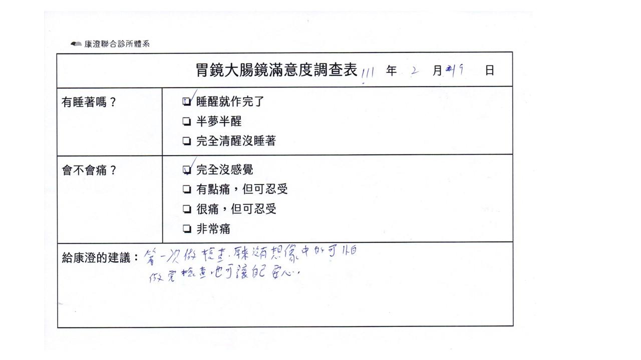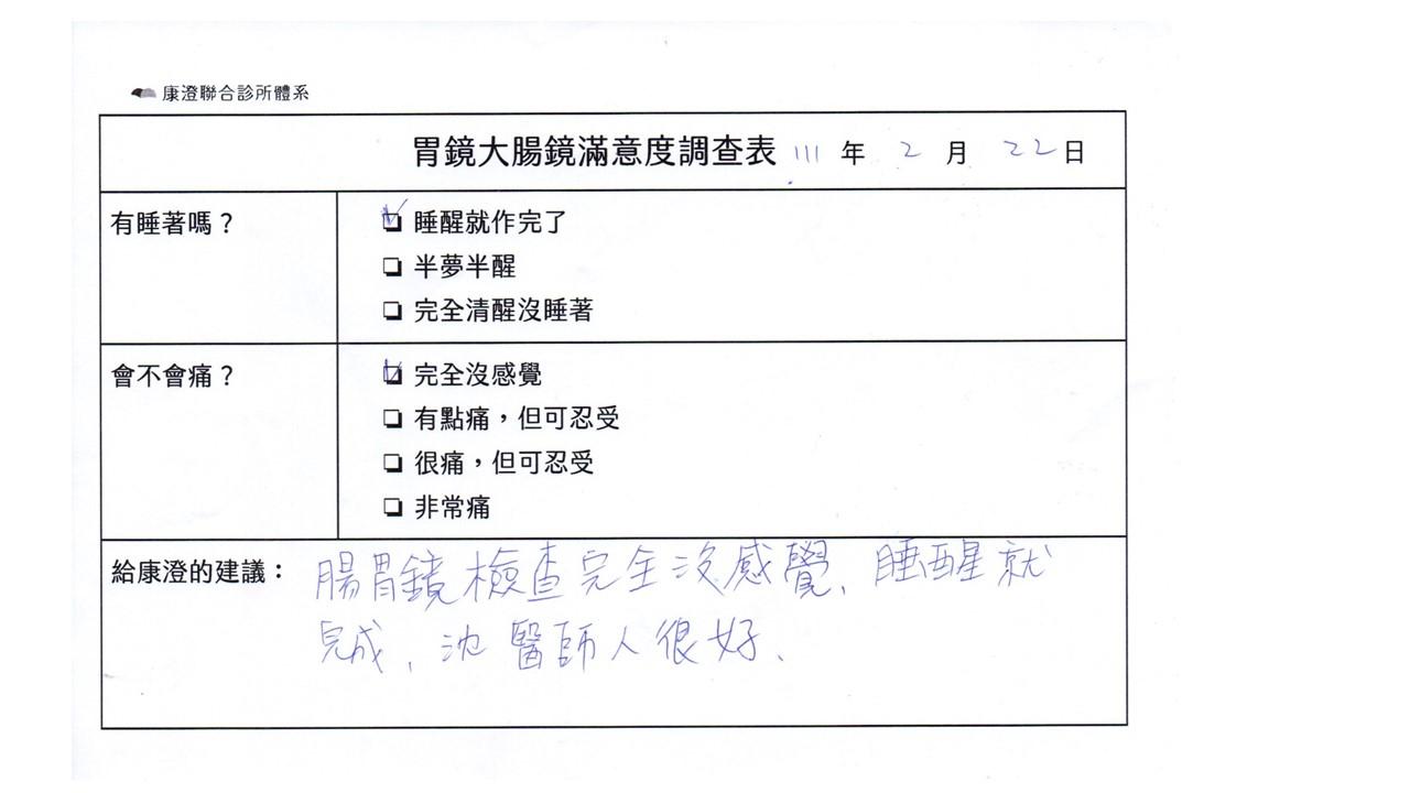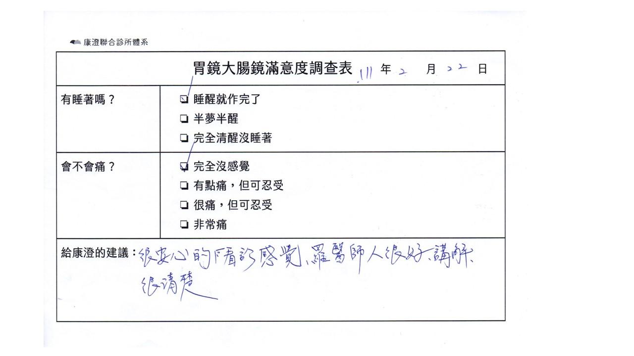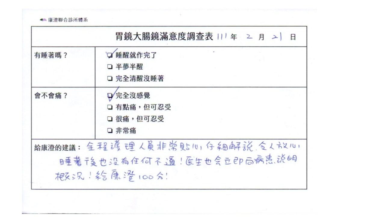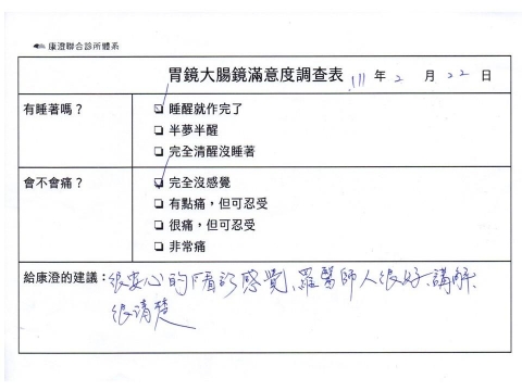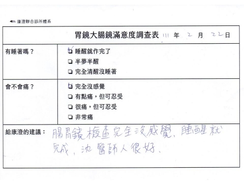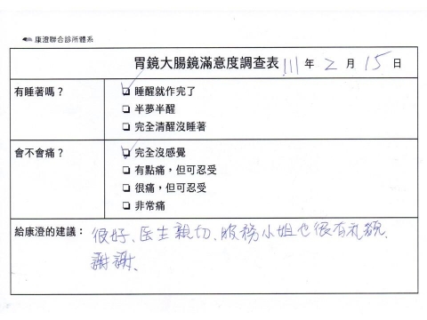 「定期穩定在櫃診所健檢,腸胃鏡的檢查醫療團隊及護理人員後續衛教的處理不輸醫院等級ㆍ專業丶舒適丶安心,整個療程無痛,護理人員親切可降低檢查的緊張感,非常感謝!」