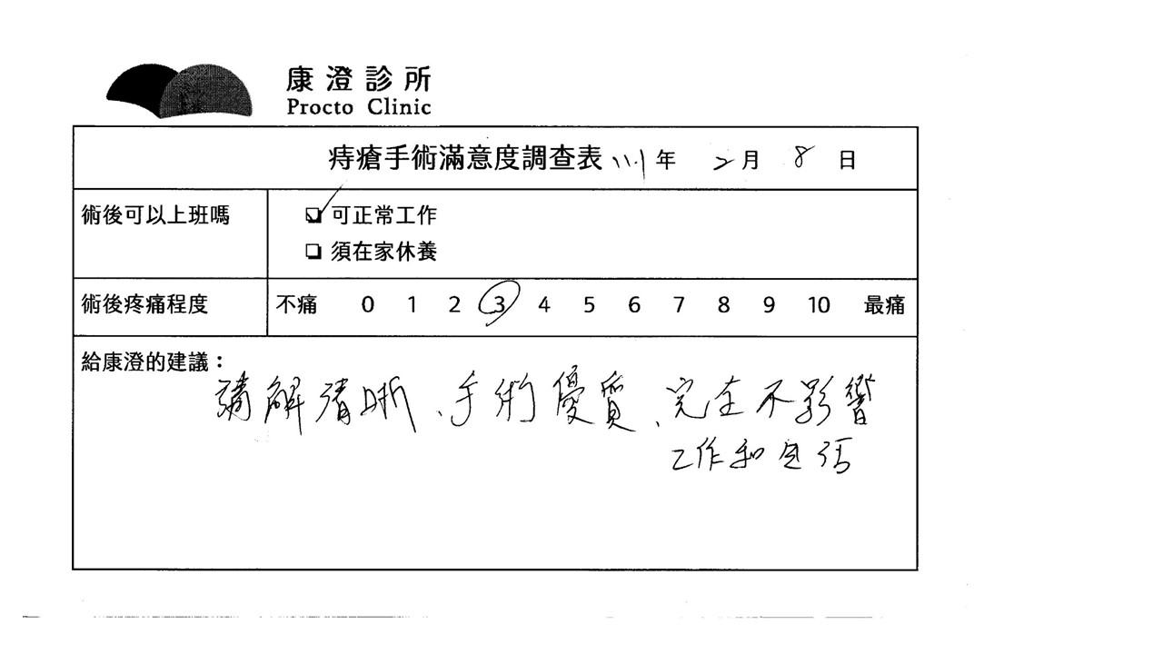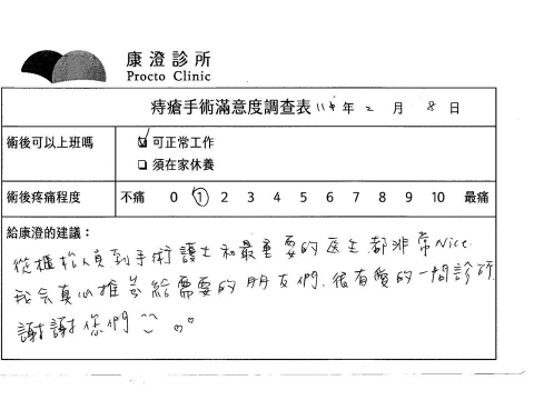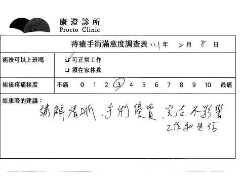「困擾了20多年的三期內痔,終於在幾天內就解決了,原以為會很疼痛的手術及復原過程,結果真是神奇啊!不會痛呢!長效針應該是有用的,前幾天主要是腫脹,感謝林醫師,以及術後時時電話關心的小護士們,很棒!」