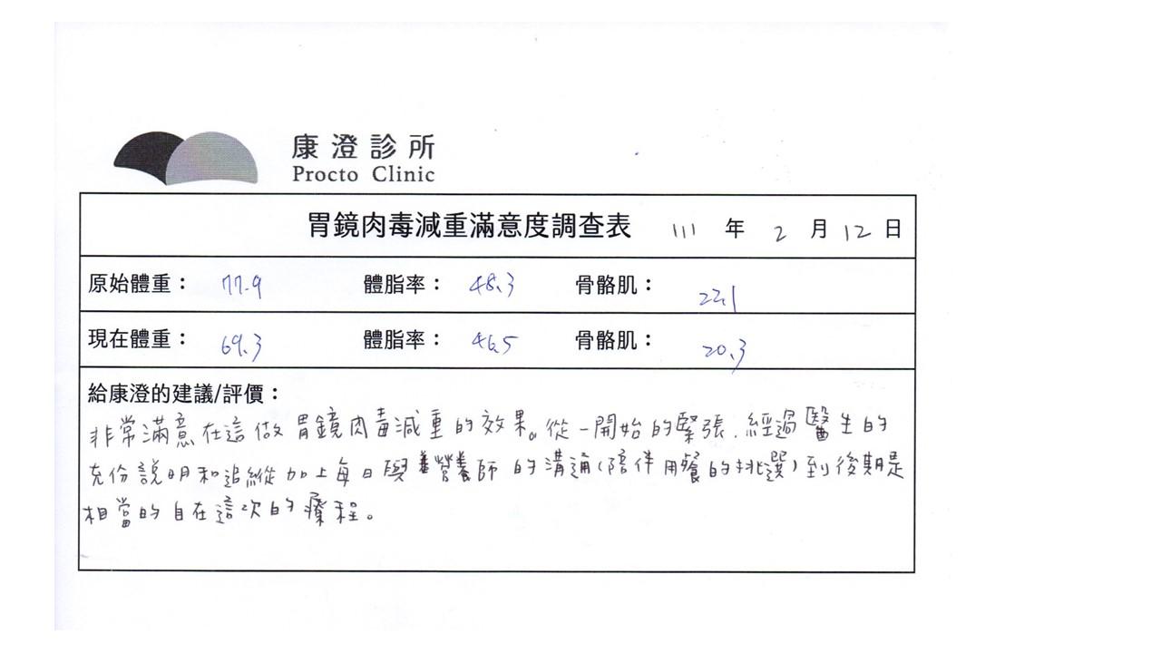「很開心做了胃肉毒減重療程,讓我體會最幸福不挨餓的減肥方式!瘦了10%體重後,讓體態變美,最重要是身體變健康喔!感謝羅醫師及營養師的提醒及追蹤。」