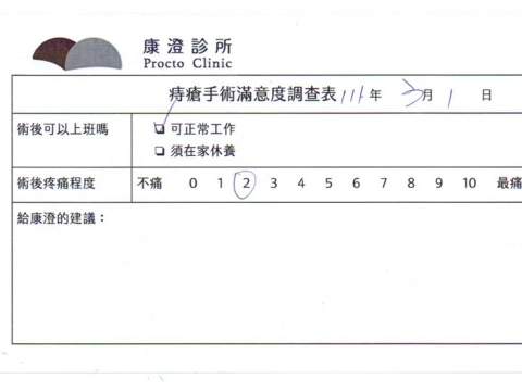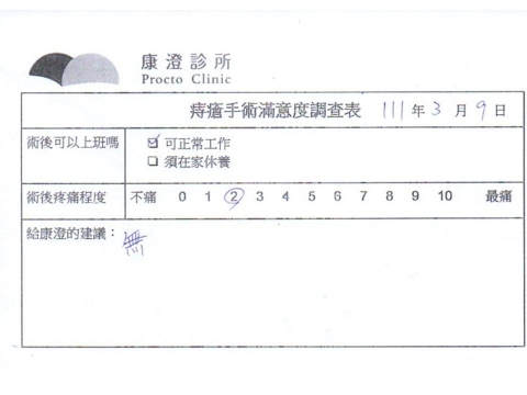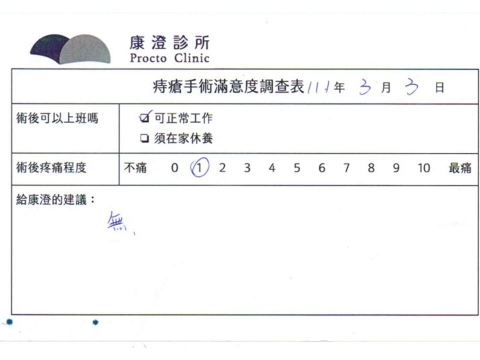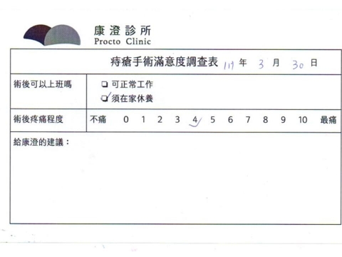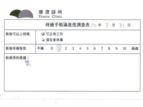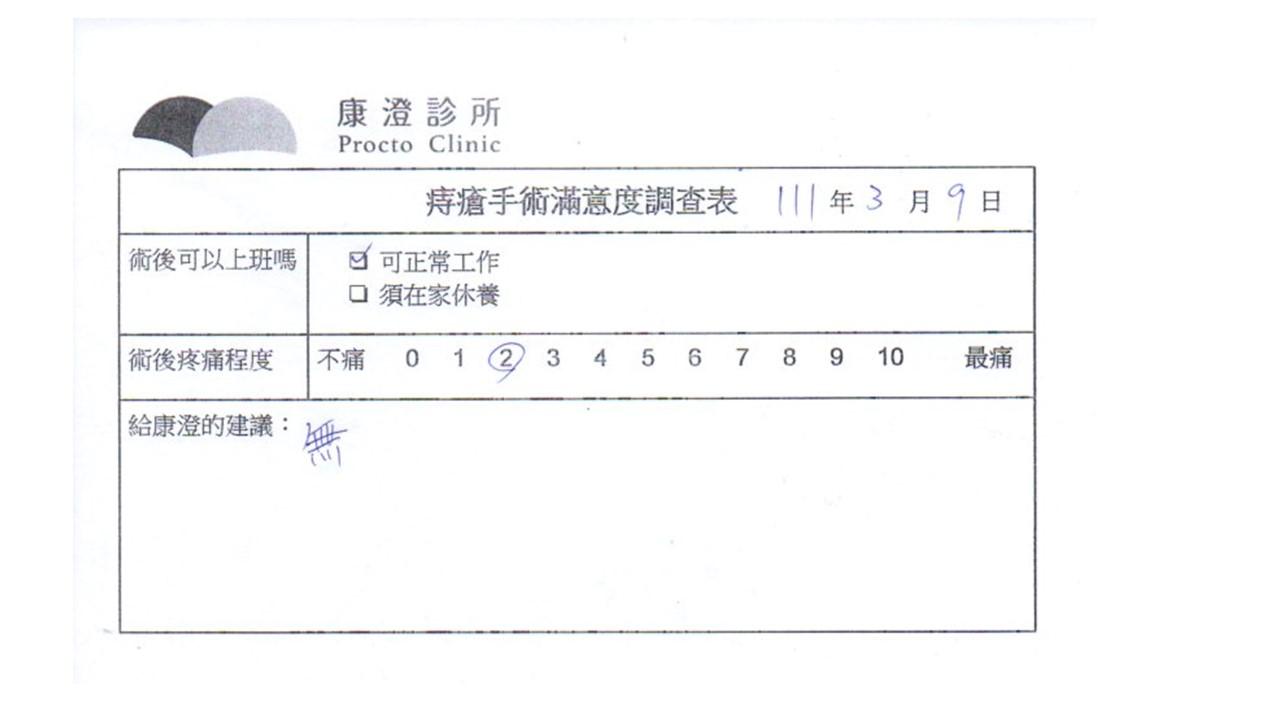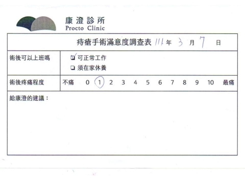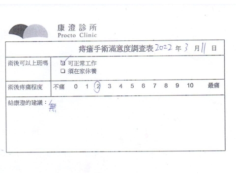 「困擾了20多年的三期內痔,終於在幾天內就解決了,原以為會很疼痛的手術及復原過程,結果真是神奇啊!不會痛呢!長效針應該是有用的,前幾天主要是腫脹,感謝林醫師,以及術後時時電話關心的小護士們,很棒!」