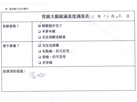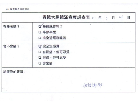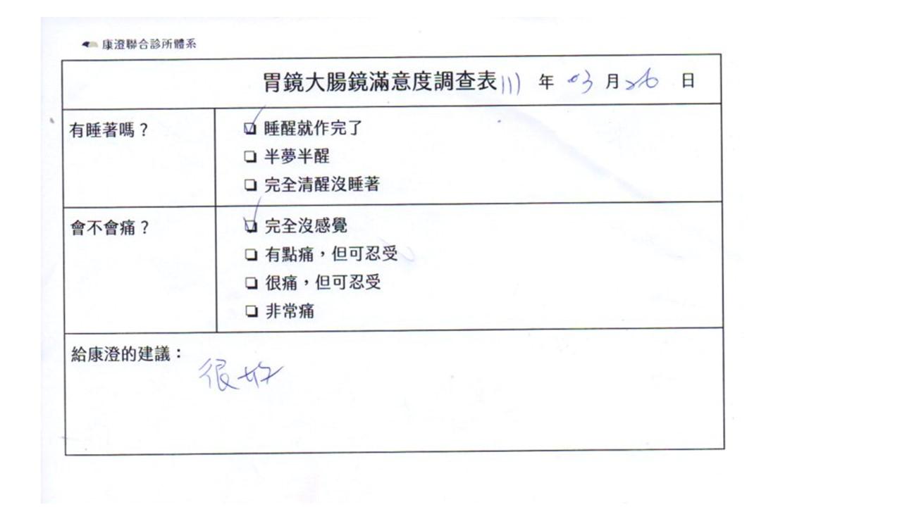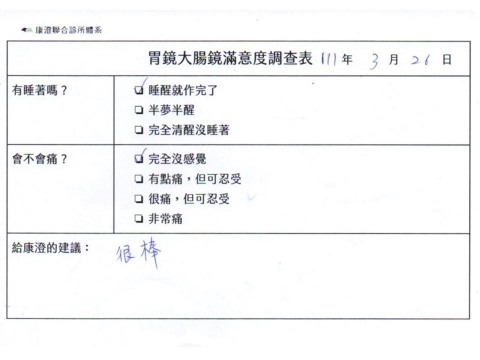 「定期穩定在櫃診所健檢,腸胃鏡的檢查醫療團隊及護理人員後續衛教的處理不輸醫院等級ㆍ專業丶舒適丶安心,整個療程無痛,護理人員親切可降低檢查的緊張感,非常感謝!」