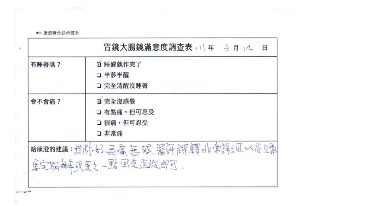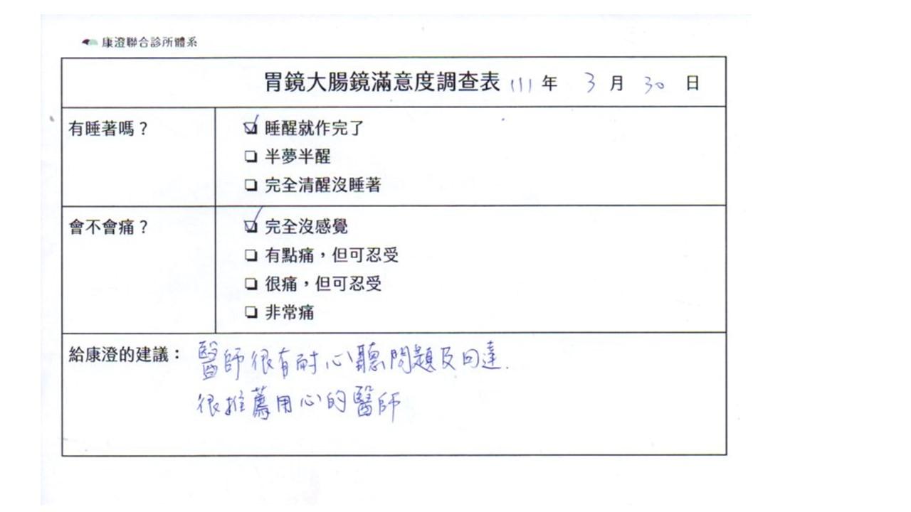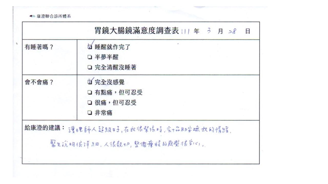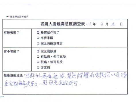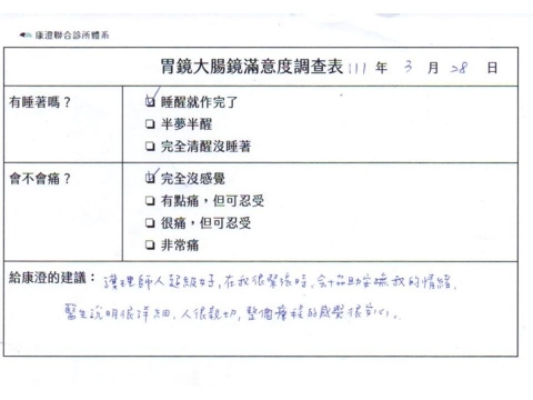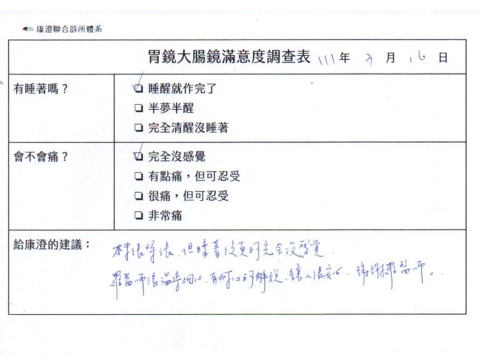 「定期穩定在櫃診所健檢,腸胃鏡的檢查醫療團隊及護理人員後續衛教的處理不輸醫院等級ㆍ專業丶舒適丶安心,整個療程無痛,護理人員親切可降低檢查的緊張感,非常感謝!」