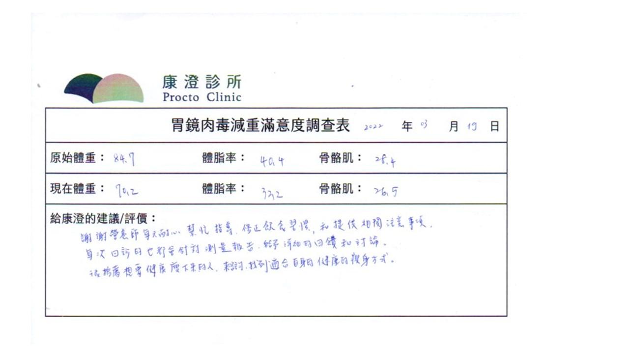 「很開心做了胃肉毒減重療程,讓我體會最幸福不挨餓的減肥方式!瘦了10%體重後,讓體態變美,最重要是身體變健康喔!感謝羅醫師及營養師的提醒及追蹤。」