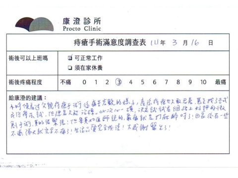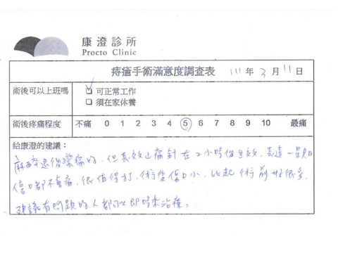 「困擾了20多年的三期內痔,終於在幾天內就解決了,原以為會很疼痛的手術及復原過程,結果真是神奇啊!不會痛呢!長效針應該是有用的,前幾天主要是腫脹,感謝林醫師,以及術後時時電話關心的小護士們,很棒!」