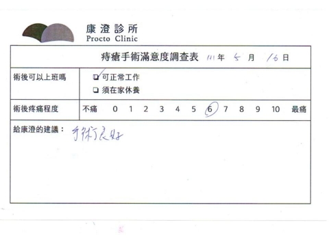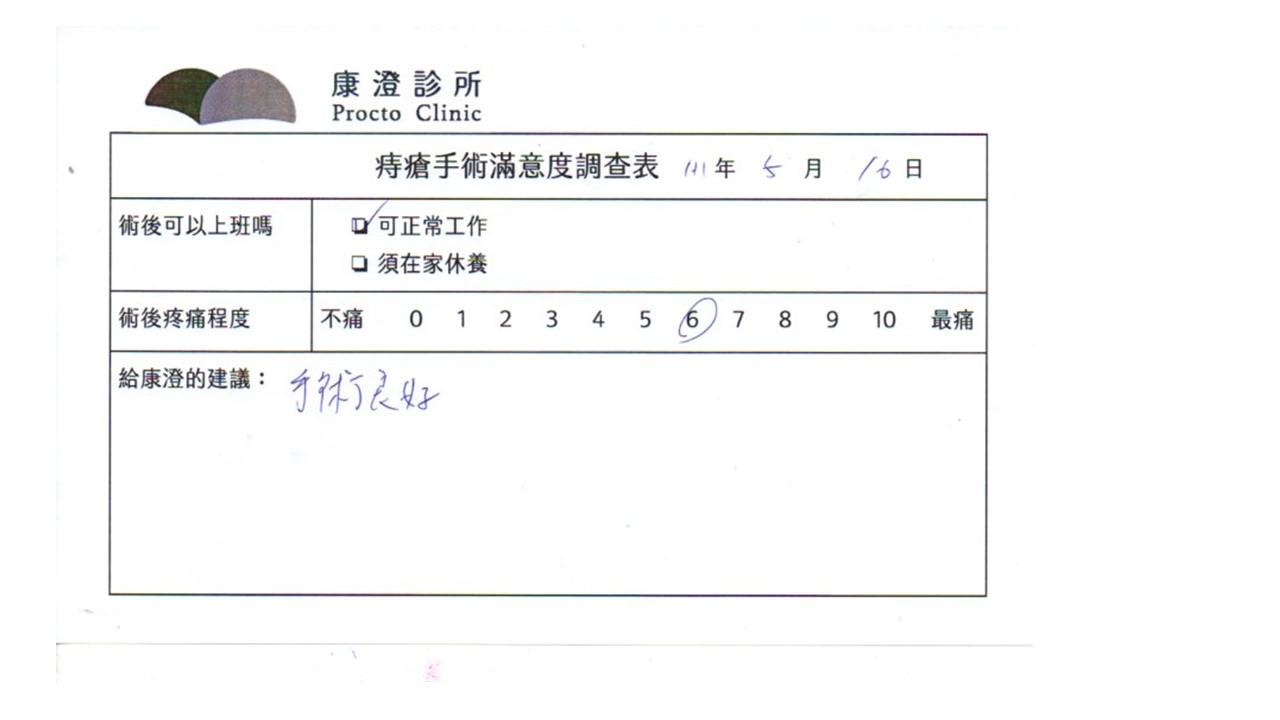 「困擾了20多年的三期內痔,終於在幾天內就解決了,原以為會很疼痛的手術及復原過程,結果真是神奇啊!不會痛呢!長效針應該是有用的,前幾天主要是腫脹,感謝林醫師,以及術後時時電話關心的小護士們,很棒!」