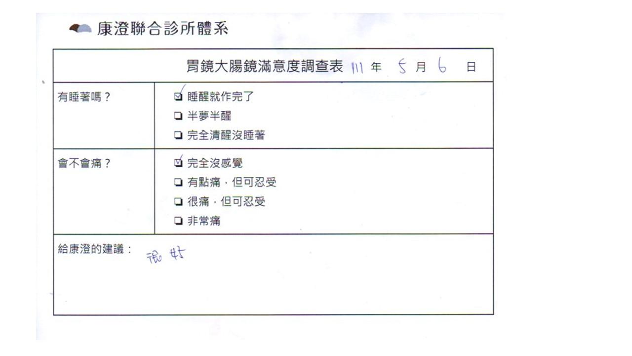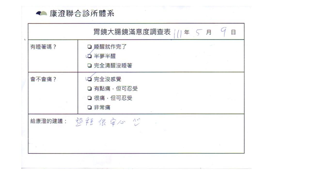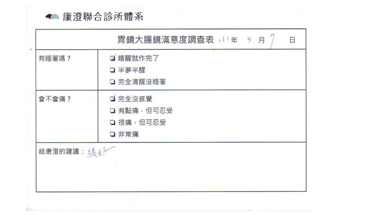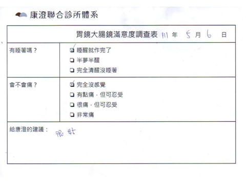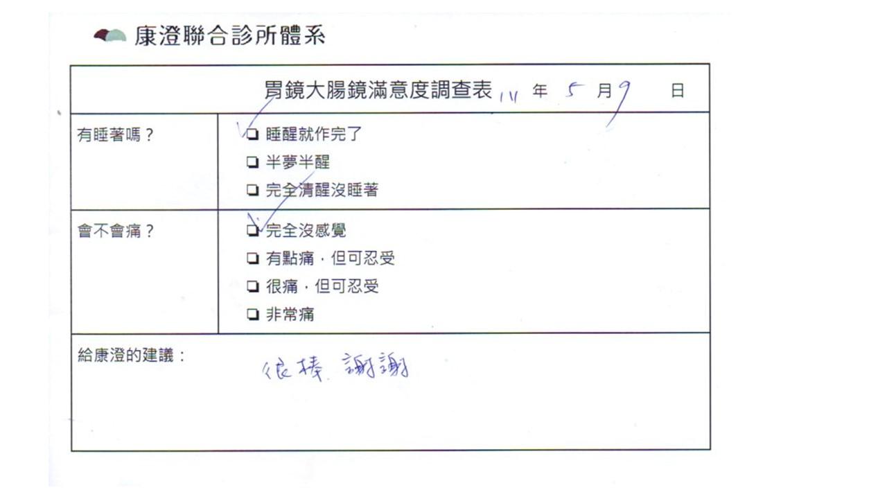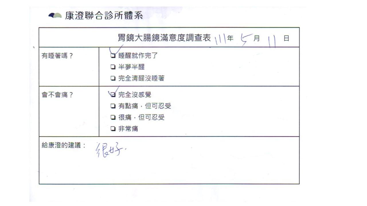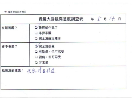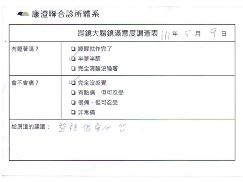 「定期穩定在櫃診所健檢,腸胃鏡的檢查醫療團隊及護理人員後續衛教的處理不輸醫院等級ㆍ專業丶舒適丶安心,整個療程無痛,護理人員親切可降低檢查的緊張感,非常感謝!」