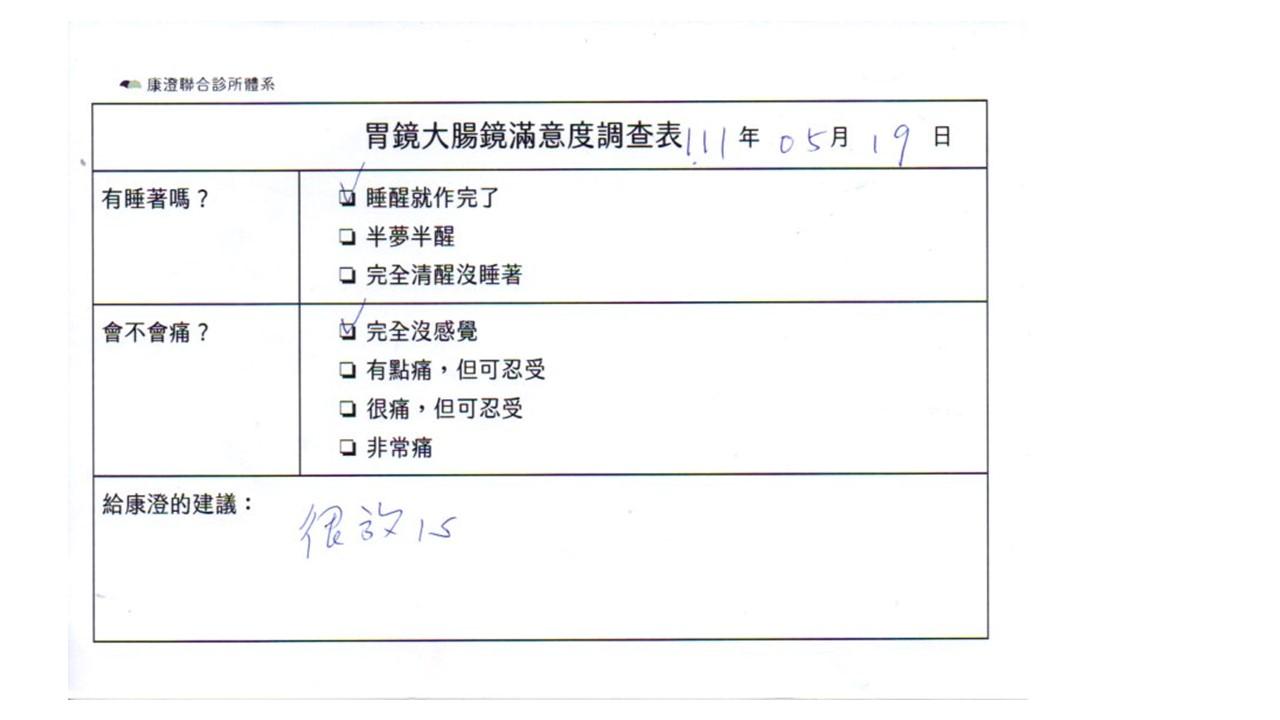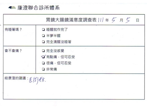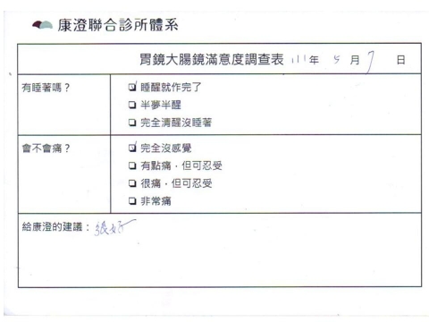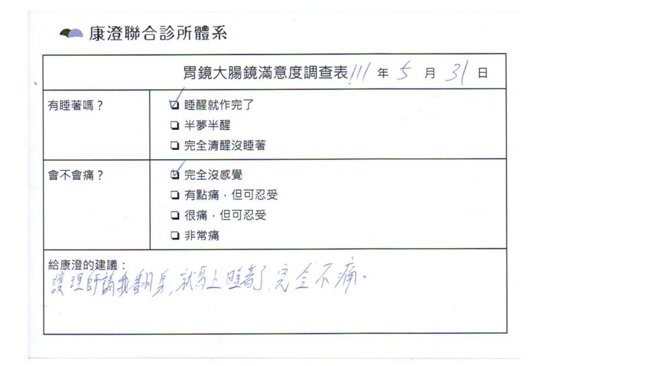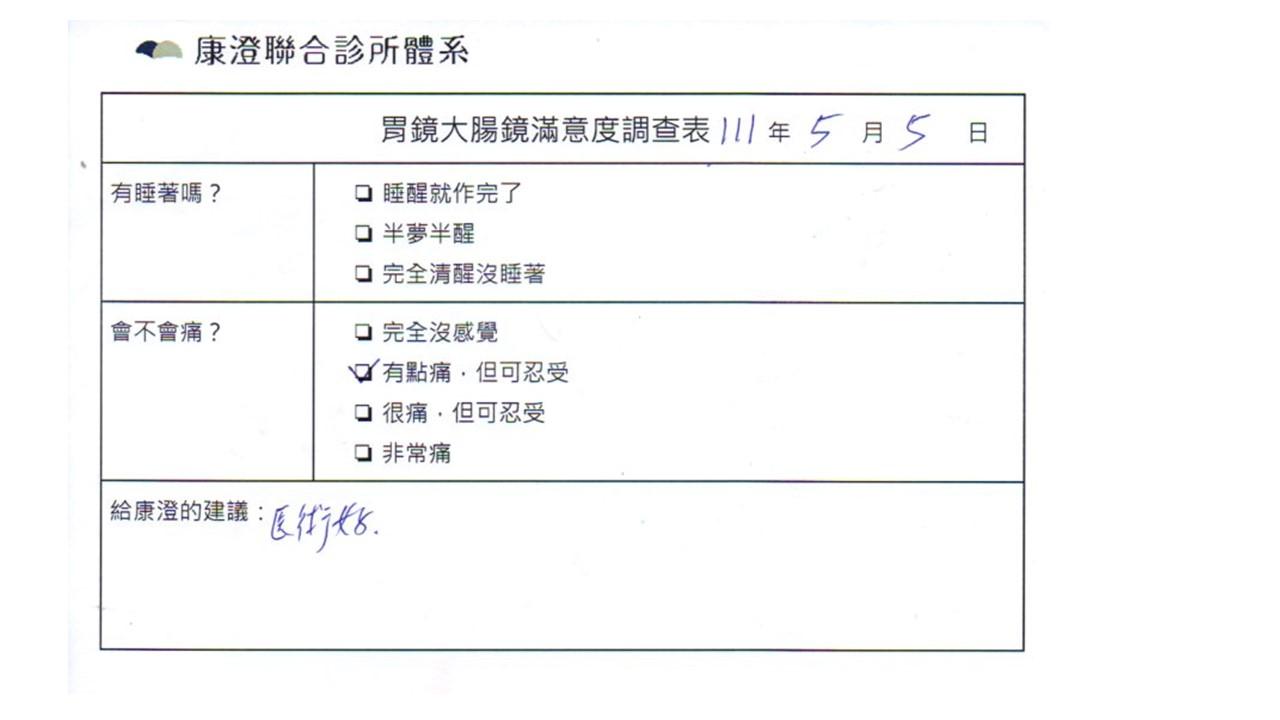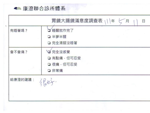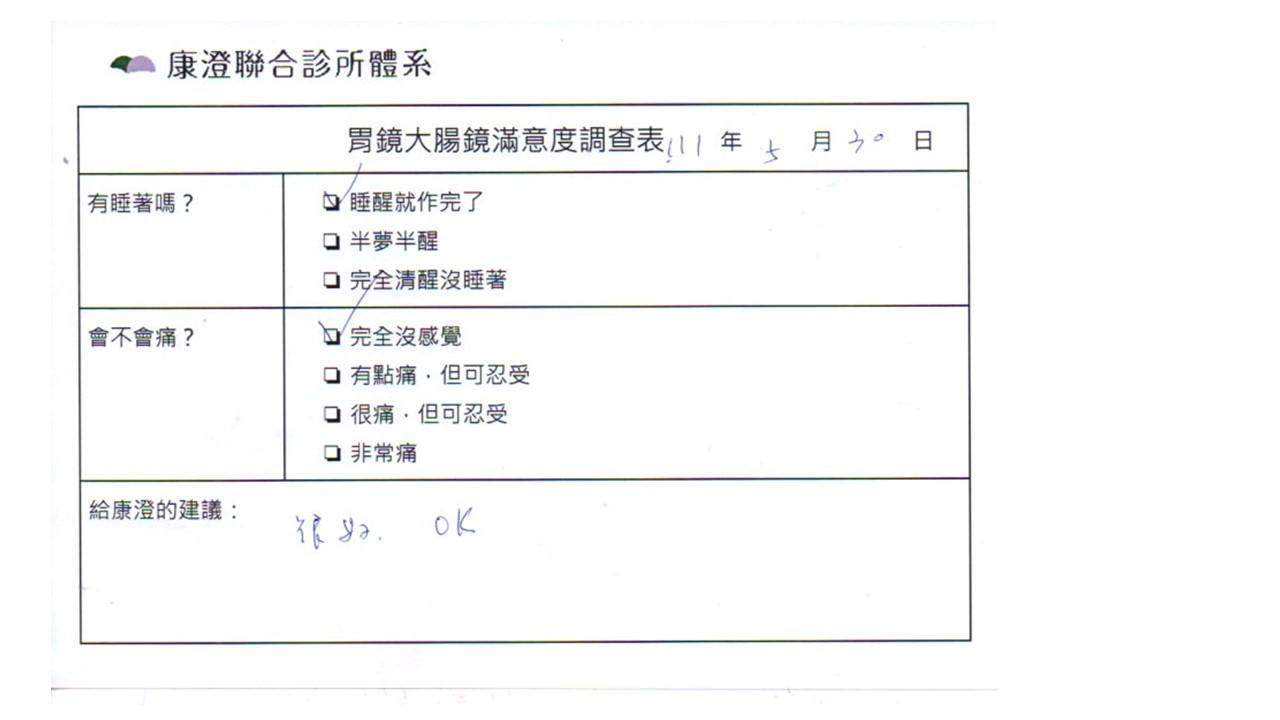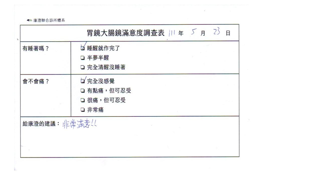 「定期穩定在櫃診所健檢,腸胃鏡的檢查醫療團隊及護理人員後續衛教的處理不輸醫院等級ㆍ專業丶舒適丶安心,整個療程無痛,護理人員親切可降低檢查的緊張感,非常感謝!」