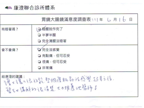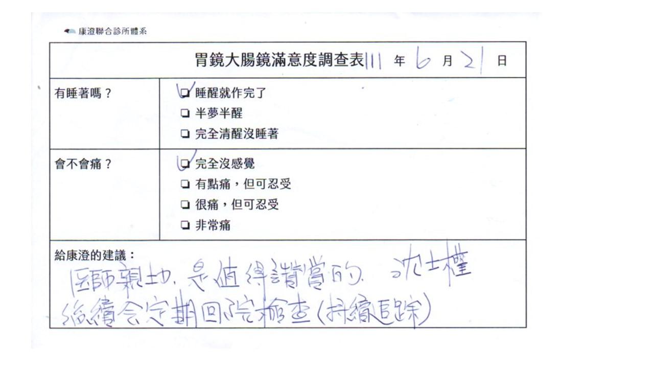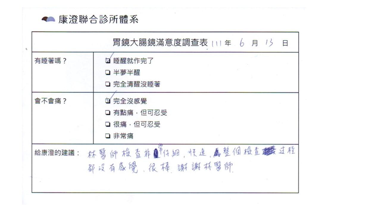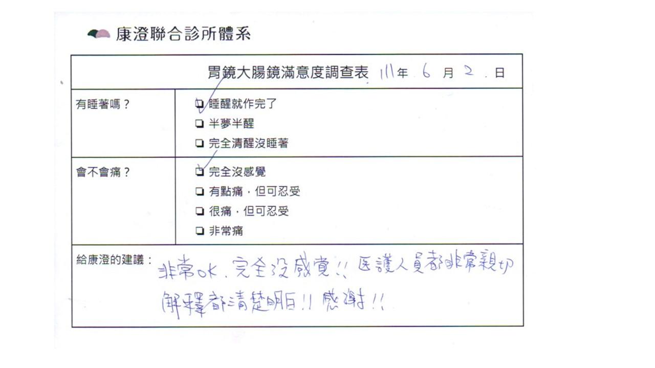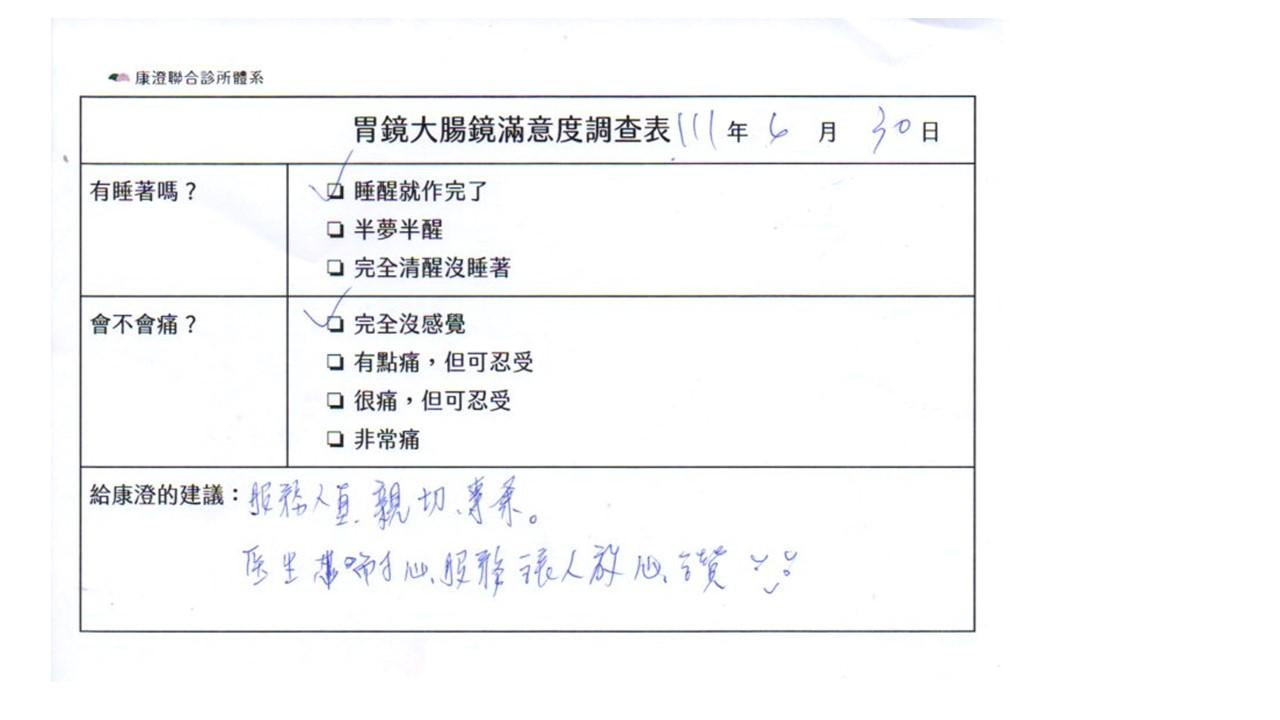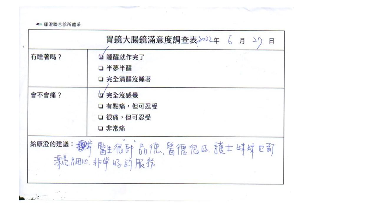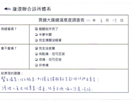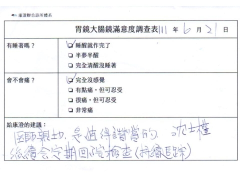 「定期穩定在櫃診所健檢,腸胃鏡的檢查醫療團隊及護理人員後續衛教的處理不輸醫院等級ㆍ專業丶舒適丶安心,整個療程無痛,護理人員親切可降低檢查的緊張感,非常感謝!」