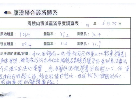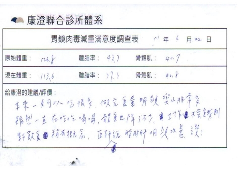 「很開心做了胃肉毒減重療程,讓我體會最幸福不挨餓的減肥方式!瘦了10%體重後,讓體態變美,最重要是身體變健康喔!感謝羅醫師及營養師的提醒及追蹤。」