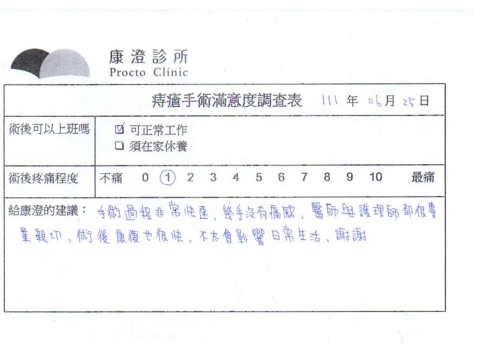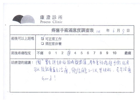 「困擾了20多年的三期內痔,終於在幾天內就解決了,原以為會很疼痛的手術及復原過程,結果真是神奇啊!不會痛呢!長效針應該是有用的,前幾天主要是腫脹,感謝林醫師,以及術後時時電話關心的小護士們,很棒!」