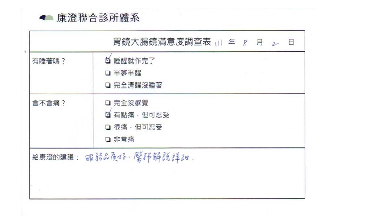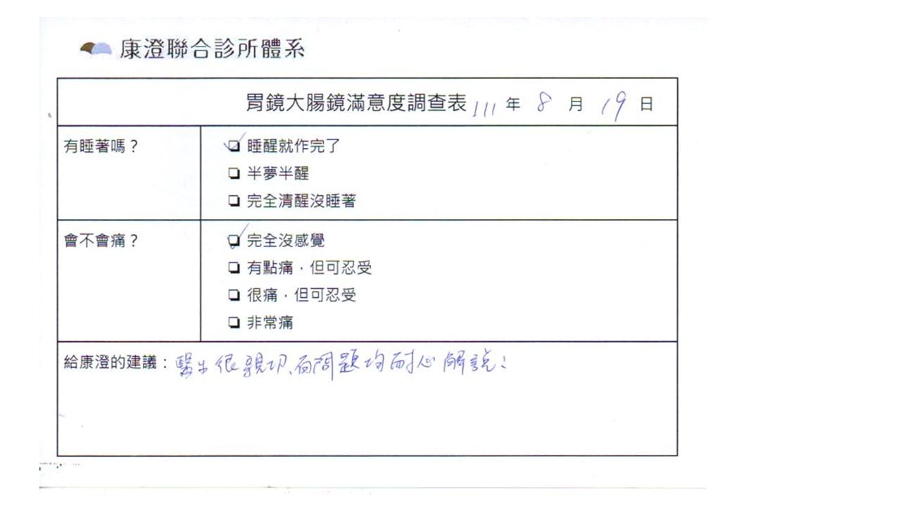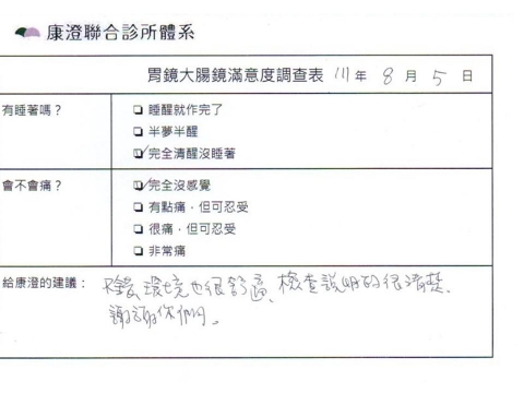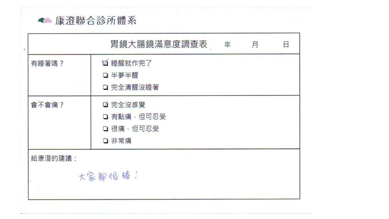 「定期穩定在櫃診所健檢,腸胃鏡的檢查醫療團隊及護理人員後續衛教的處理不輸醫院等級ㆍ專業丶舒適丶安心,整個療程無痛,護理人員親切可降低檢查的緊張感,非常感謝!」