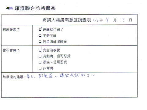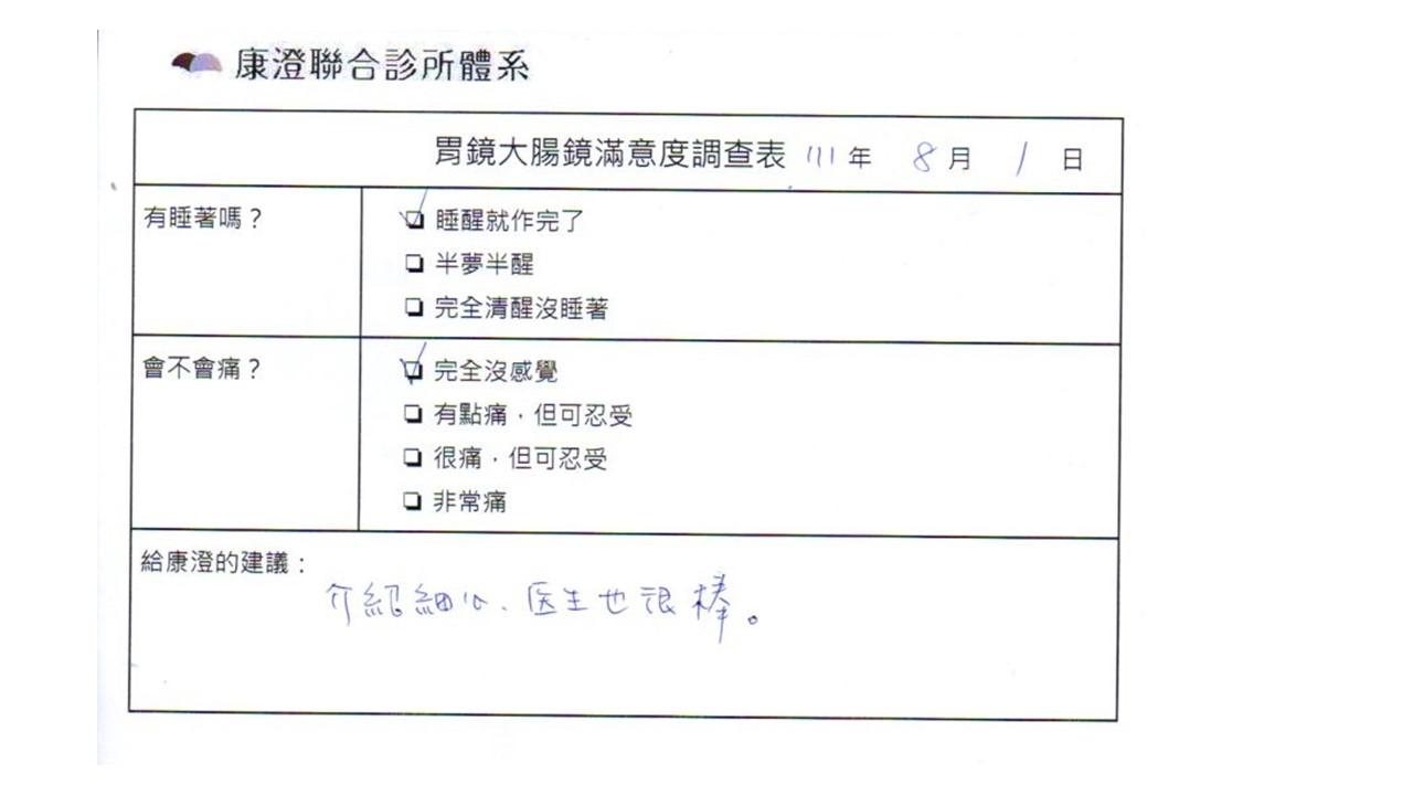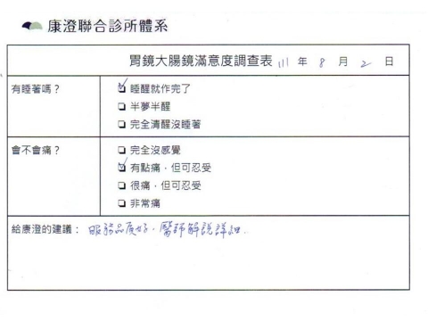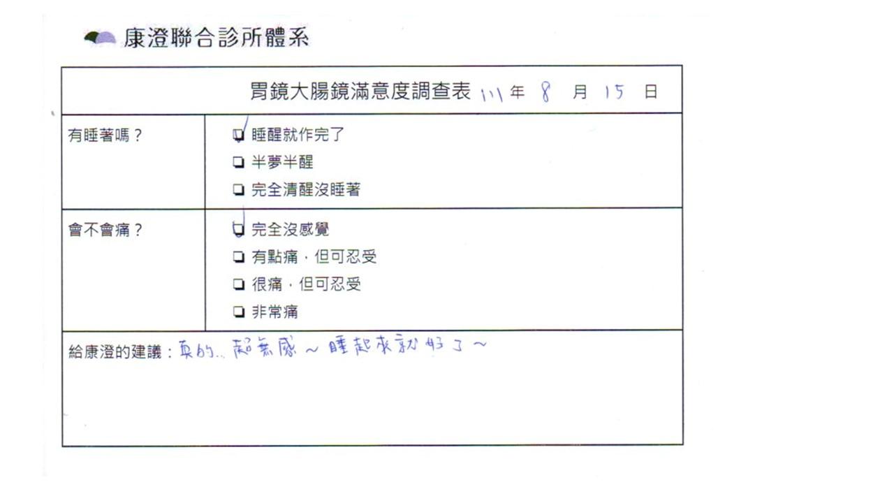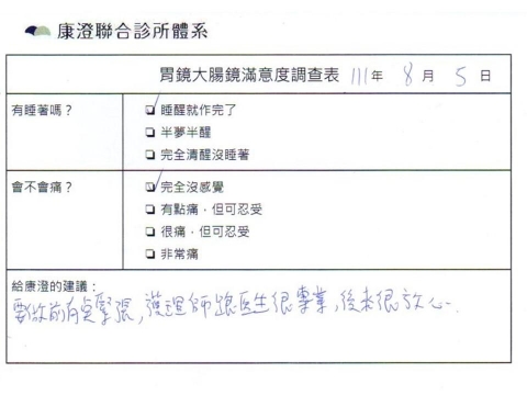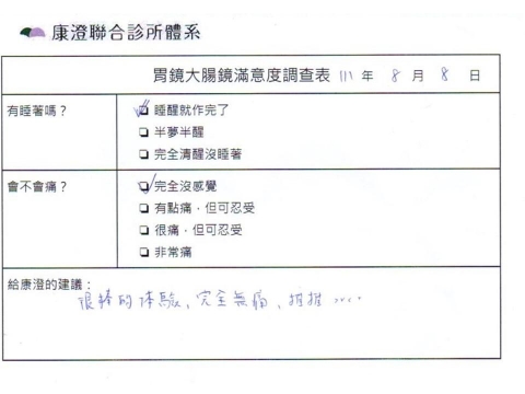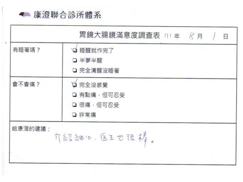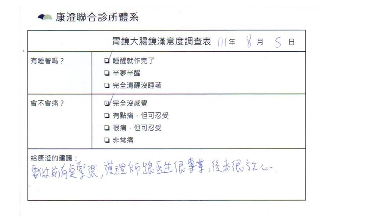 「定期穩定在櫃診所健檢,腸胃鏡的檢查醫療團隊及護理人員後續衛教的處理不輸醫院等級ㆍ專業丶舒適丶安心,整個療程無痛,護理人員親切可降低檢查的緊張感,非常感謝!」