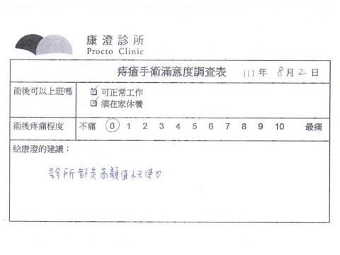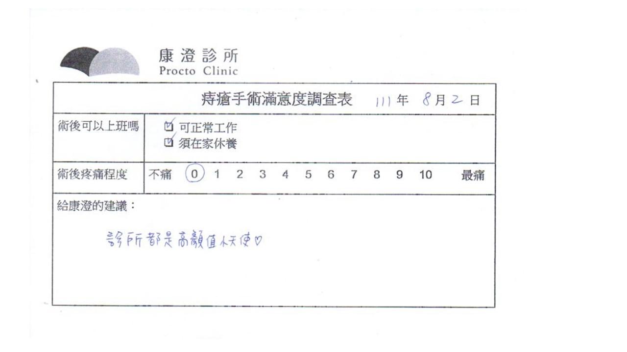 「困擾了20多年的三期內痔,終於在幾天內就解決了,原以為會很疼痛的手術及復原過程,結果真是神奇啊!不會痛呢!長效針應該是有用的,前幾天主要是腫脹,感謝林醫師,以及術後時時電話關心的小護士們,很棒!」