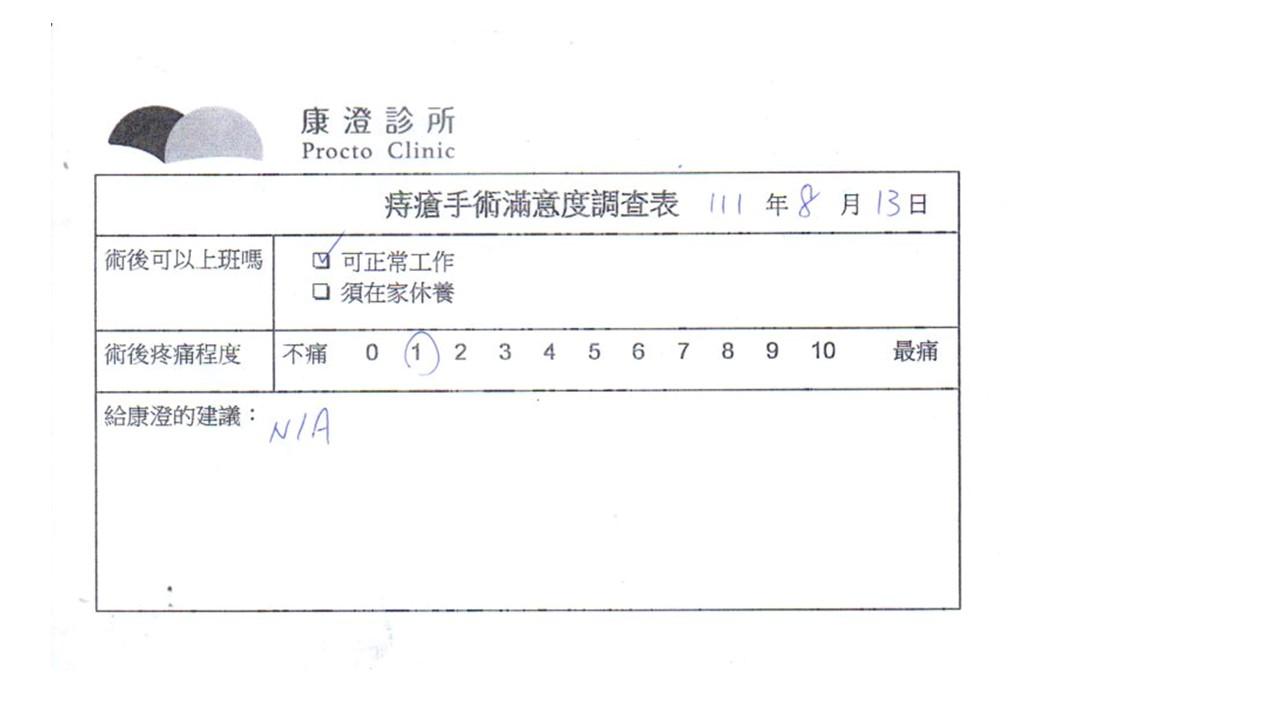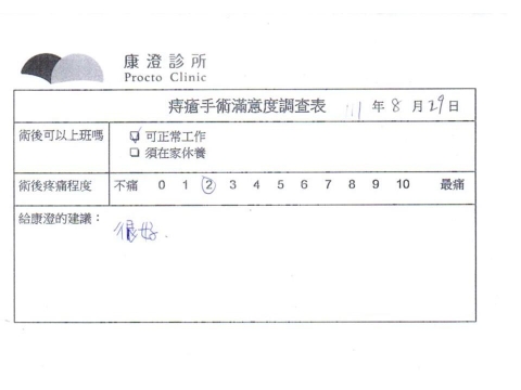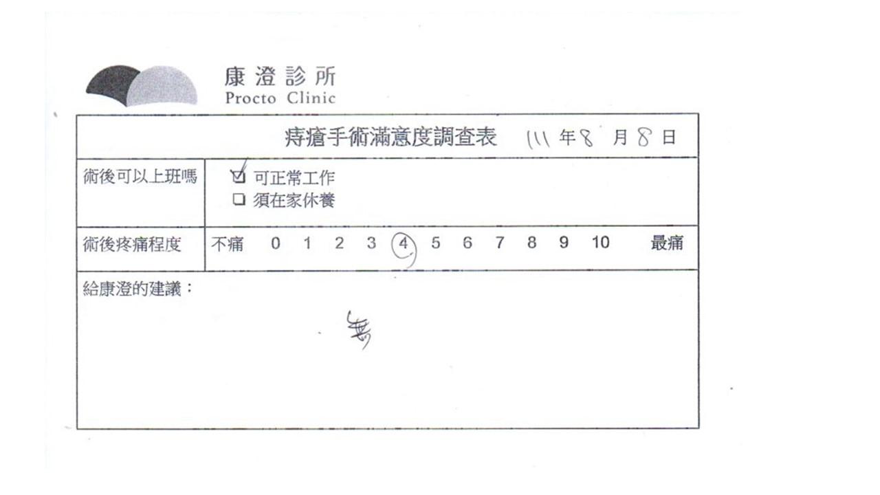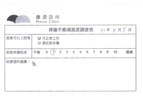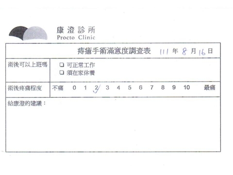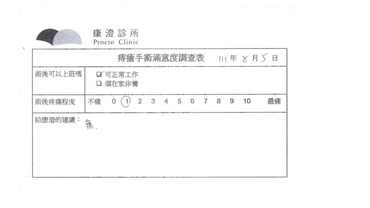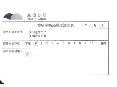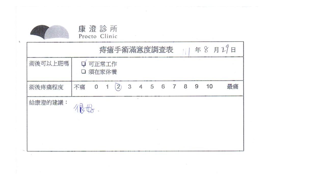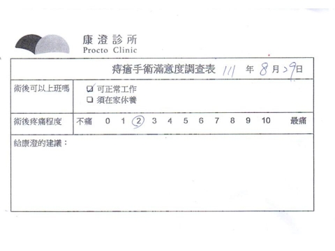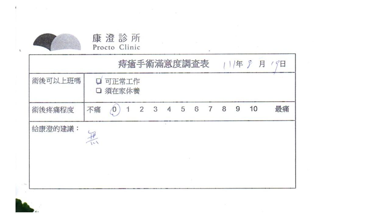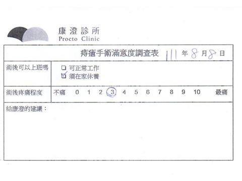 「困擾了20多年的三期內痔,終於在幾天內就解決了,原以為會很疼痛的手術及復原過程,結果真是神奇啊!不會痛呢!長效針應該是有用的,前幾天主要是腫脹,感謝林醫師,以及術後時時電話關心的小護士們,很棒!」