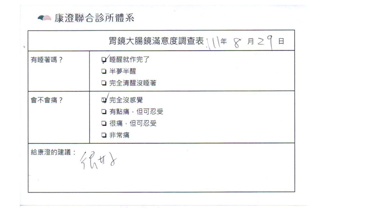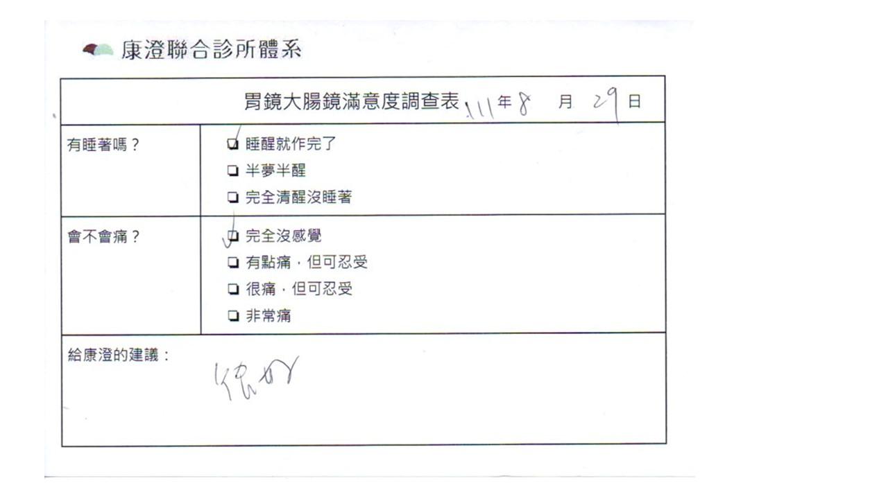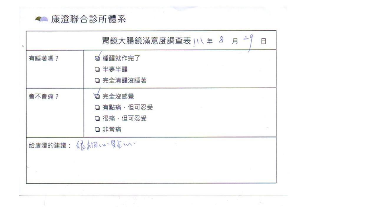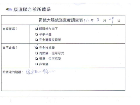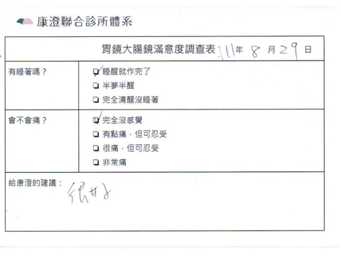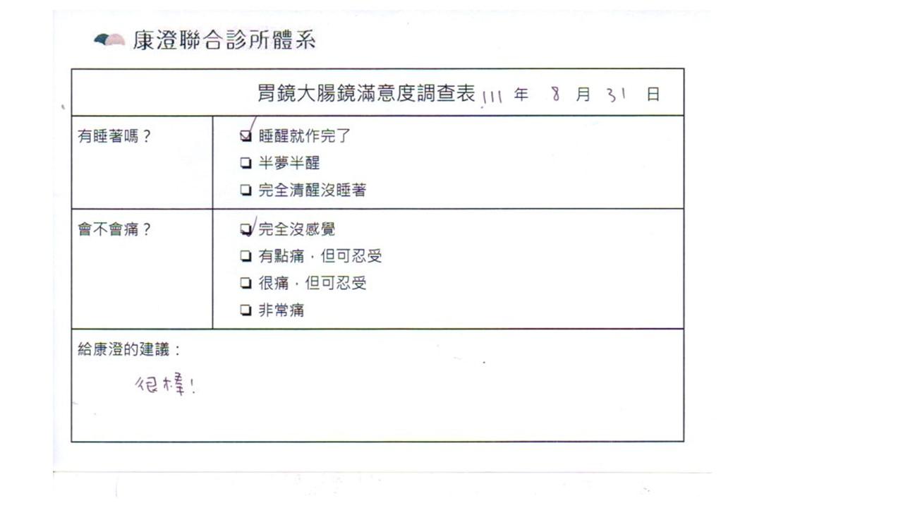 「定期穩定在櫃診所健檢,腸胃鏡的檢查醫療團隊及護理人員後續衛教的處理不輸醫院等級ㆍ專業丶舒適丶安心,整個療程無痛,護理人員親切可降低檢查的緊張感,非常感謝!」