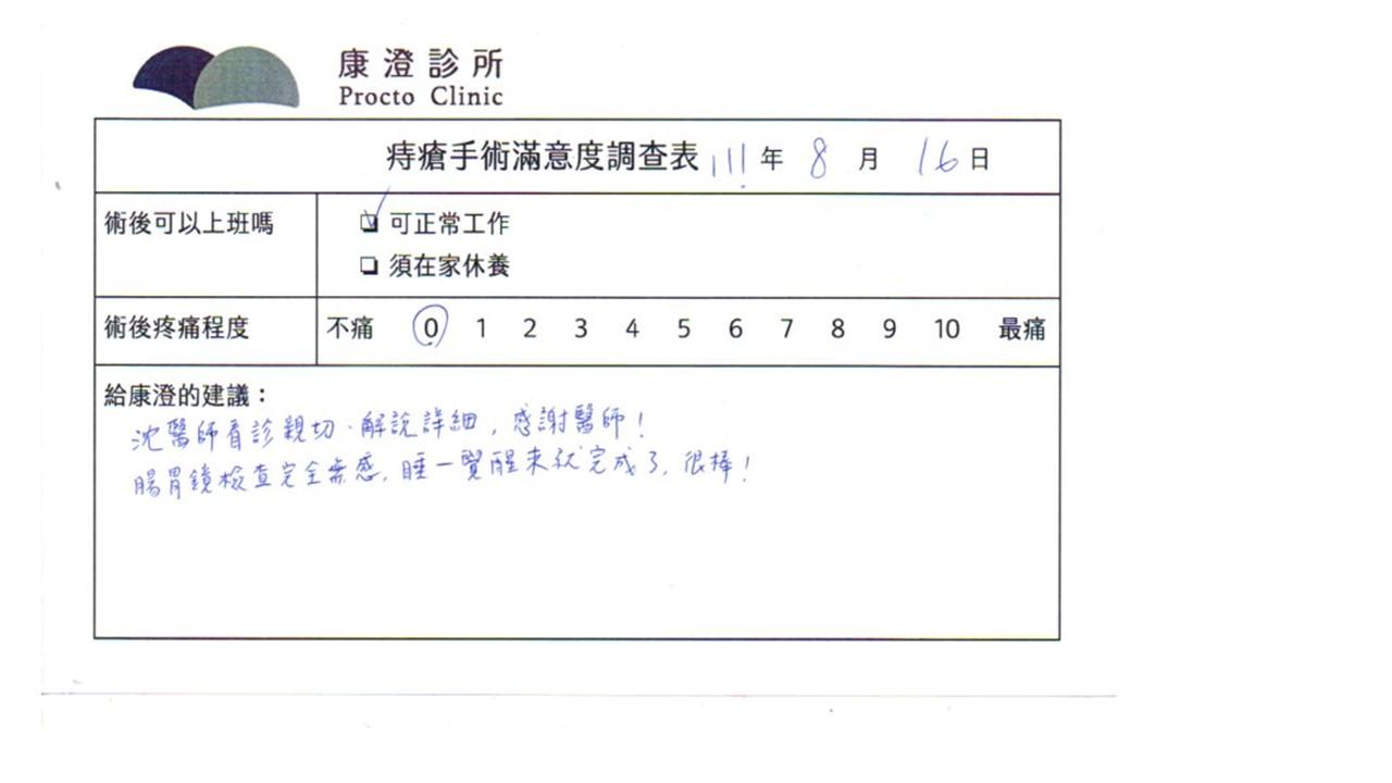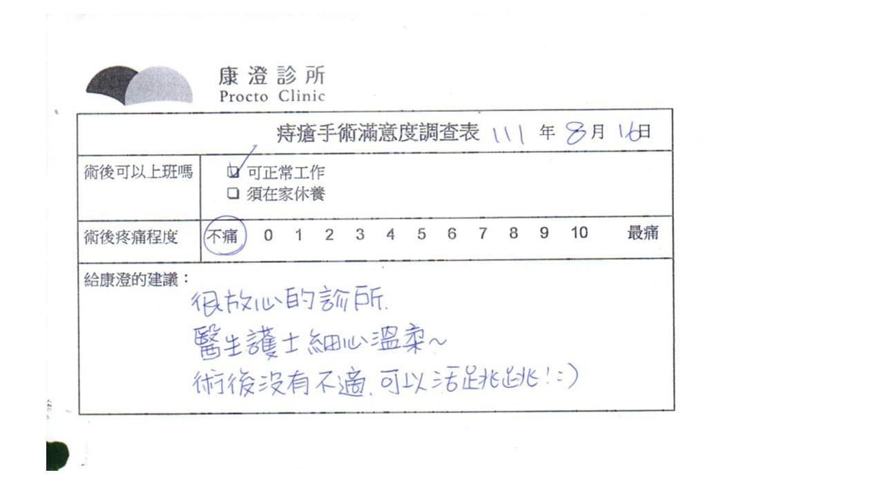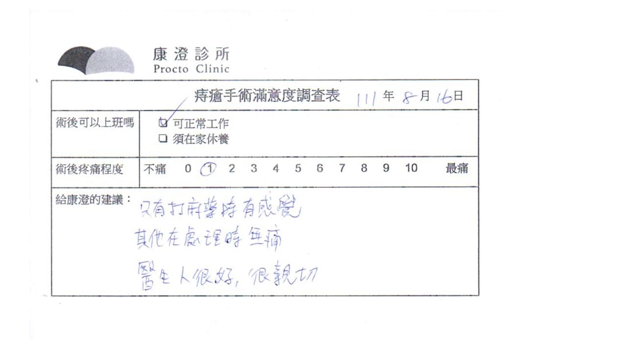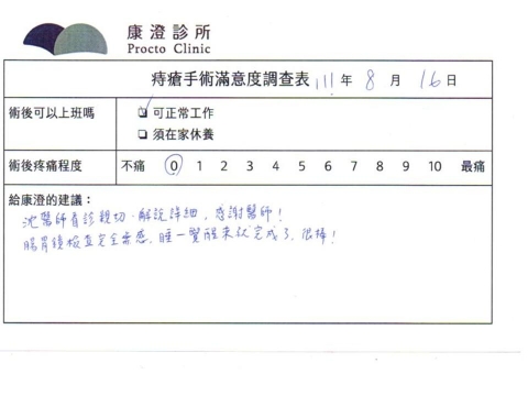 「困擾了20多年的三期內痔,終於在幾天內就解決了,原以為會很疼痛的手術及復原過程,結果真是神奇啊!不會痛呢!長效針應該是有用的,前幾天主要是腫脹,感謝林醫師,以及術後時時電話關心的小護士們,很棒!」