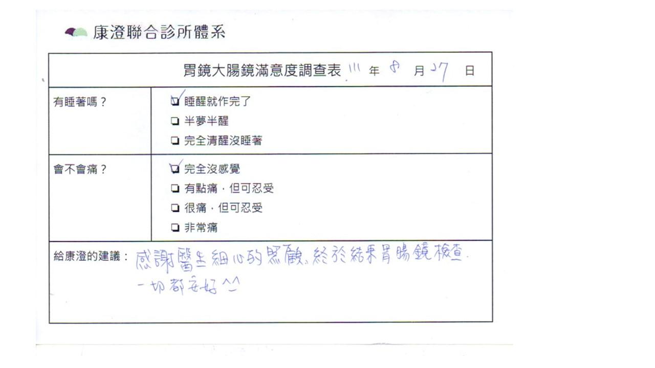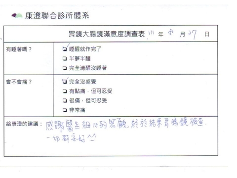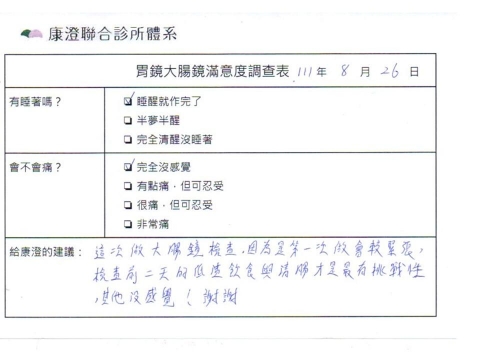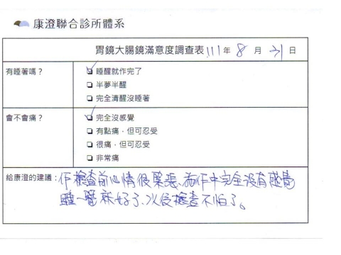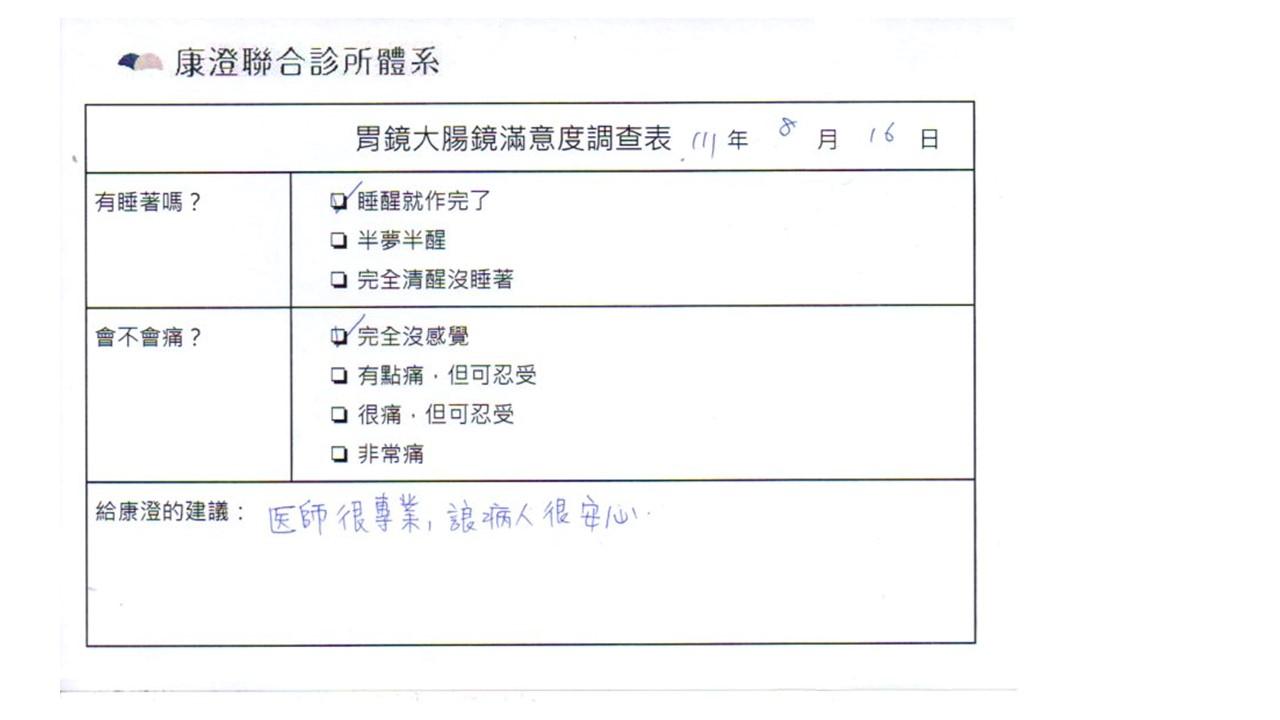 「定期穩定在櫃診所健檢,腸胃鏡的檢查醫療團隊及護理人員後續衛教的處理不輸醫院等級ㆍ專業丶舒適丶安心,整個療程無痛,護理人員親切可降低檢查的緊張感,非常感謝!」