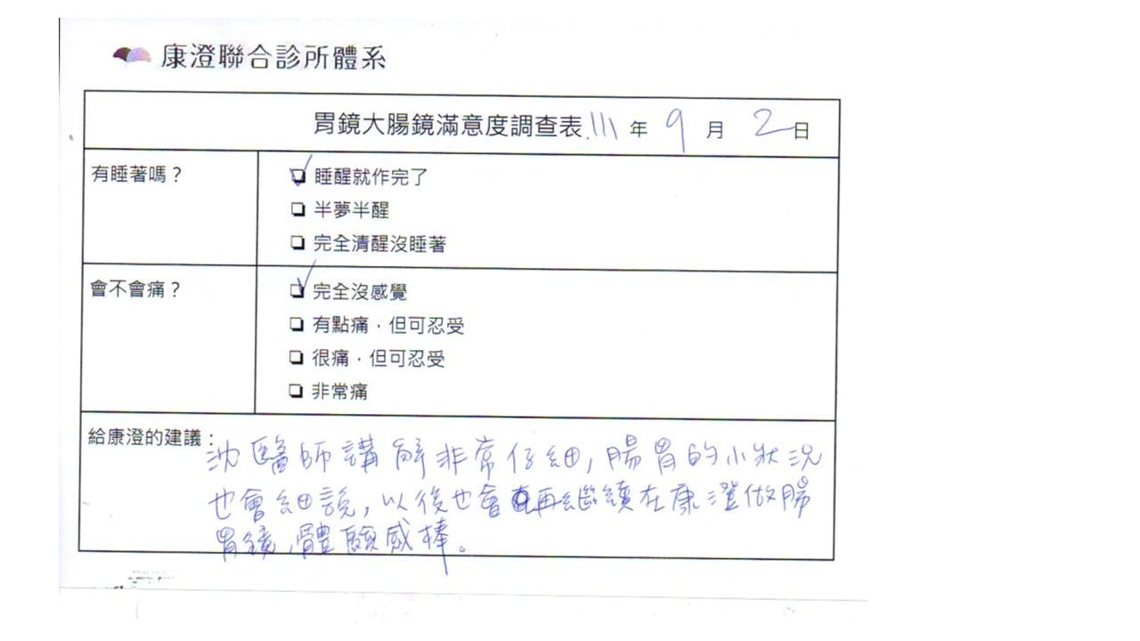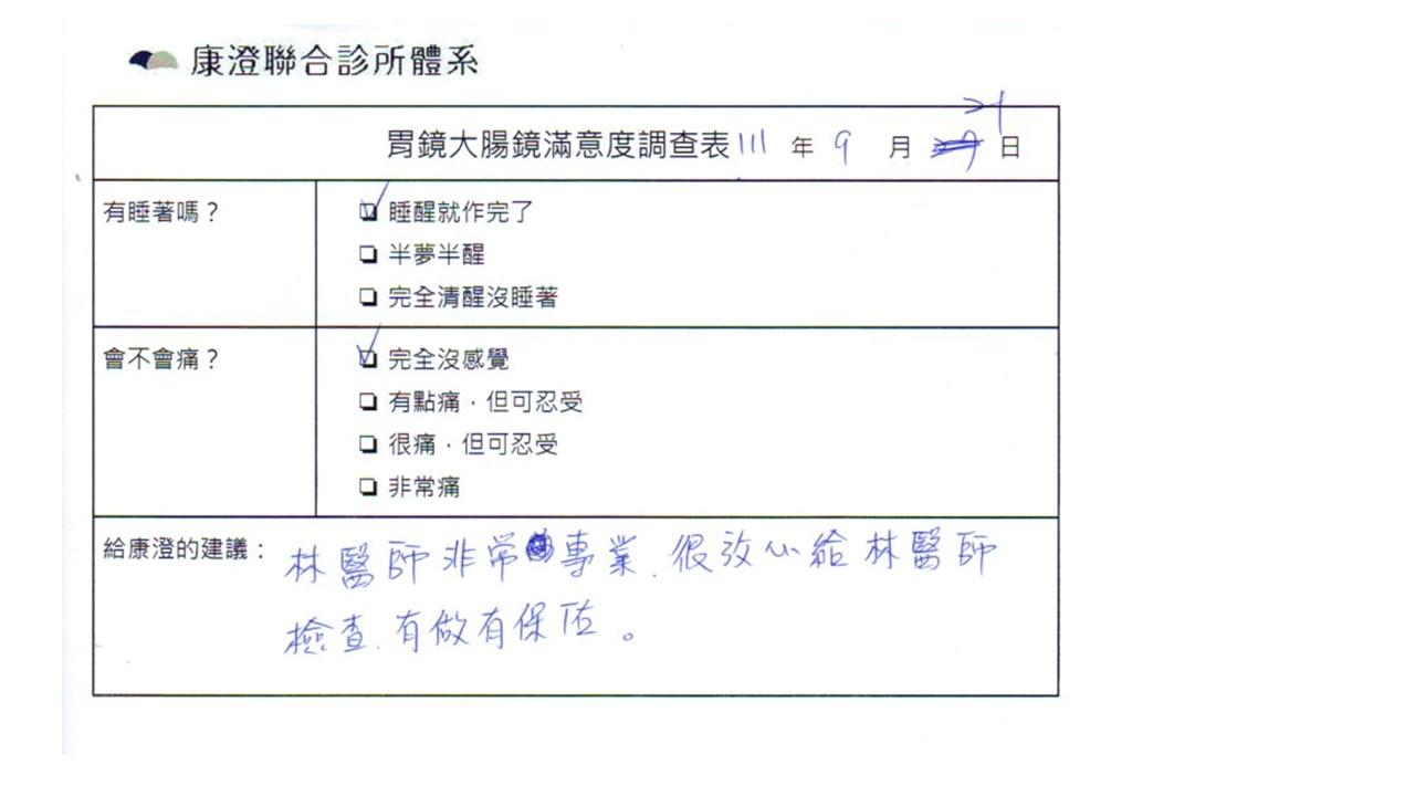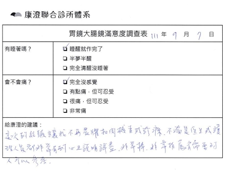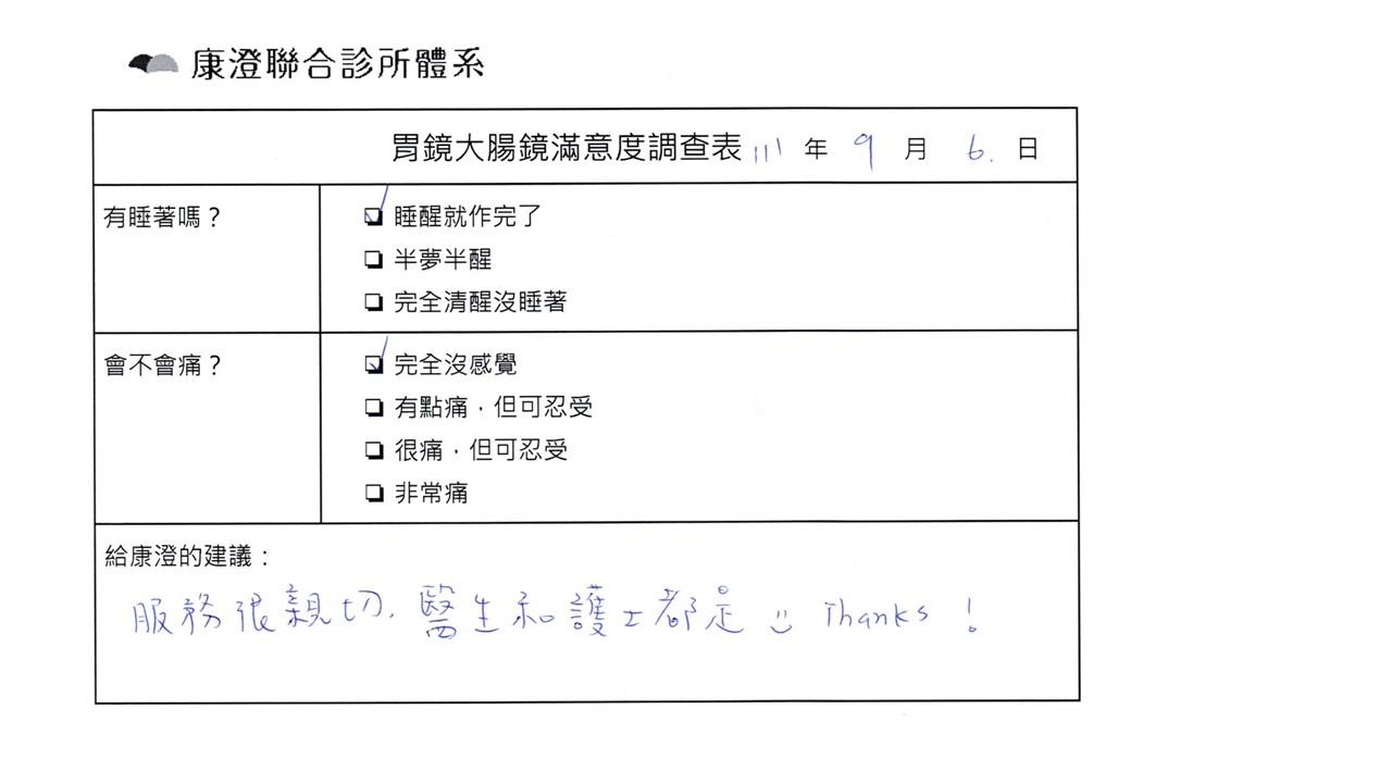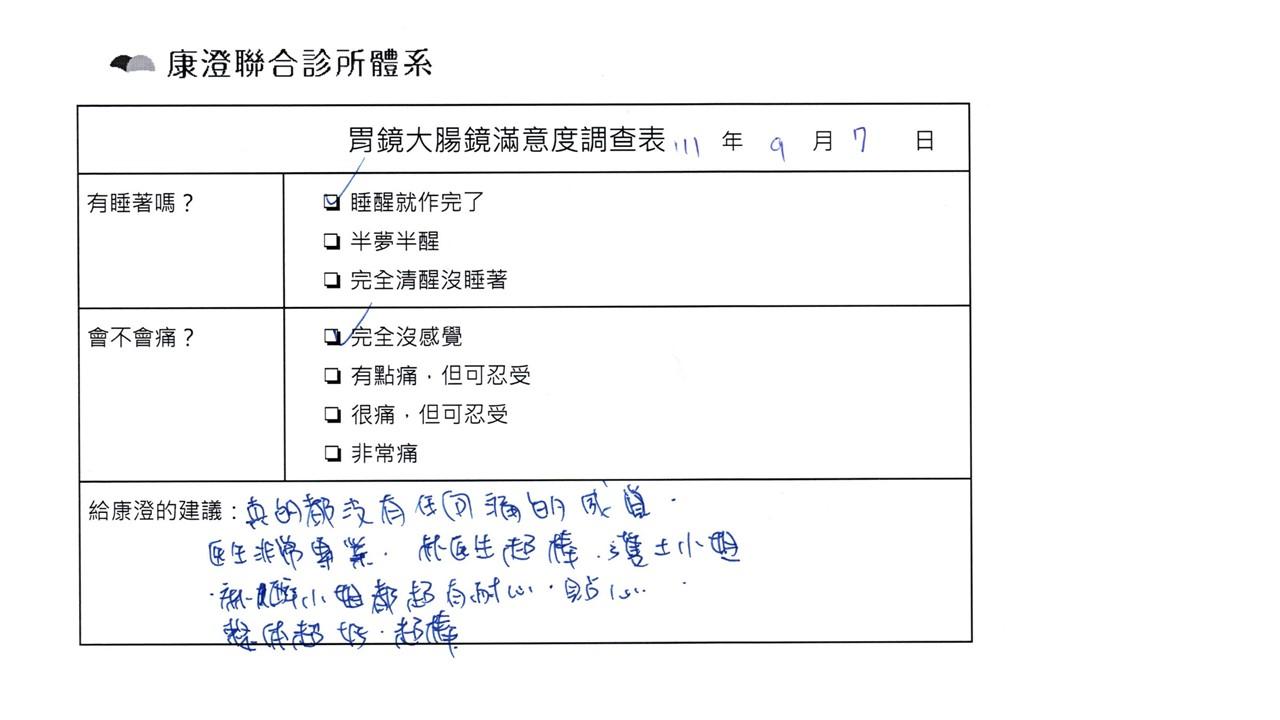 「定期穩定在櫃診所健檢,腸胃鏡的檢查醫療團隊及護理人員後續衛教的處理不輸醫院等級ㆍ專業丶舒適丶安心,整個療程無痛,護理人員親切可降低檢查的緊張感,非常感謝!」