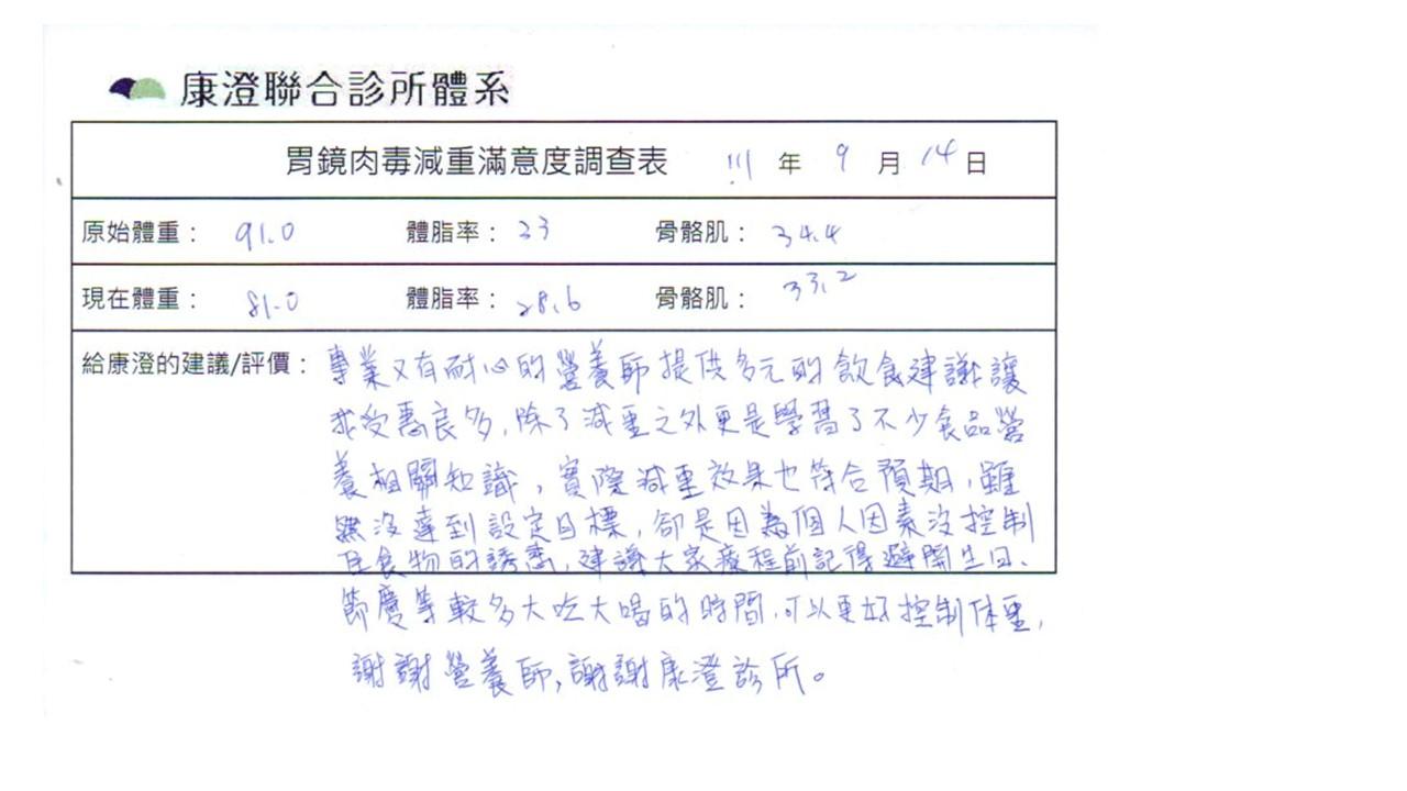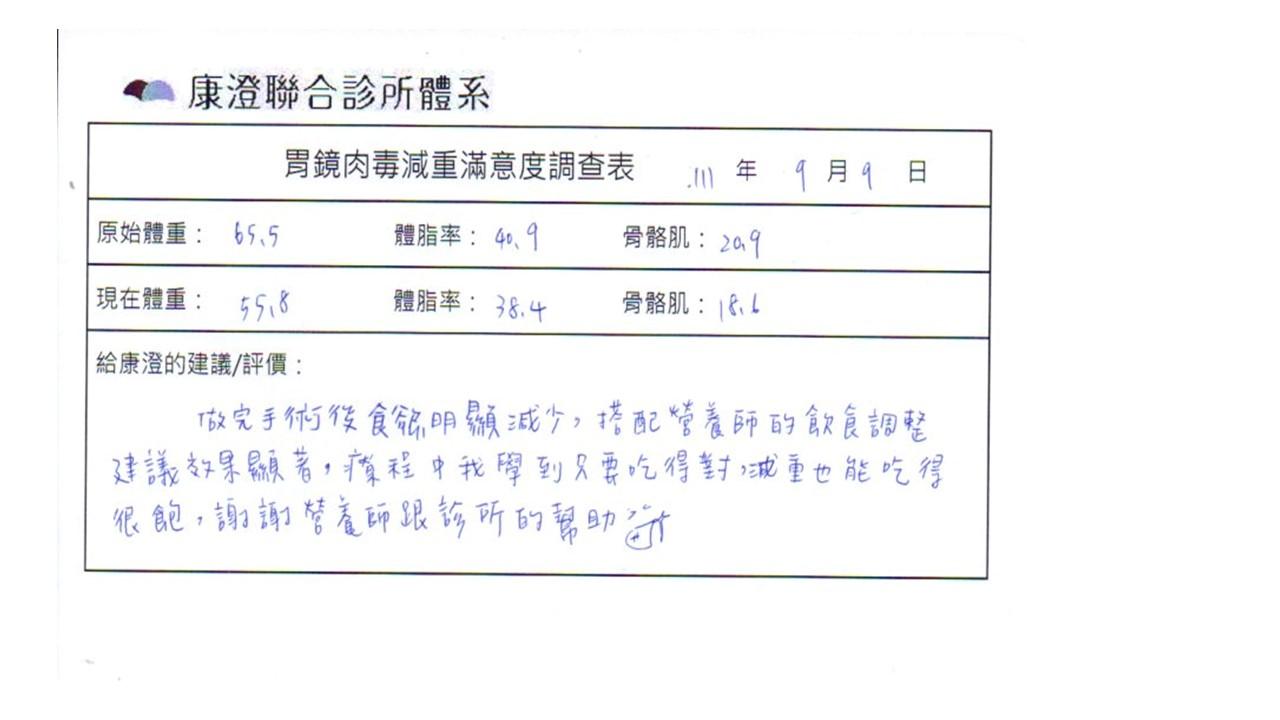 「很開心做了胃肉毒減重療程,讓我體會最幸福不挨餓的減肥方式!瘦了10%體重後,讓體態變美,最重要是身體變健康喔!感謝羅醫師及營養師的提醒及追蹤。」