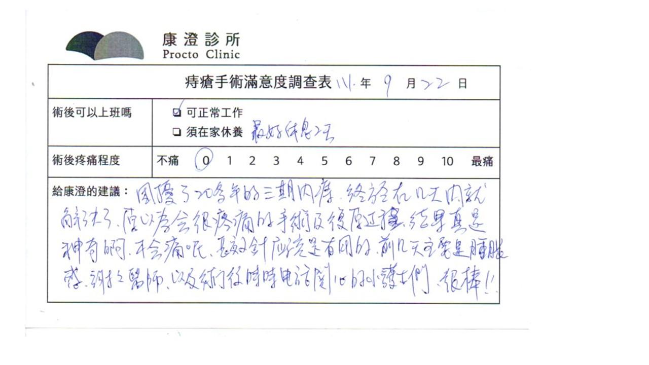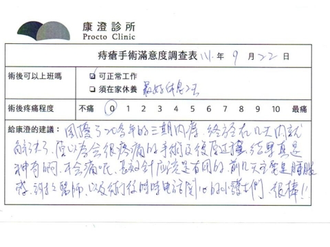「困擾了20多年的三期內痔,終於在幾天內就解決了,原以為會很疼痛的手術及復原過程,結果真是神奇啊!不會痛呢!長效針應該是有用的,前幾天主要是腫脹,感謝林醫師,以及術後時時電話關心的小護士們,很棒!」