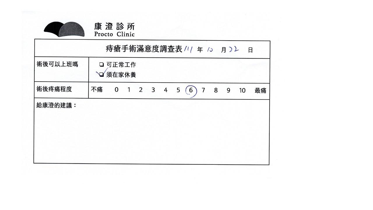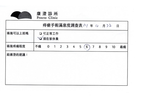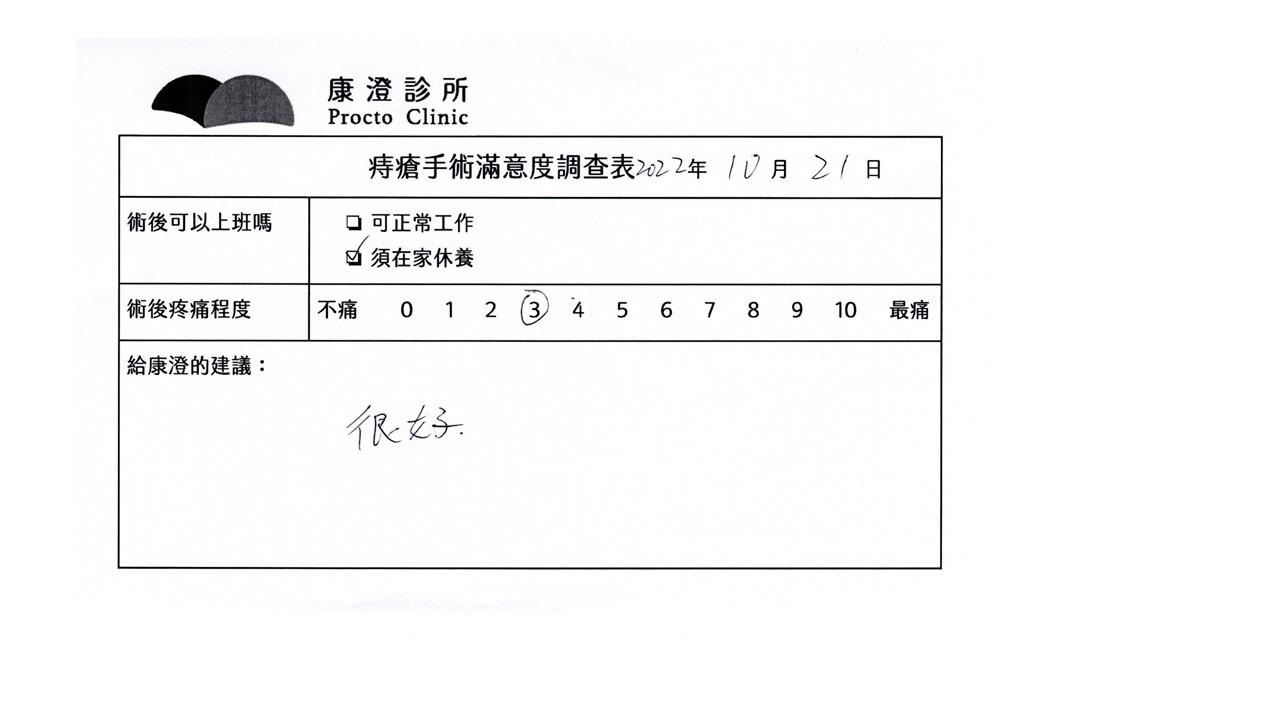 「困擾了20多年的三期內痔,終於在幾天內就解決了,原以為會很疼痛的手術及復原過程,結果真是神奇啊!不會痛呢!長效針應該是有用的,前幾天主要是腫脹,感謝林醫師,以及術後時時電話關心的小護士們,很棒!」