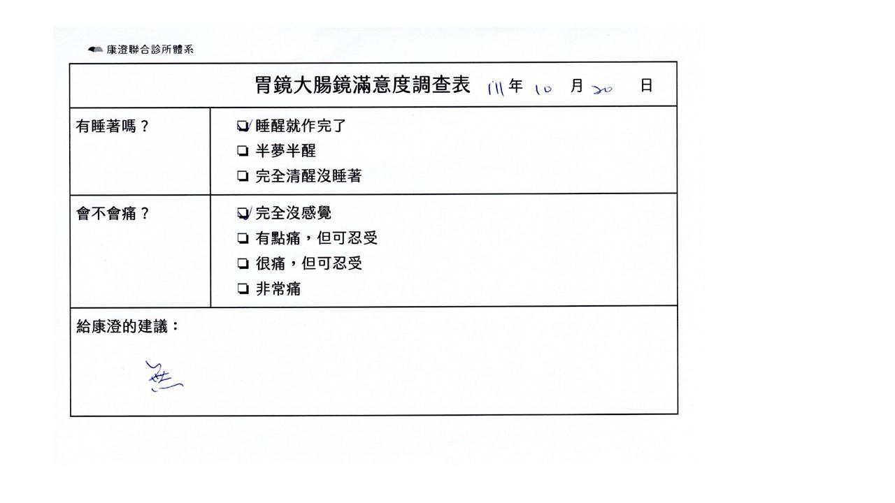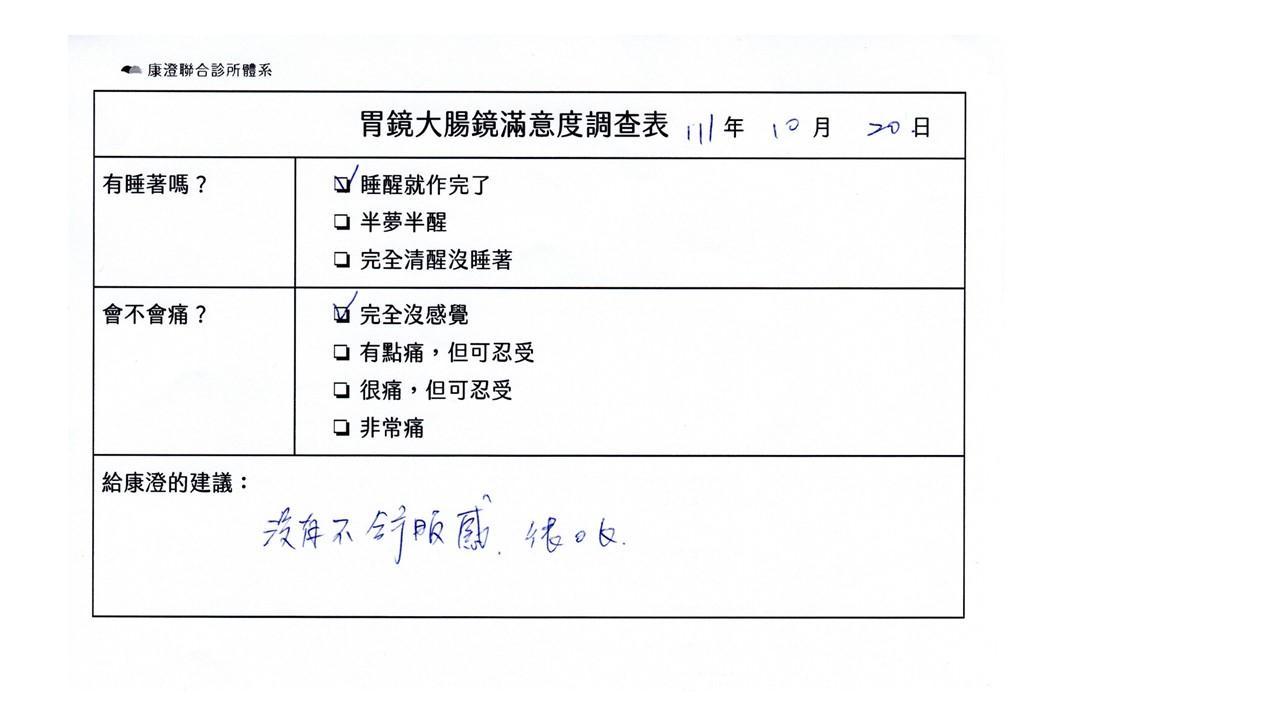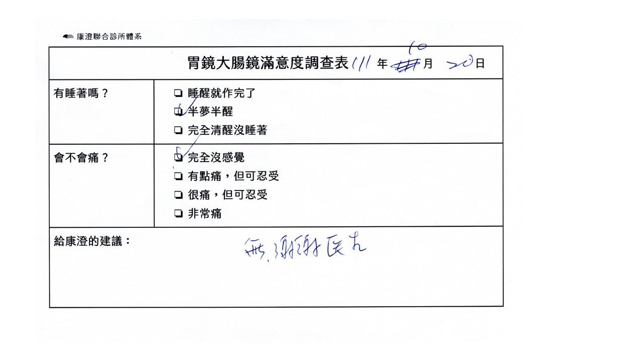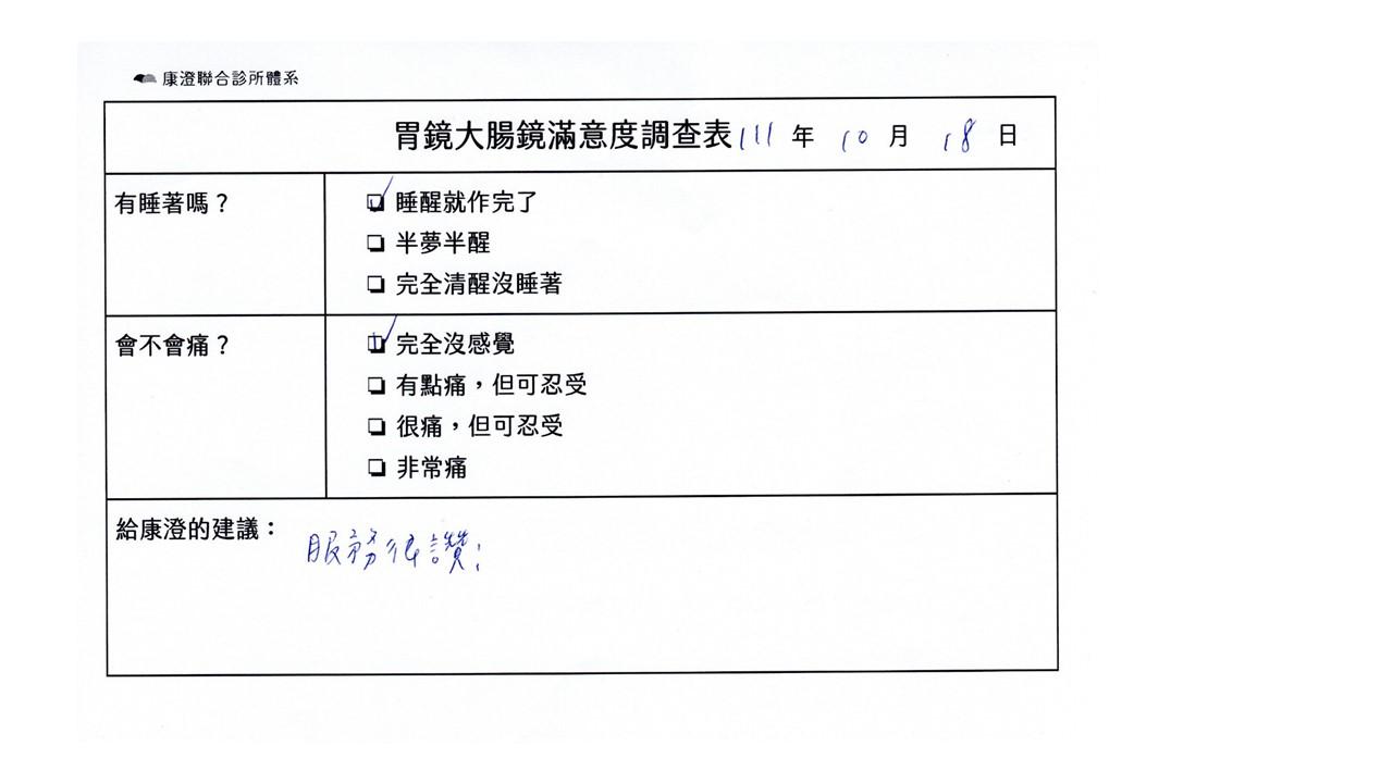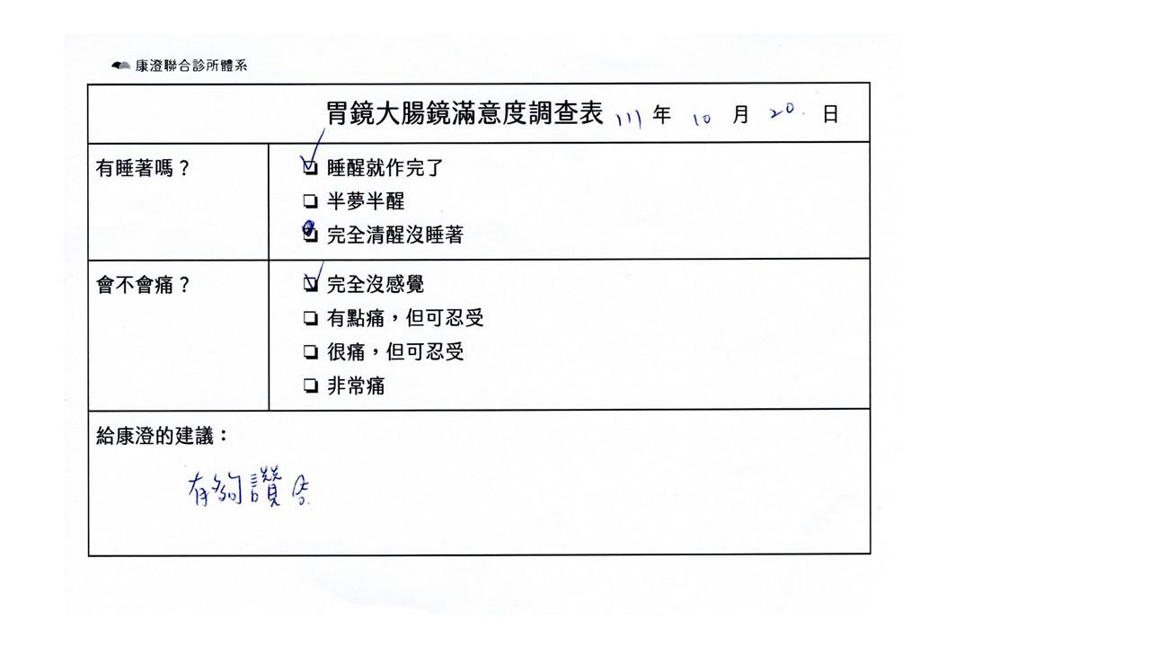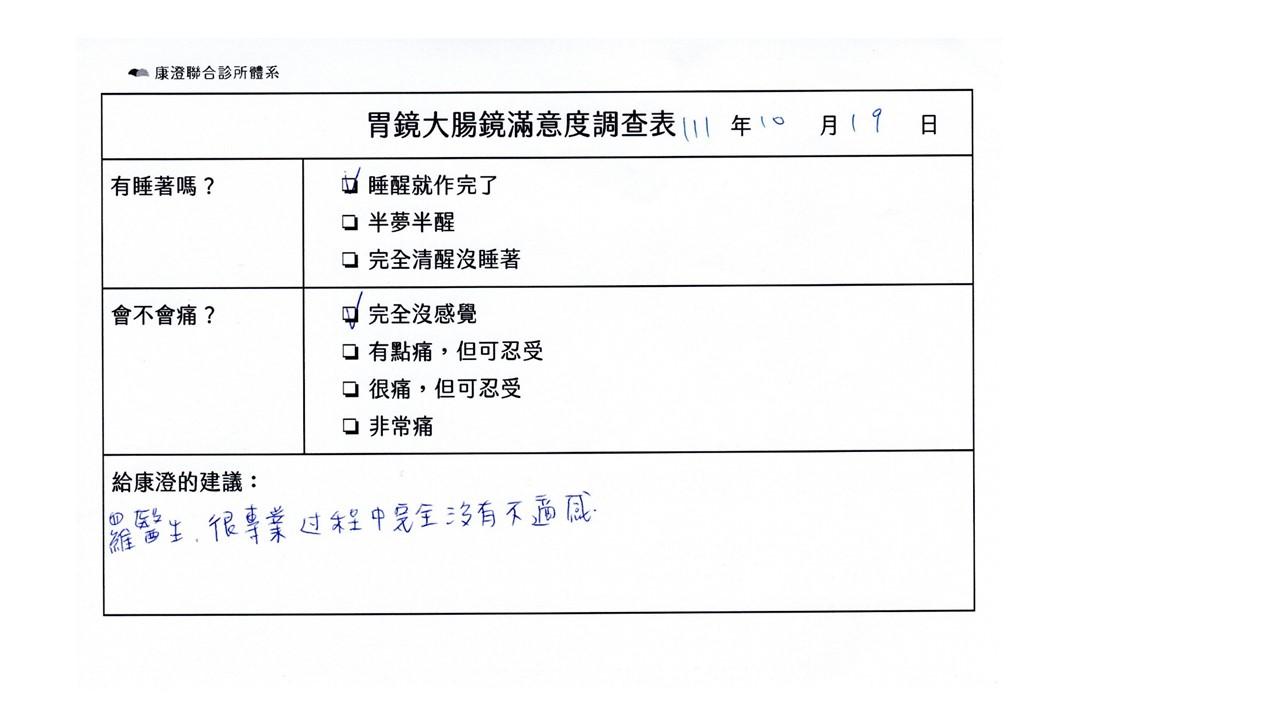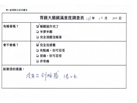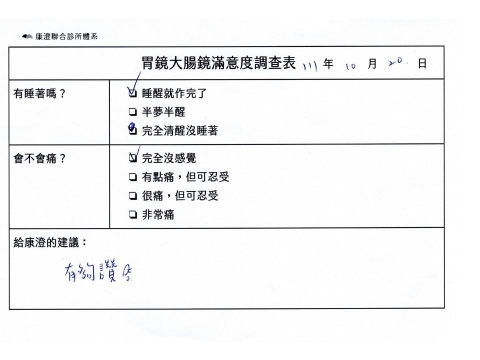 「定期穩定在櫃診所健檢,腸胃鏡的檢查醫療團隊及護理人員後續衛教的處理不輸醫院等級ㆍ專業丶舒適丶安心,整個療程無痛,護理人員親切可降低檢查的緊張感,非常感謝!」
