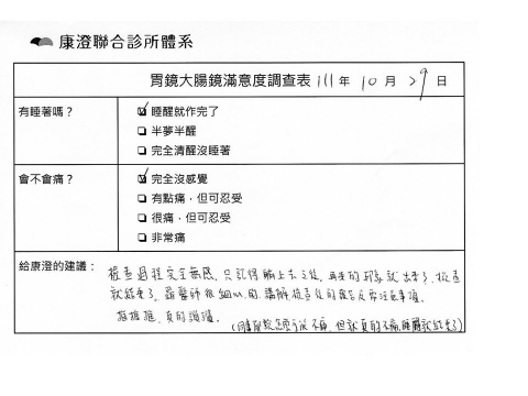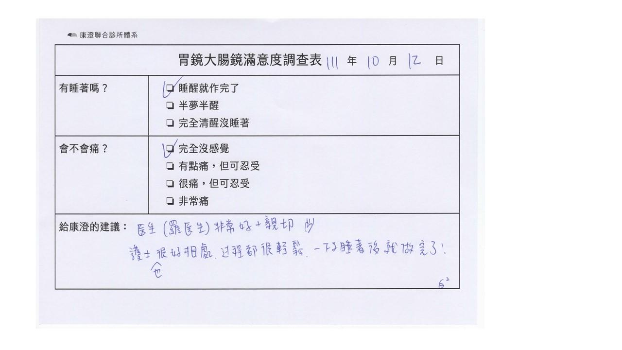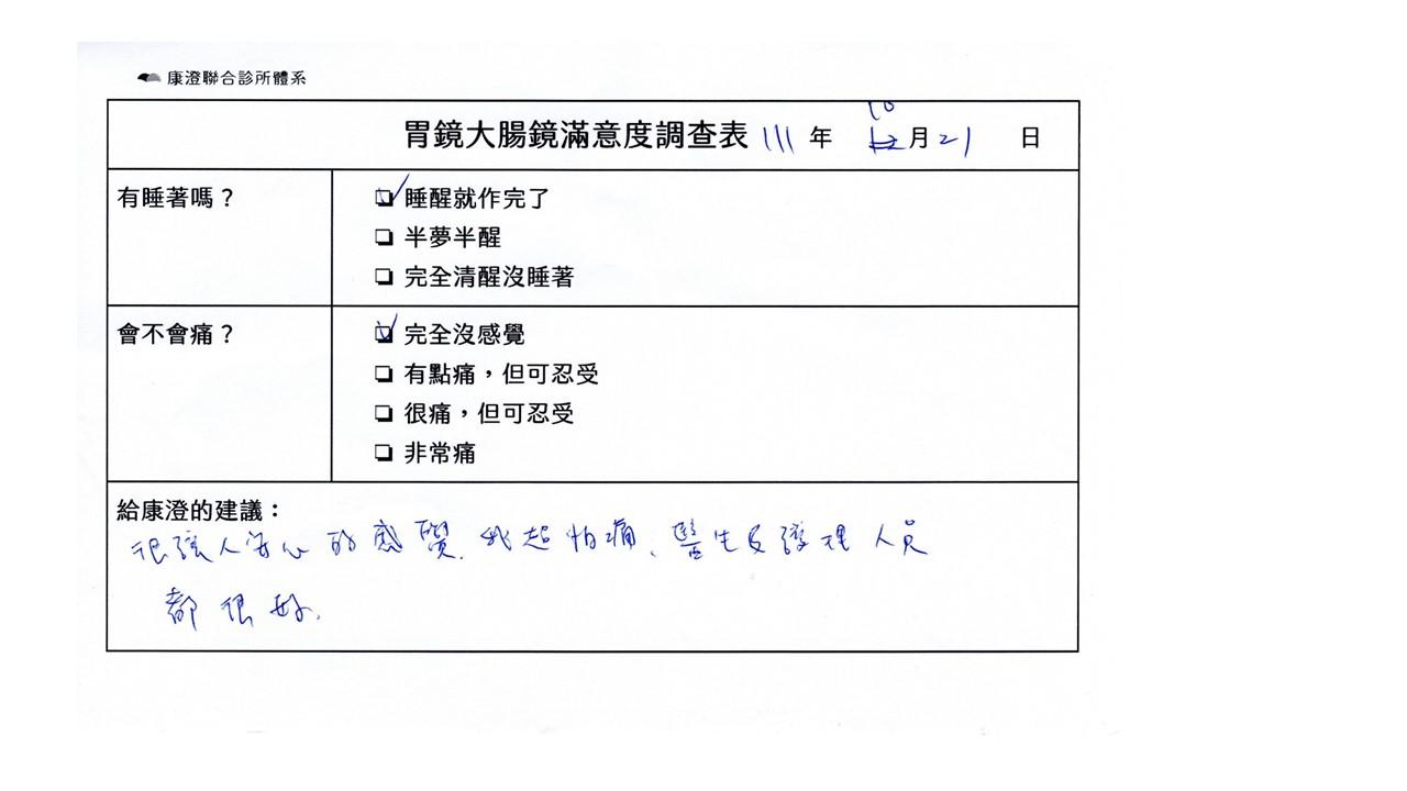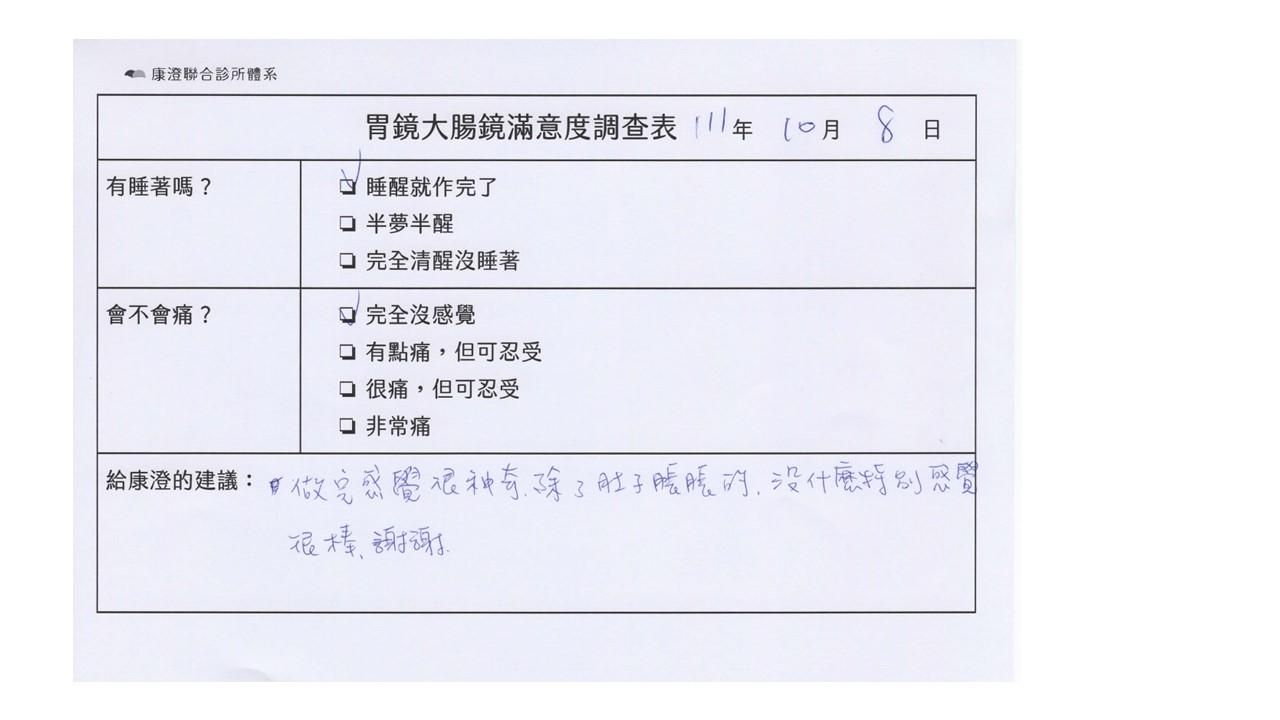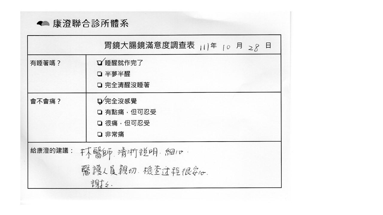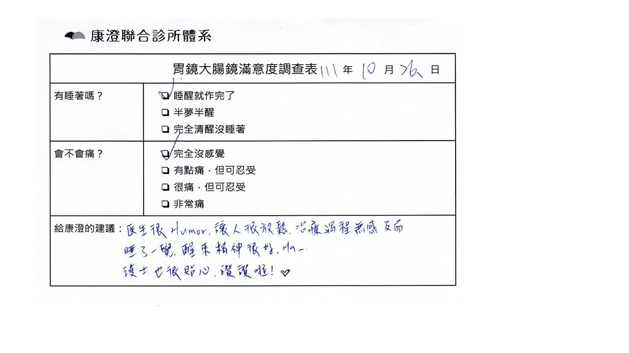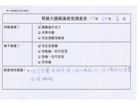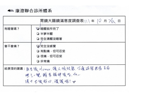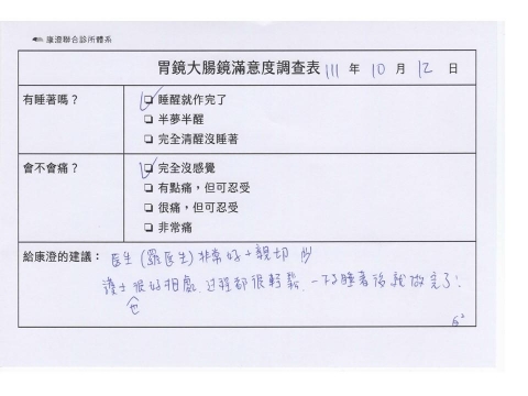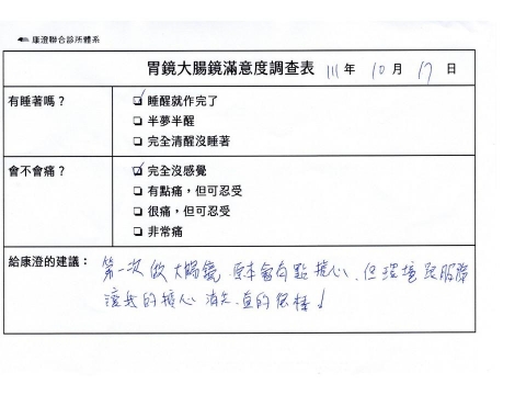 「定期穩定在櫃診所健檢,腸胃鏡的檢查醫療團隊及護理人員後續衛教的處理不輸醫院等級ㆍ專業丶舒適丶安心,整個療程無痛,護理人員親切可降低檢查的緊張感,非常感謝!」