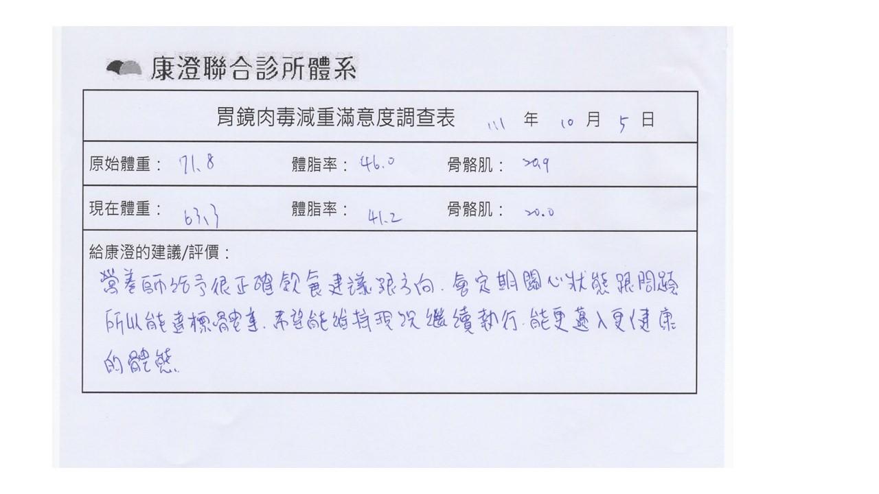 「很開心做了胃肉毒減重療程,讓我體會最幸福不挨餓的減肥方式!瘦了10%體重後,讓體態變美,最重要是身體變健康喔!感謝羅醫師及營養師的提醒及追蹤。」