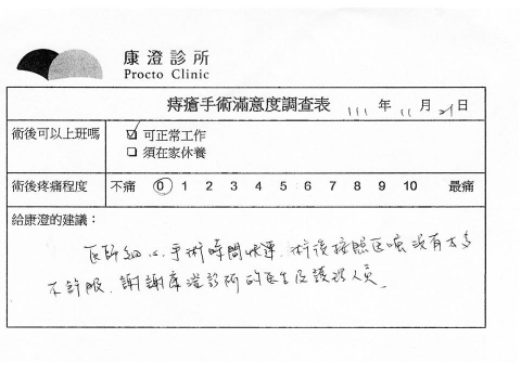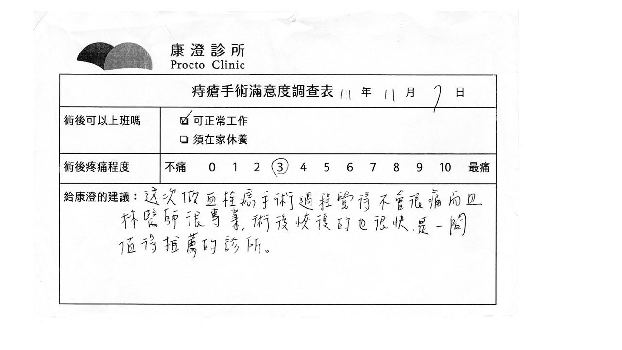 「困擾了20多年的三期內痔,終於在幾天內就解決了,原以為會很疼痛的手術及復原過程,結果真是神奇啊!不會痛呢!長效針應該是有用的,前幾天主要是腫脹,感謝林醫師,以及術後時時電話關心的小護士們,很棒!」