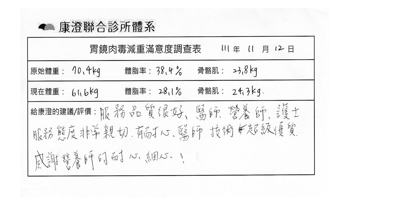 「很開心做了胃肉毒減重療程,讓我體會最幸福不挨餓的減肥方式!瘦了10%體重後,讓體態變美,最重要是身體變健康喔!感謝羅醫師及營養師的提醒及追蹤。」
