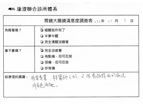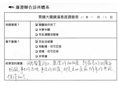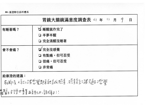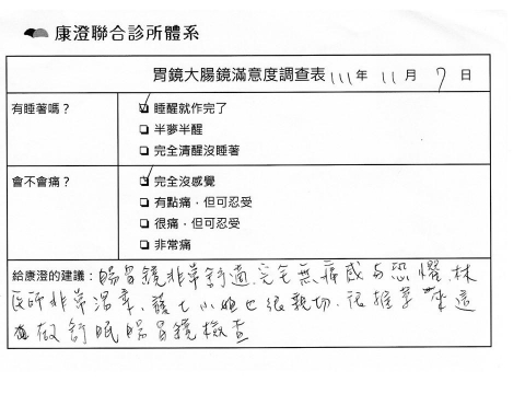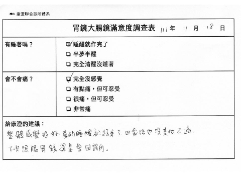 「定期穩定在櫃診所健檢,腸胃鏡的檢查醫療團隊及護理人員後續衛教的處理不輸醫院等級ㆍ專業丶舒適丶安心,整個療程無痛,護理人員親切可降低檢查的緊張感,非常感謝!」