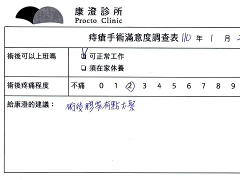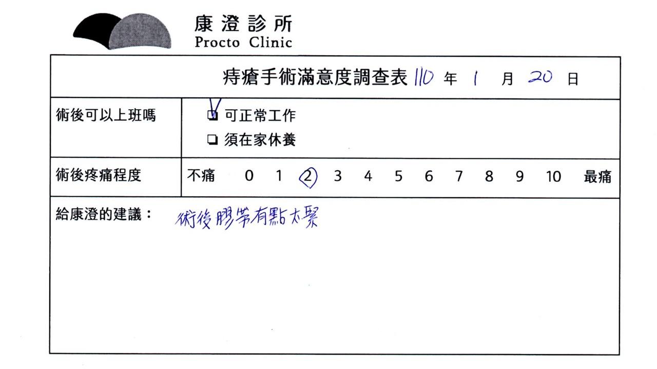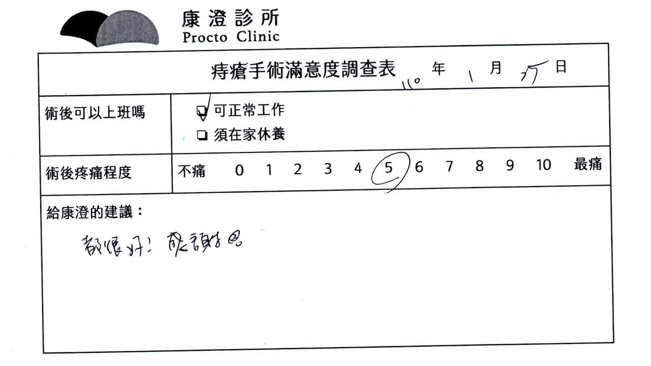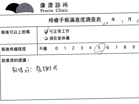「困擾了20多年的三期內痔,終於在幾天內就解決了,原以為會很疼痛的手術及復原過程,結果真是神奇啊!不會痛呢!長效針應該是有用的,前幾天主要是腫脹,感謝林醫師,以及術後時時電話關心的小護士們,很棒!」