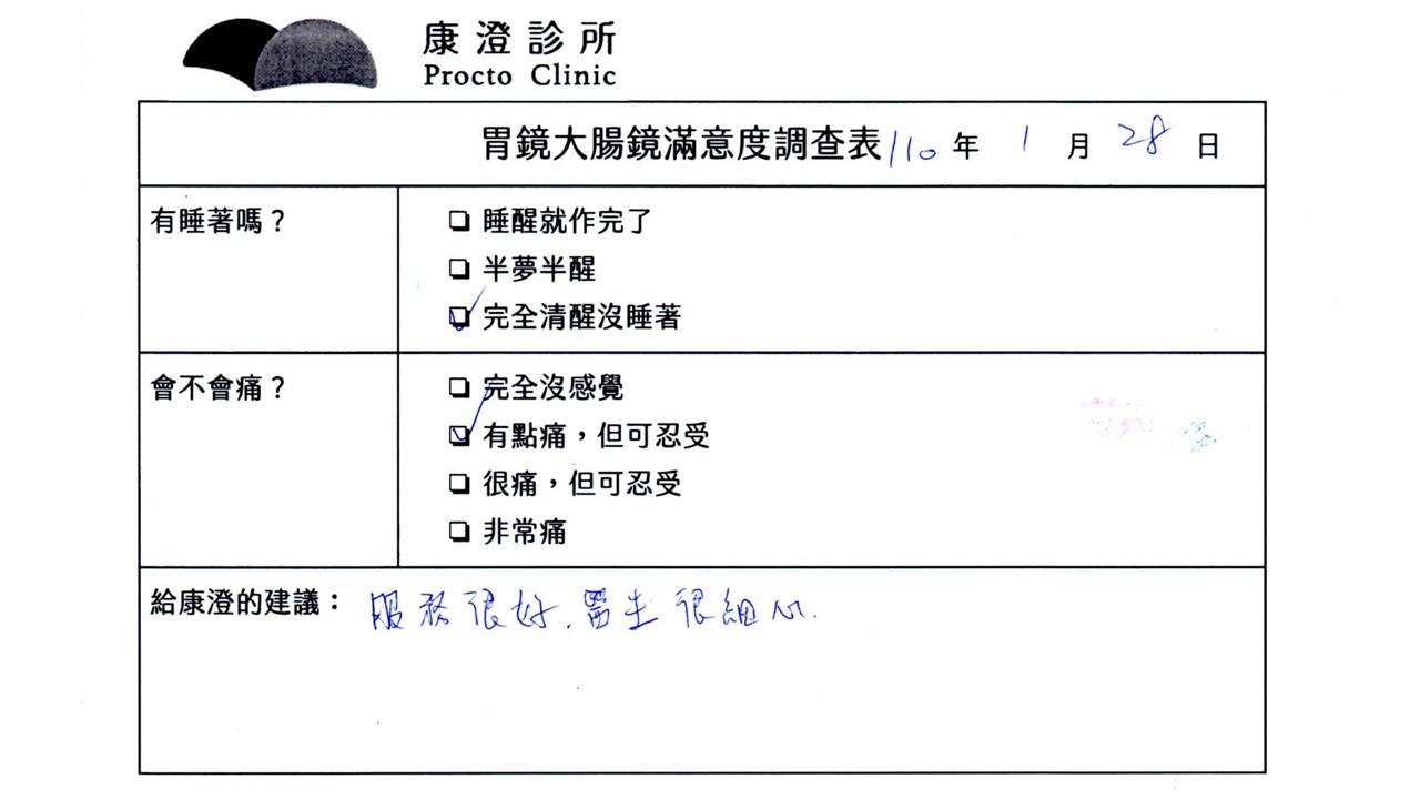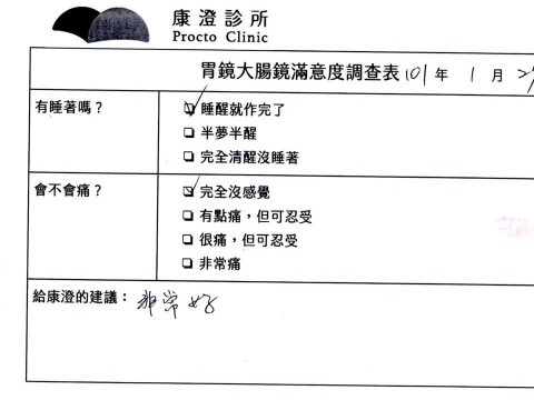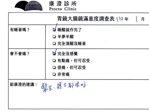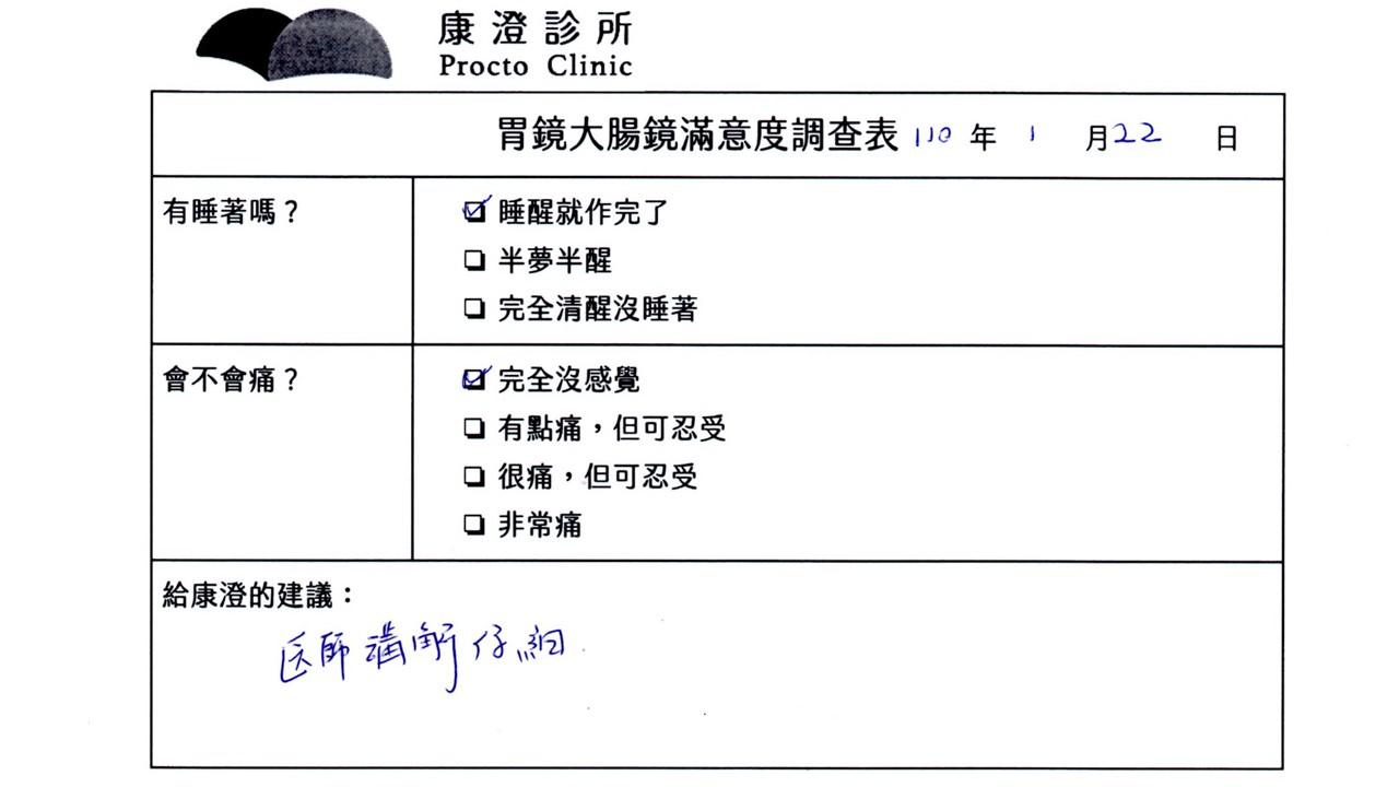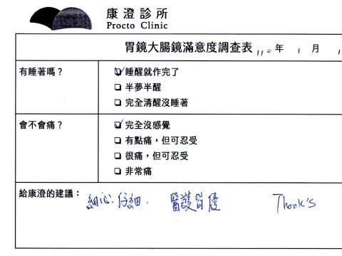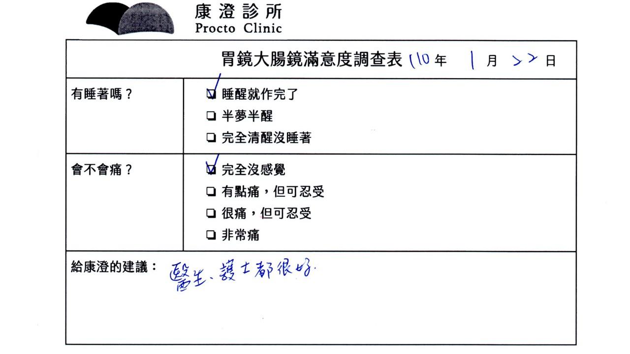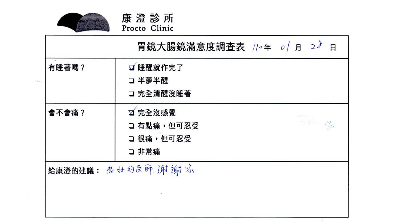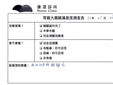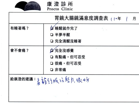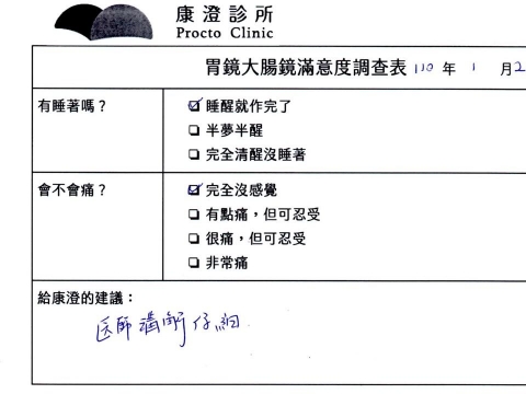 「定期穩定在櫃診所健檢,腸胃鏡的檢查醫療團隊及護理人員後續衛教的處理不輸醫院等級ㆍ專業丶舒適丶安心,整個療程無痛,護理人員親切可降低檢查的緊張感,非常感謝!」