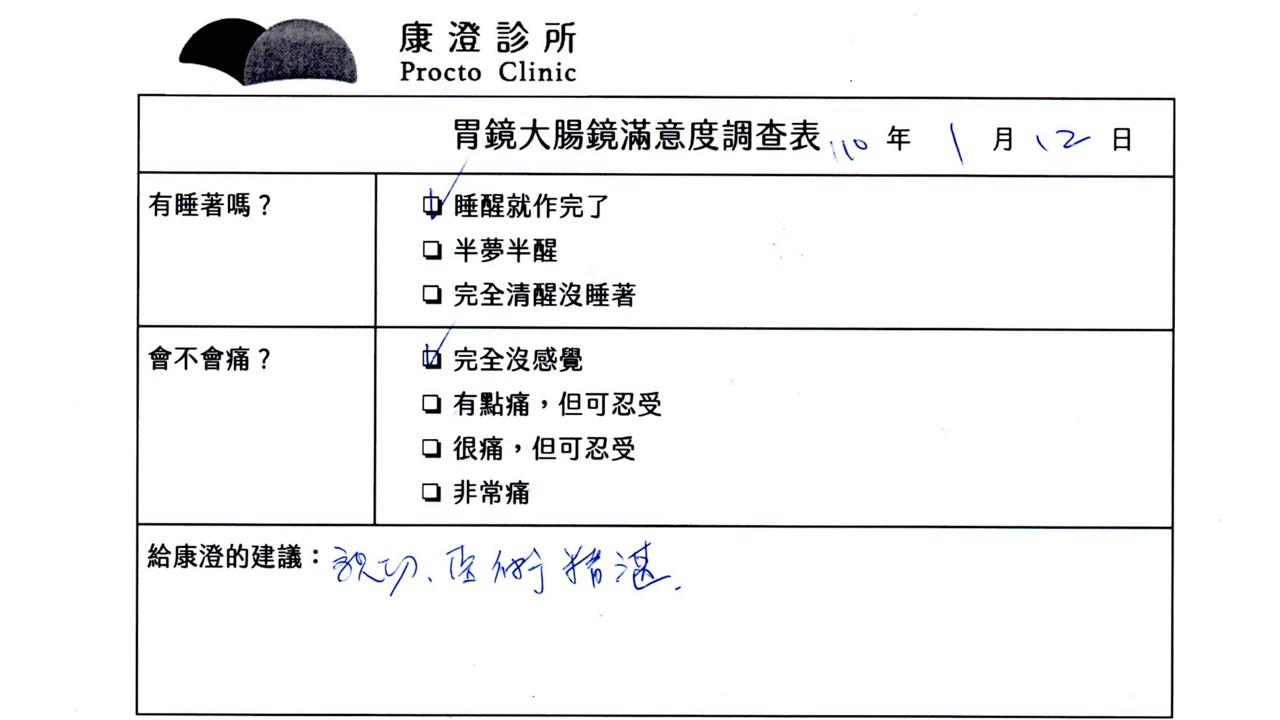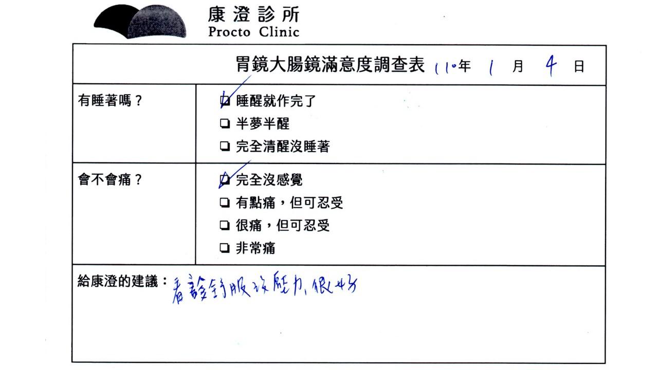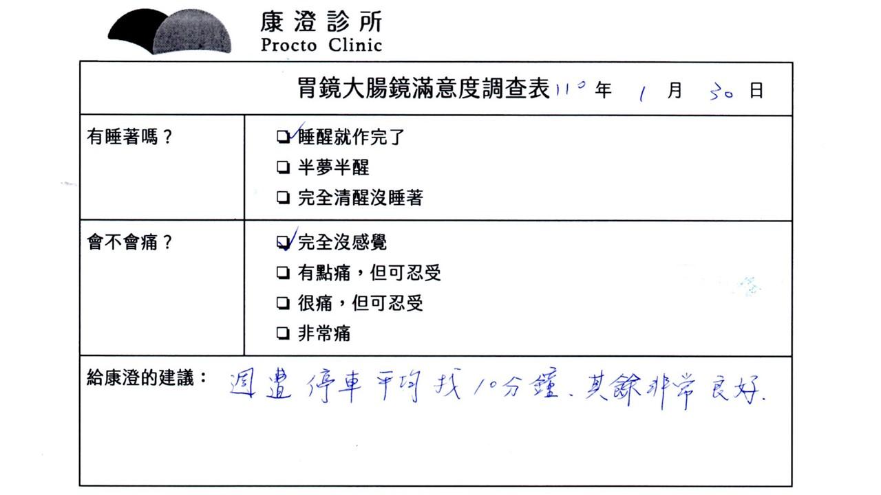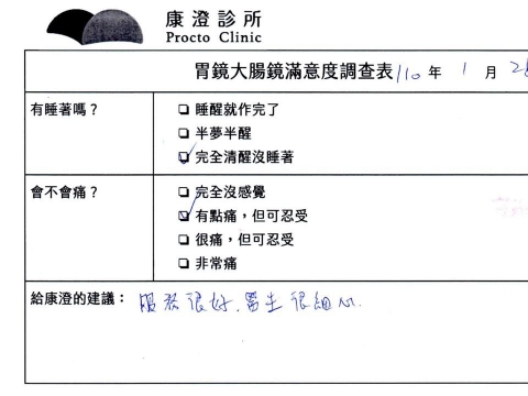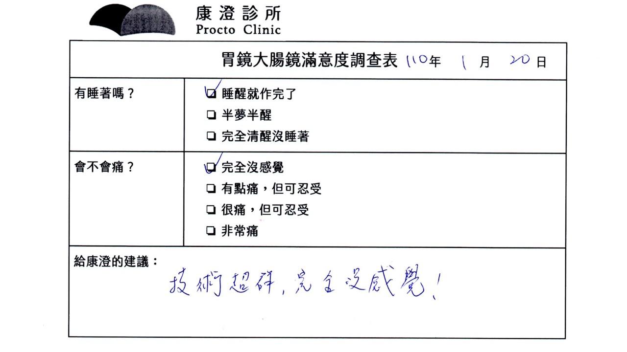 「定期穩定在櫃診所健檢,腸胃鏡的檢查醫療團隊及護理人員後續衛教的處理不輸醫院等級ㆍ專業丶舒適丶安心,整個療程無痛,護理人員親切可降低檢查的緊張感,非常感謝!」