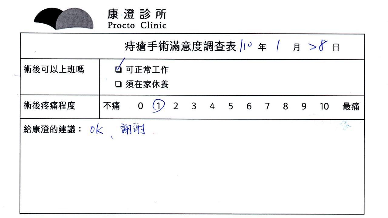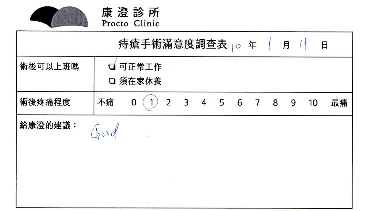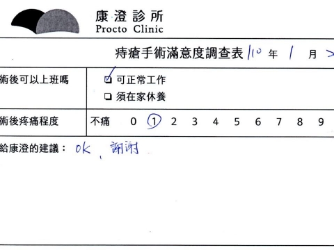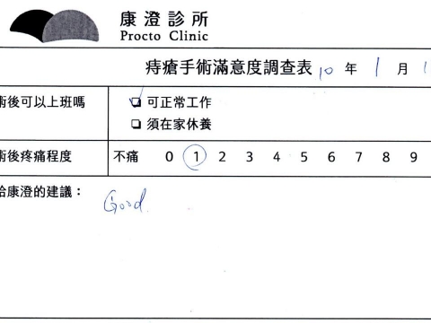 「困擾了20多年的三期內痔,終於在幾天內就解決了,原以為會很疼痛的手術及復原過程,結果真是神奇啊!不會痛呢!長效針應該是有用的,前幾天主要是腫脹,感謝林醫師,以及術後時時電話關心的小護士們,很棒!」