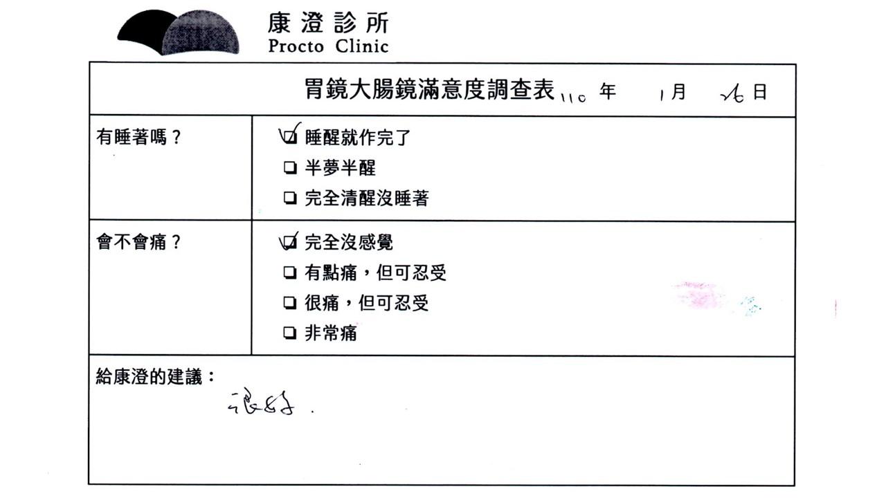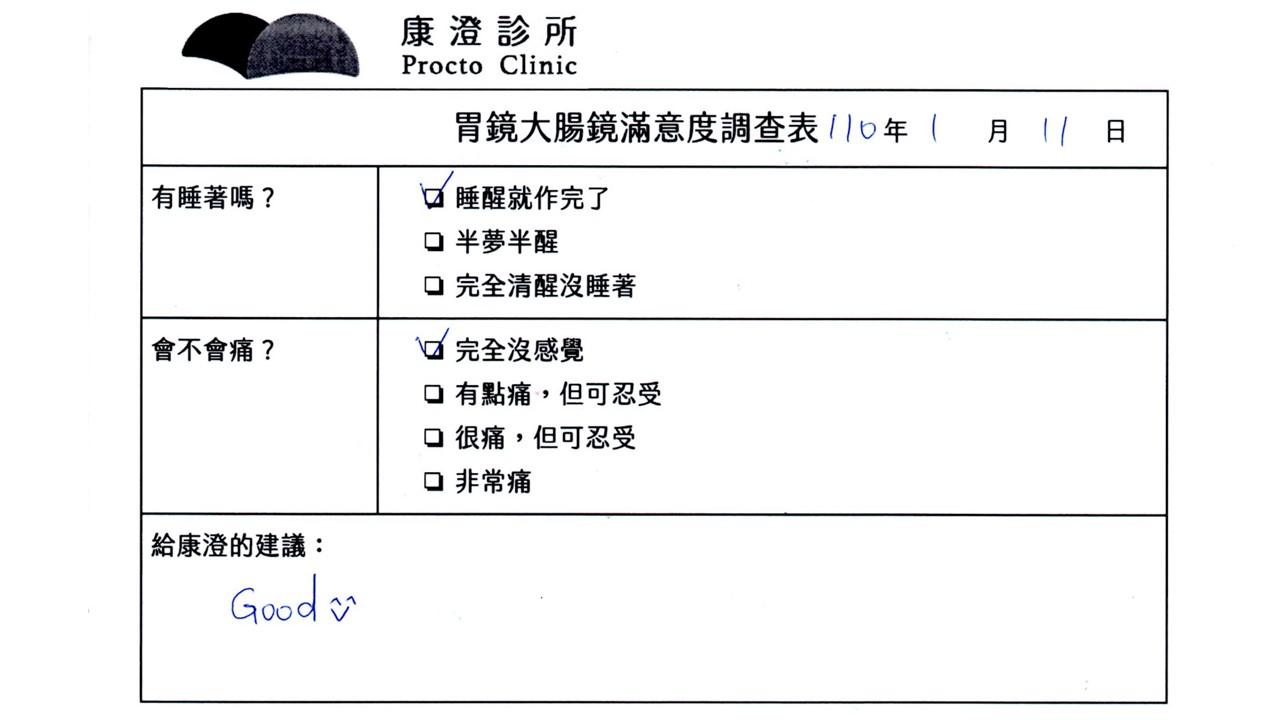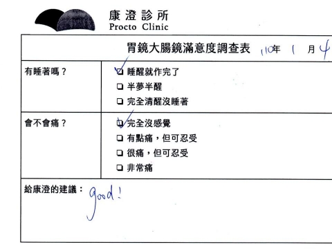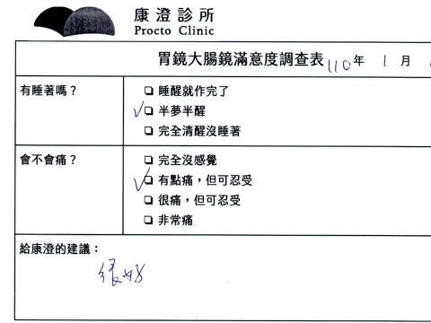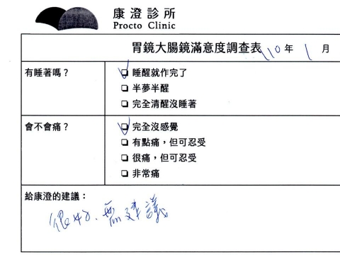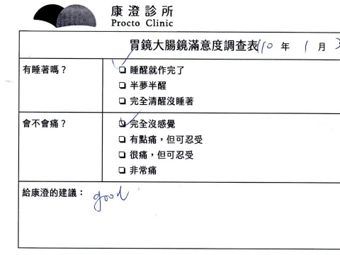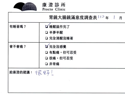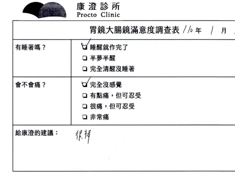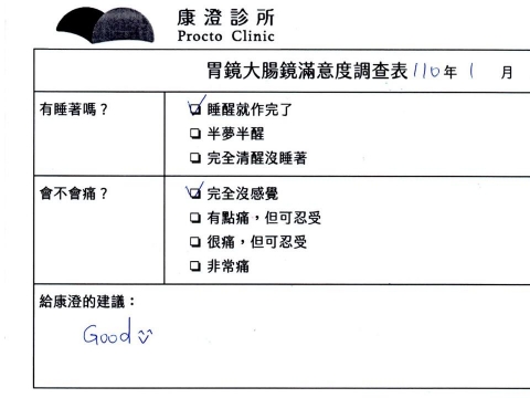 「定期穩定在櫃診所健檢,腸胃鏡的檢查醫療團隊及護理人員後續衛教的處理不輸醫院等級ㆍ專業丶舒適丶安心,整個療程無痛,護理人員親切可降低檢查的緊張感,非常感謝!」