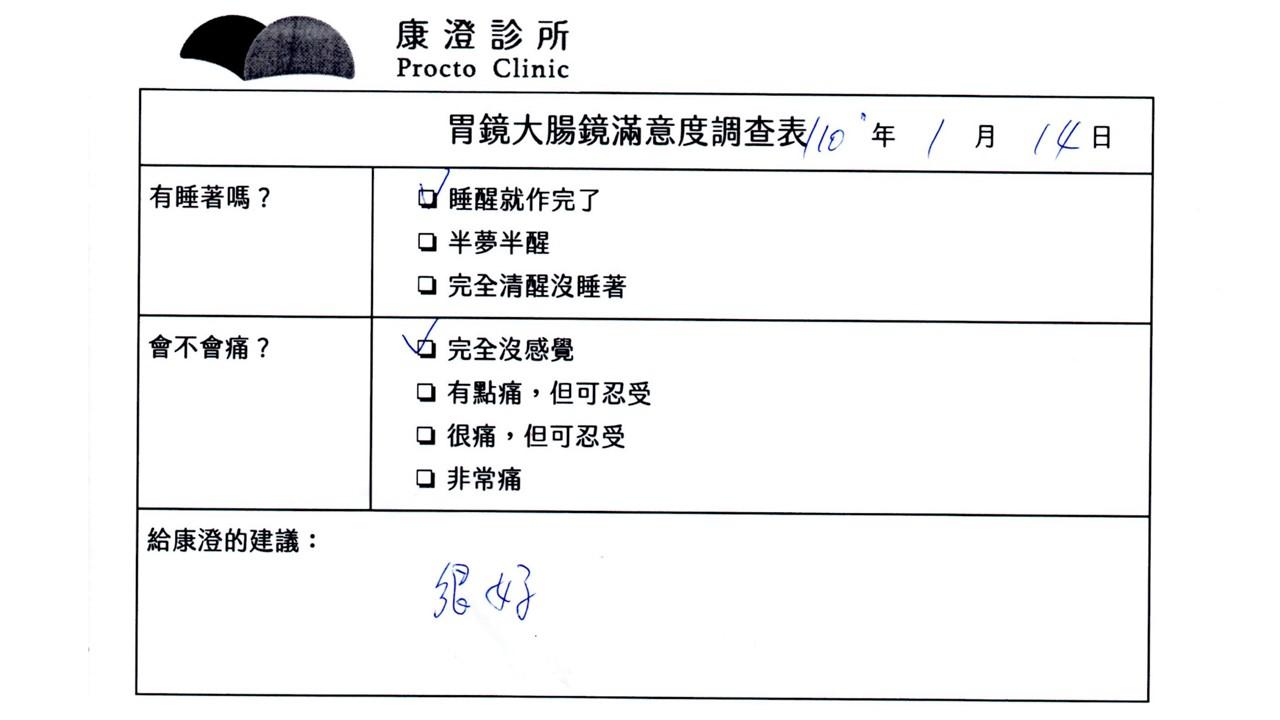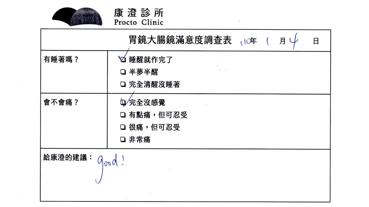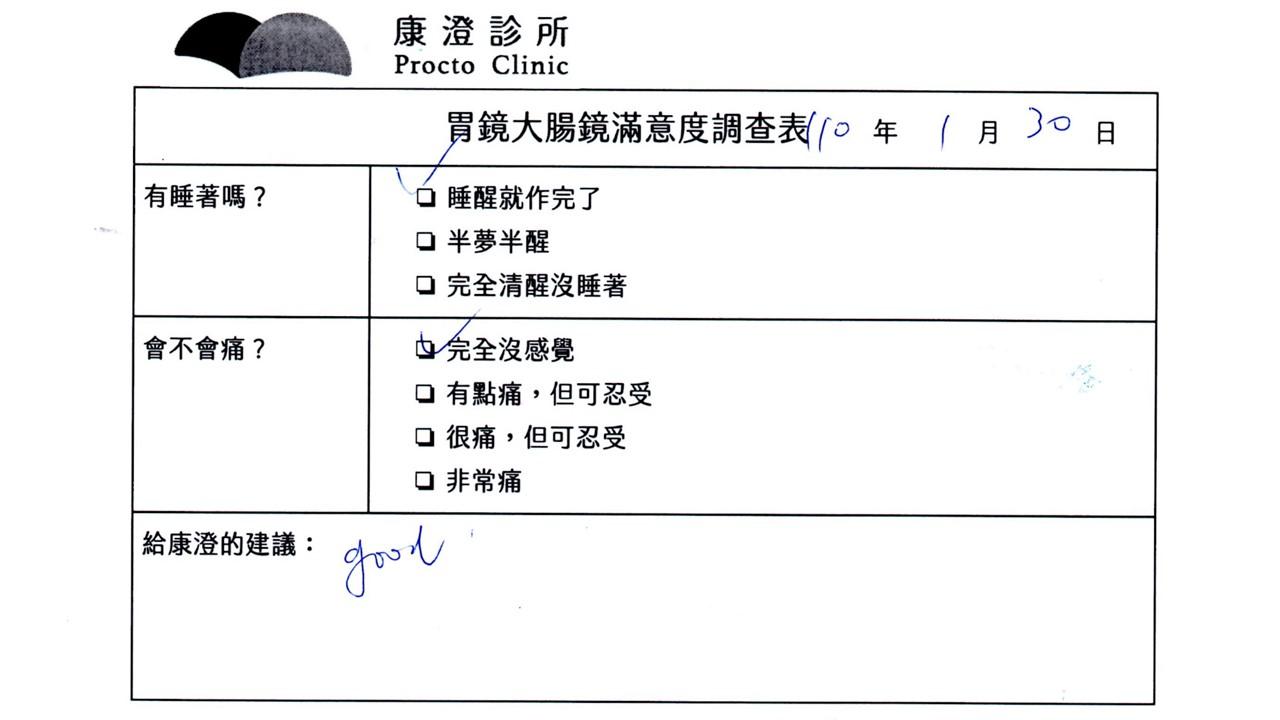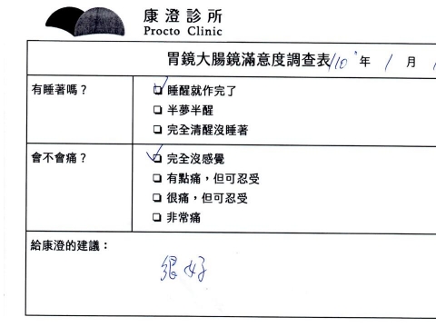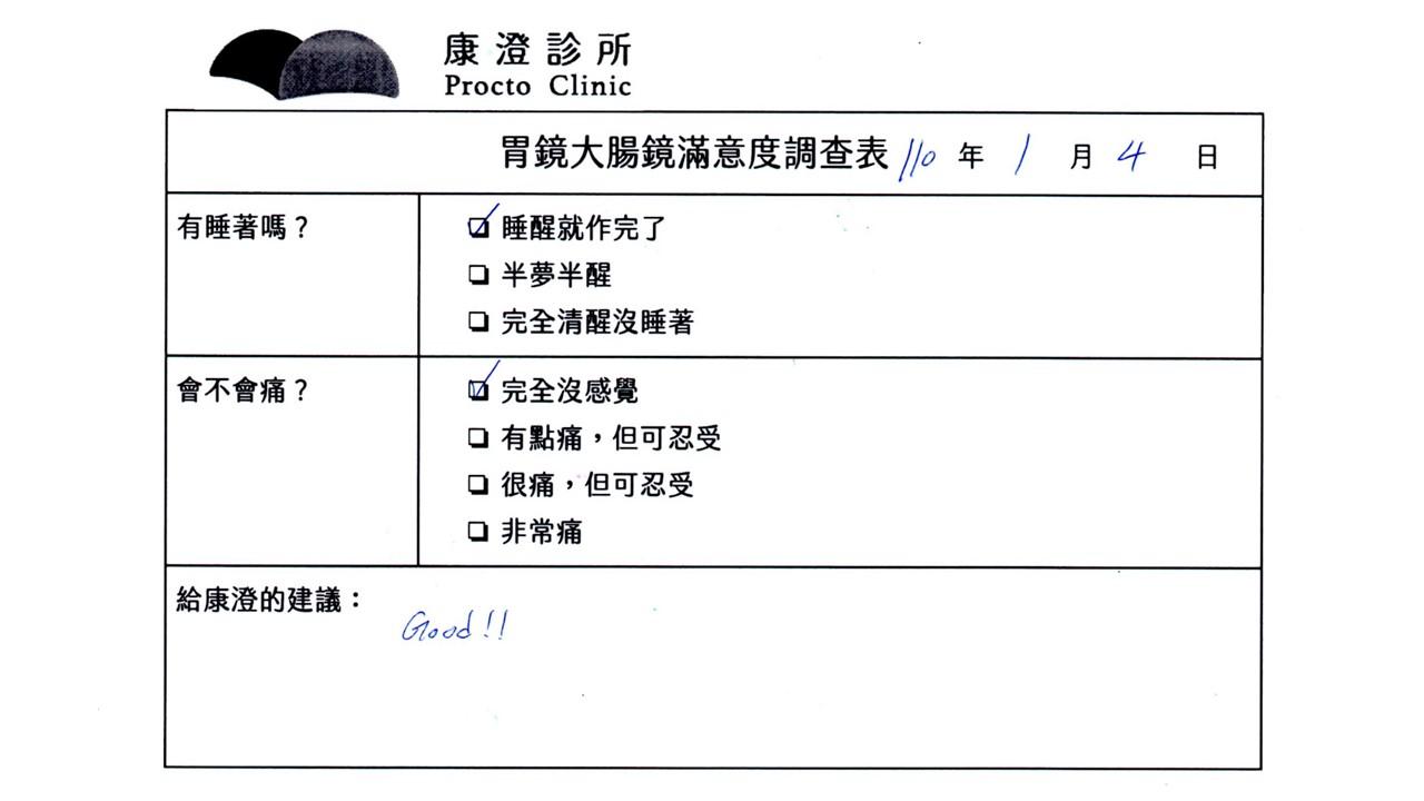 「定期穩定在櫃診所健檢,腸胃鏡的檢查醫療團隊及護理人員後續衛教的處理不輸醫院等級ㆍ專業丶舒適丶安心,整個療程無痛,護理人員親切可降低檢查的緊張感,非常感謝!」