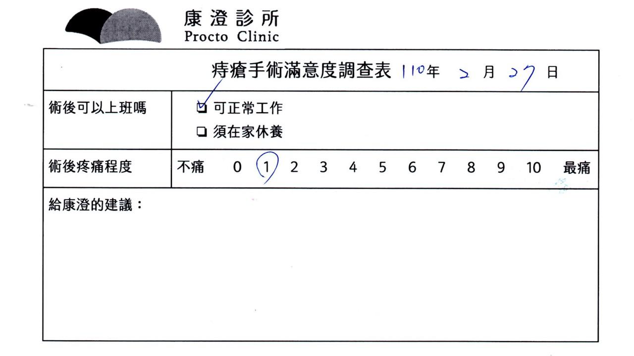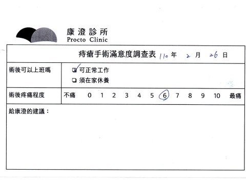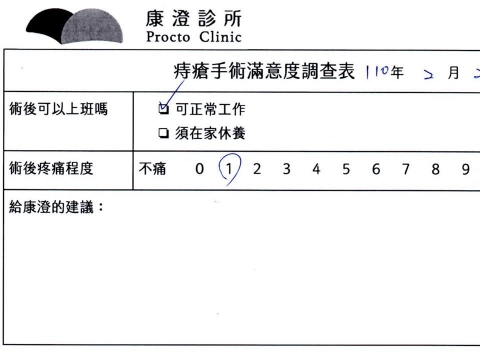 「困擾了20多年的三期內痔,終於在幾天內就解決了,原以為會很疼痛的手術及復原過程,結果真是神奇啊!不會痛呢!長效針應該是有用的,前幾天主要是腫脹,感謝林醫師,以及術後時時電話關心的小護士們,很棒!」