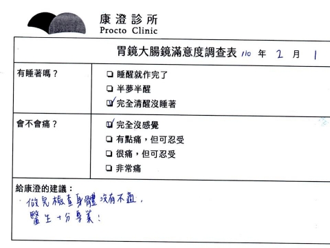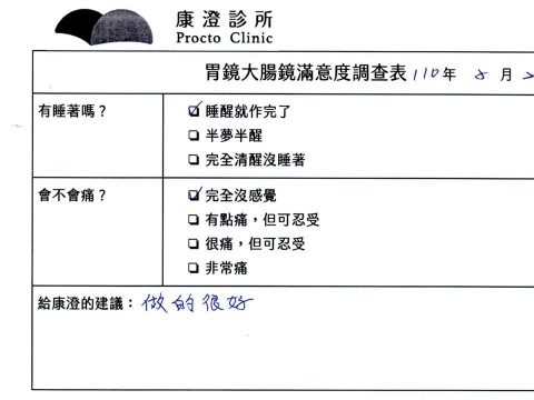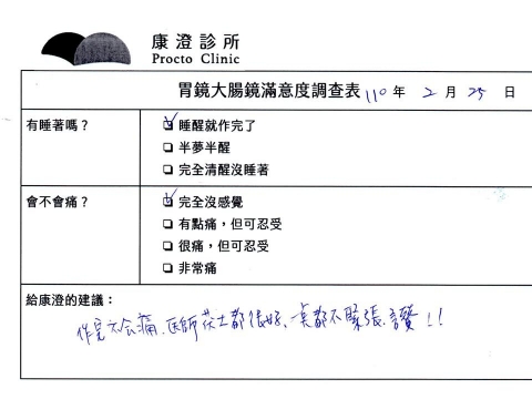 「定期穩定在櫃診所健檢,腸胃鏡的檢查醫療團隊及護理人員後續衛教的處理不輸醫院等級ㆍ專業丶舒適丶安心,整個療程無痛,護理人員親切可降低檢查的緊張感,非常感謝!」