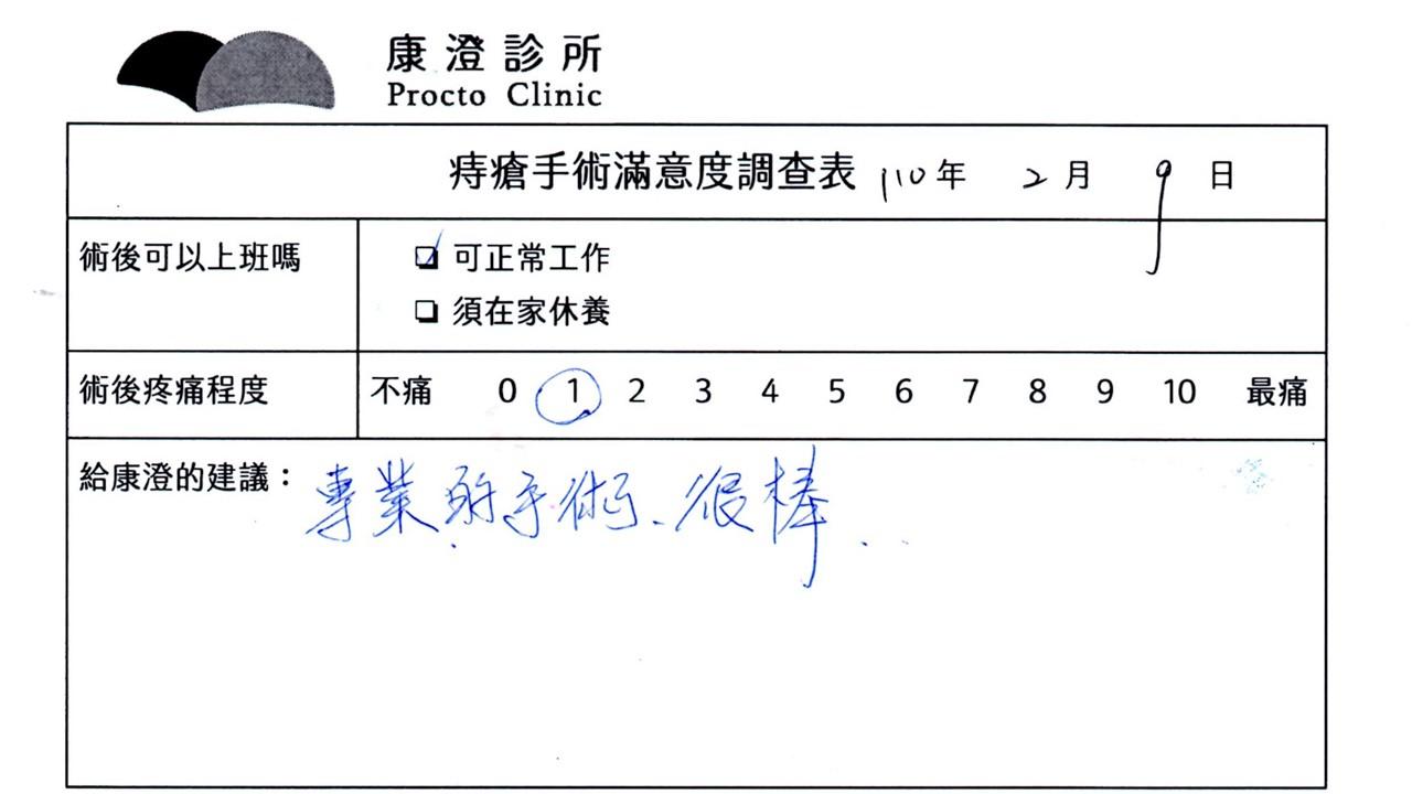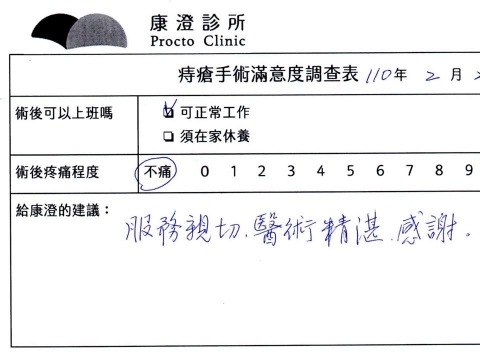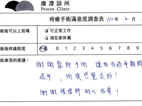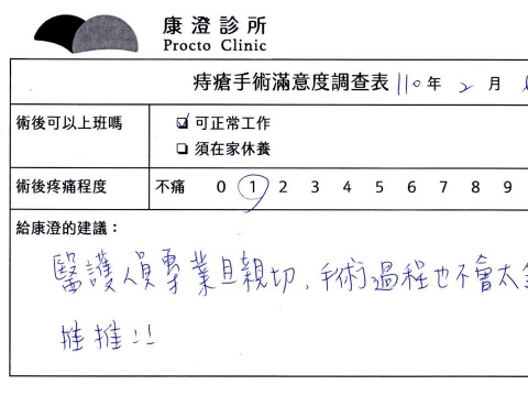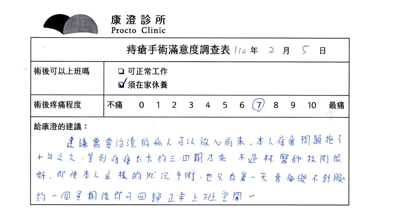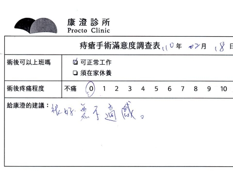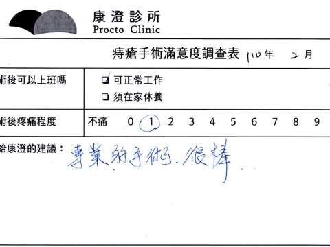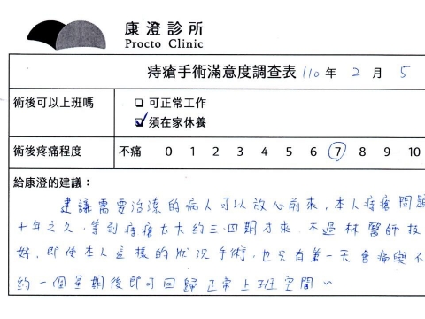 「困擾了20多年的三期內痔,終於在幾天內就解決了,原以為會很疼痛的手術及復原過程,結果真是神奇啊!不會痛呢!長效針應該是有用的,前幾天主要是腫脹,感謝林醫師,以及術後時時電話關心的小護士們,很棒!」
